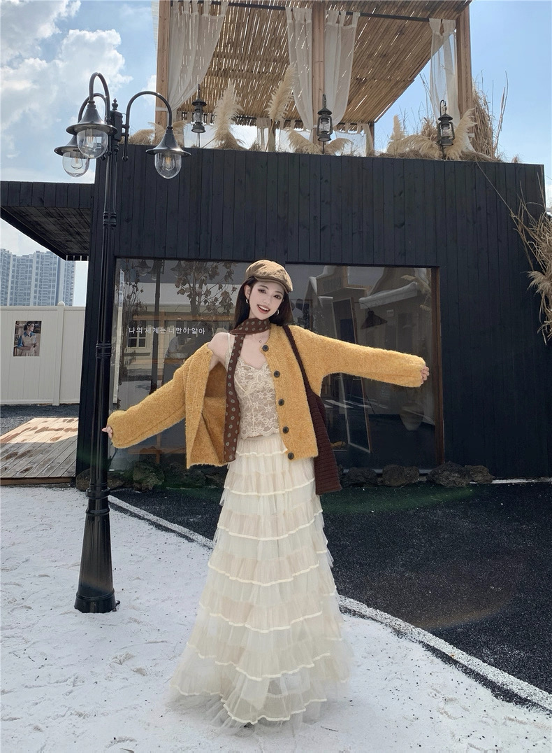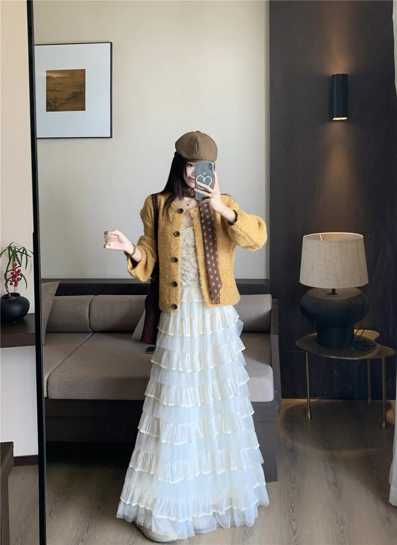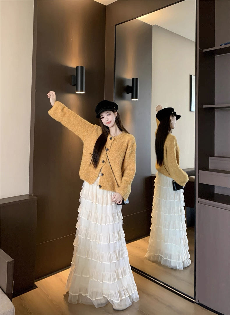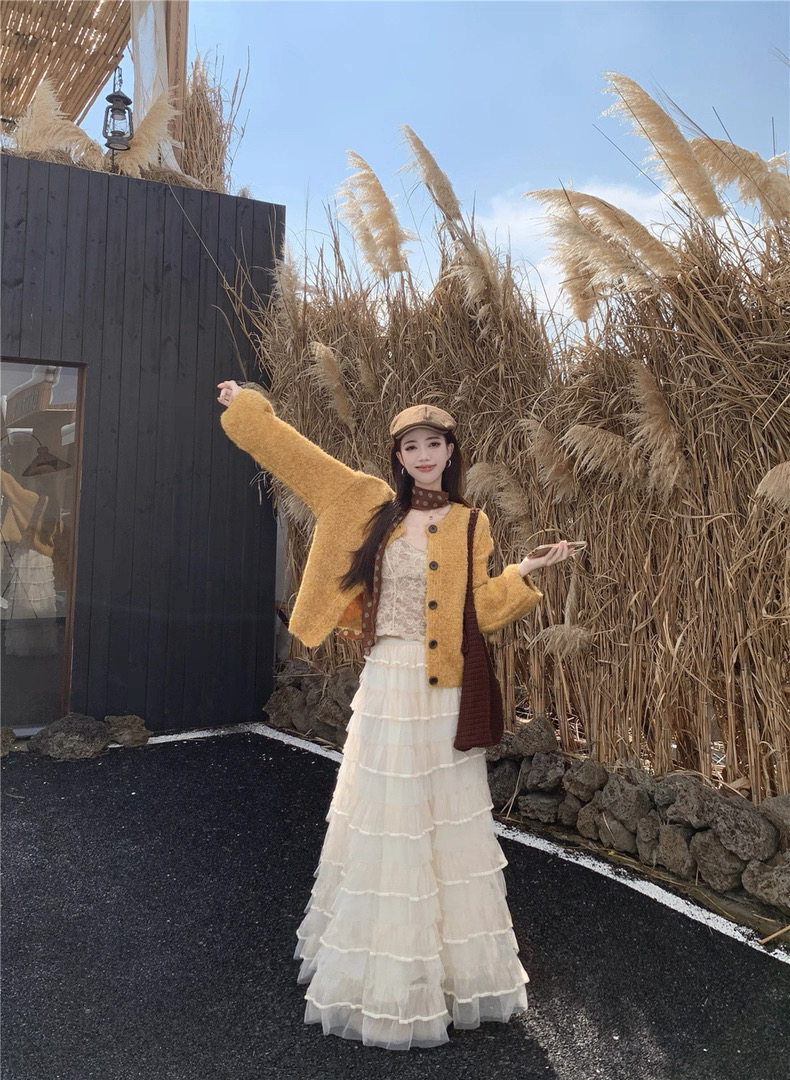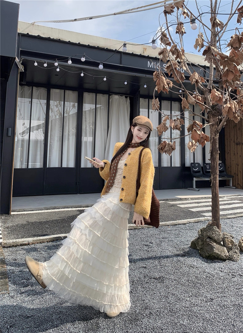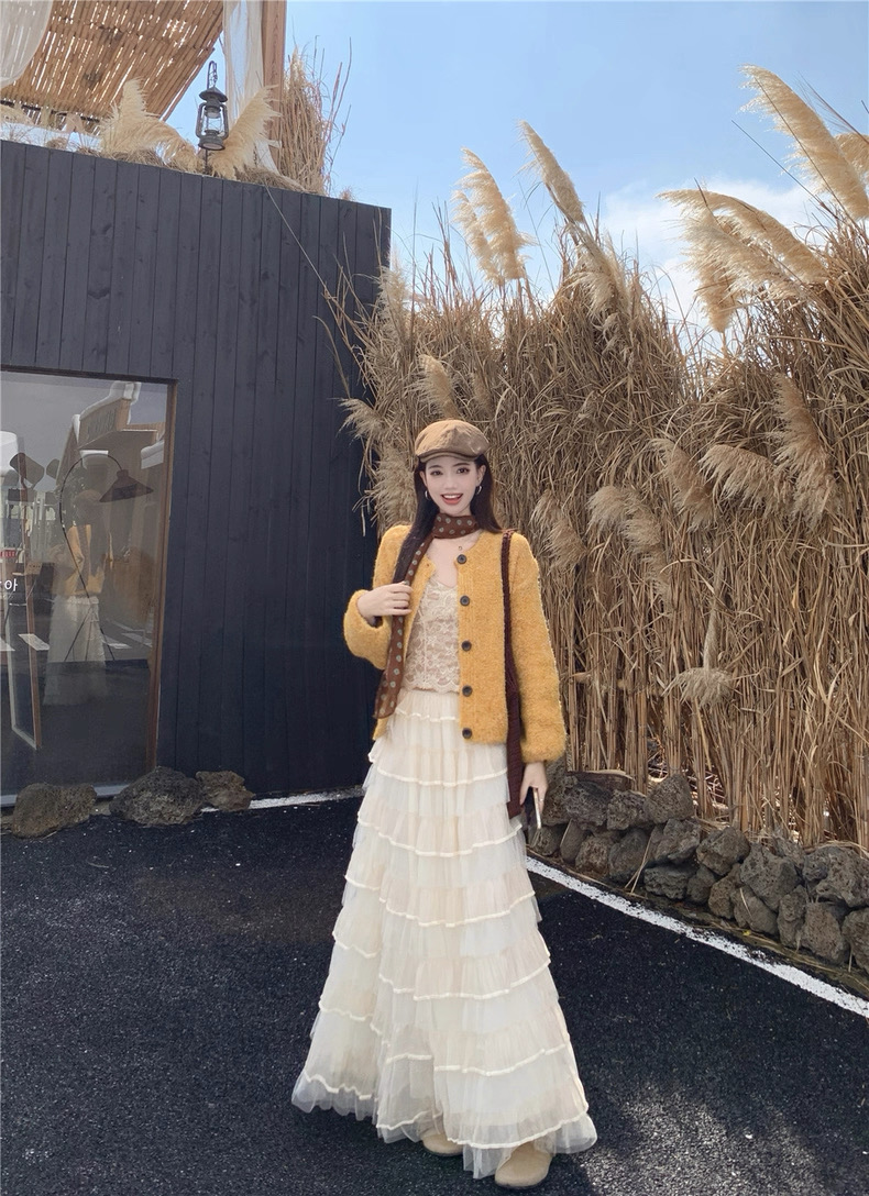 Áo cardigan lông vàng chân váy voan tầng_V03