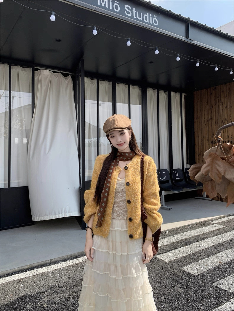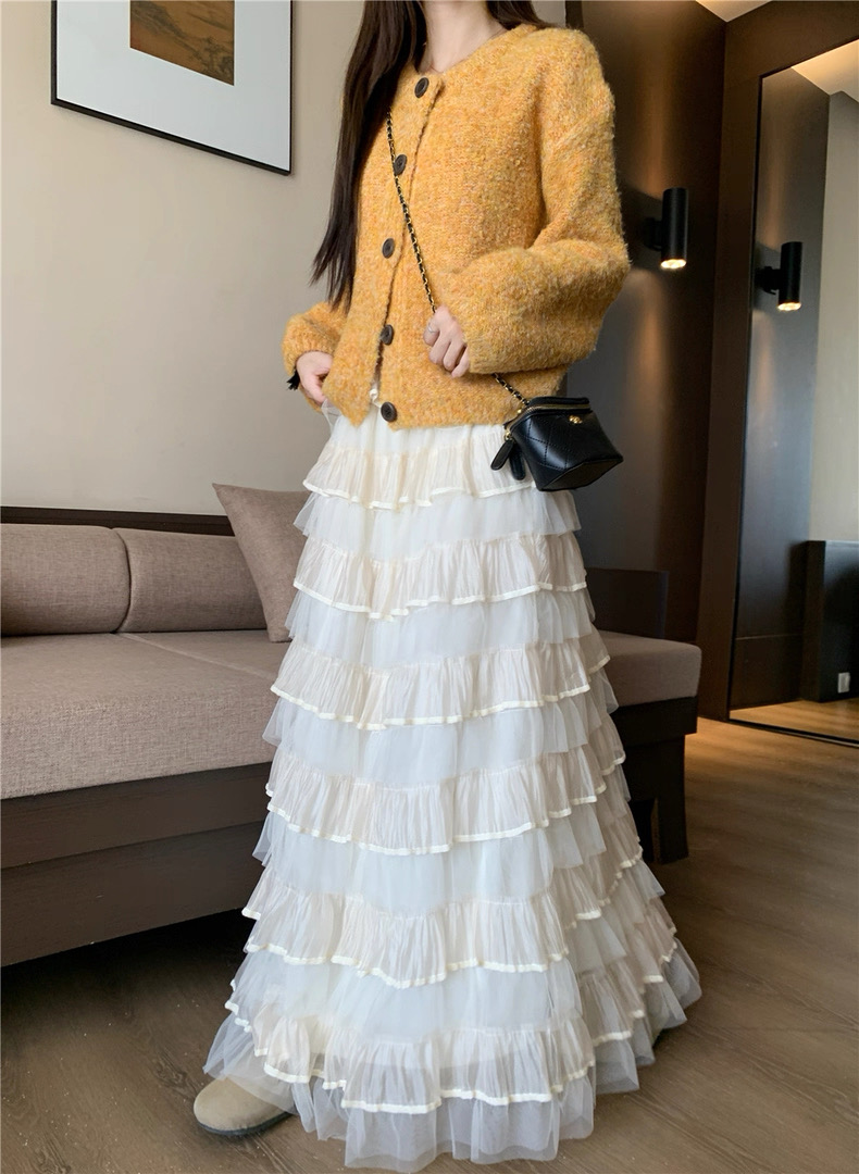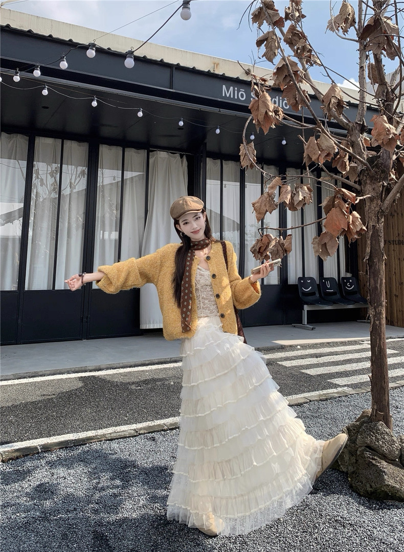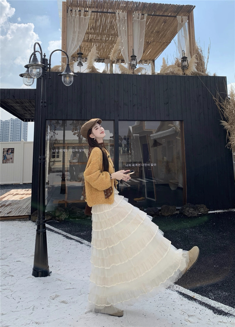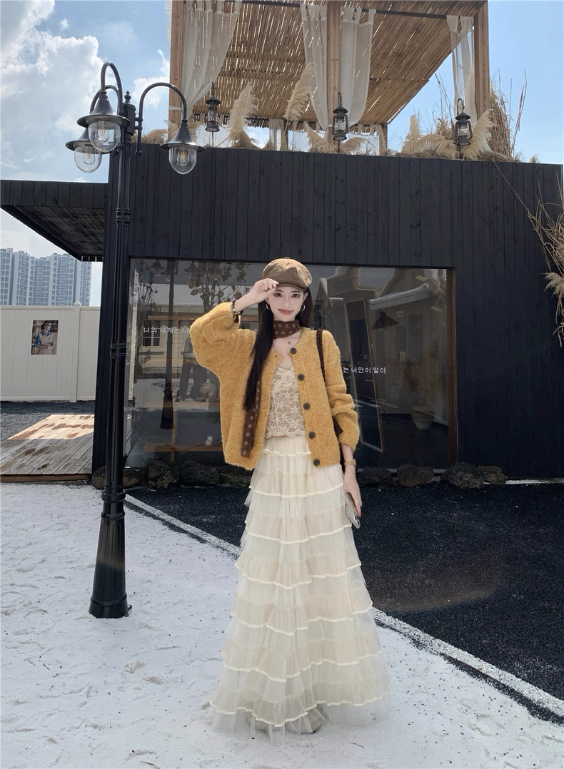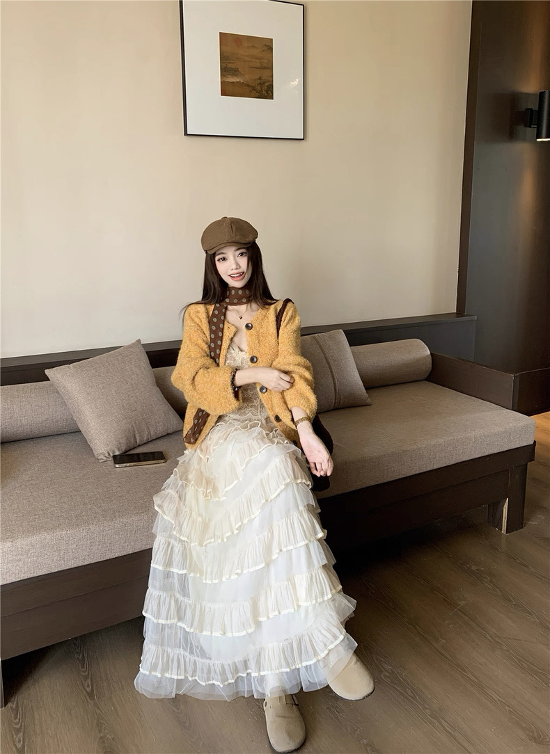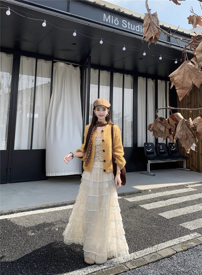 Áo cardigan lông vàng chân váy voan tầng_V03