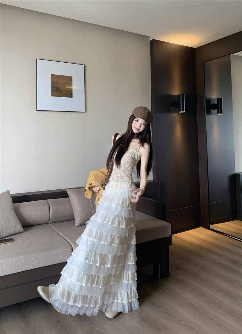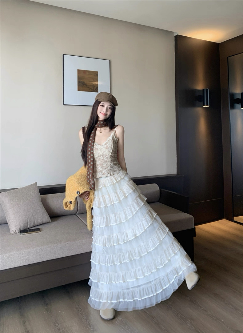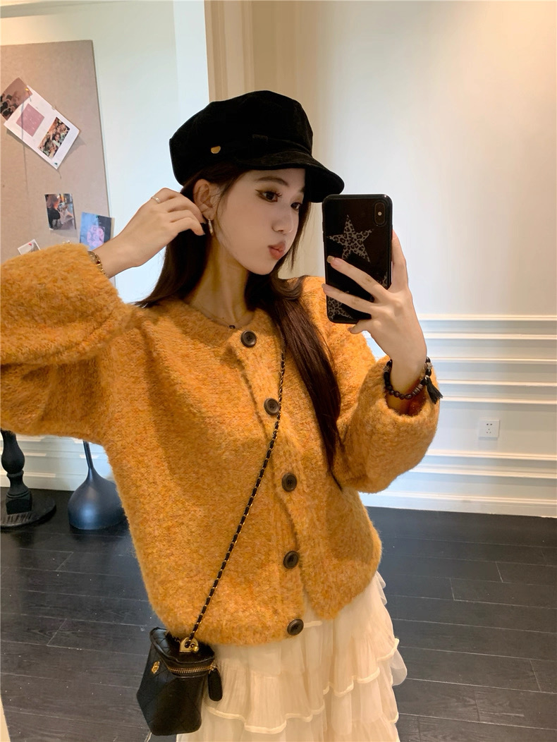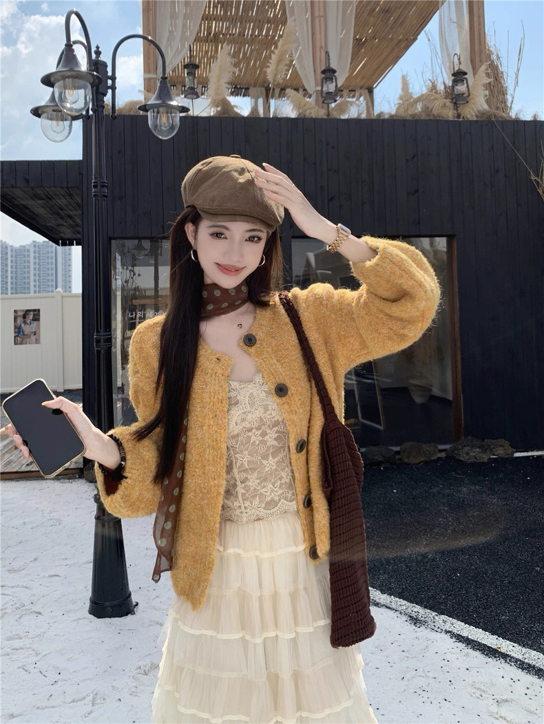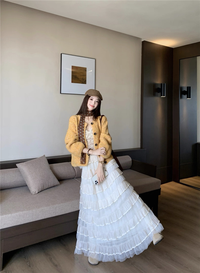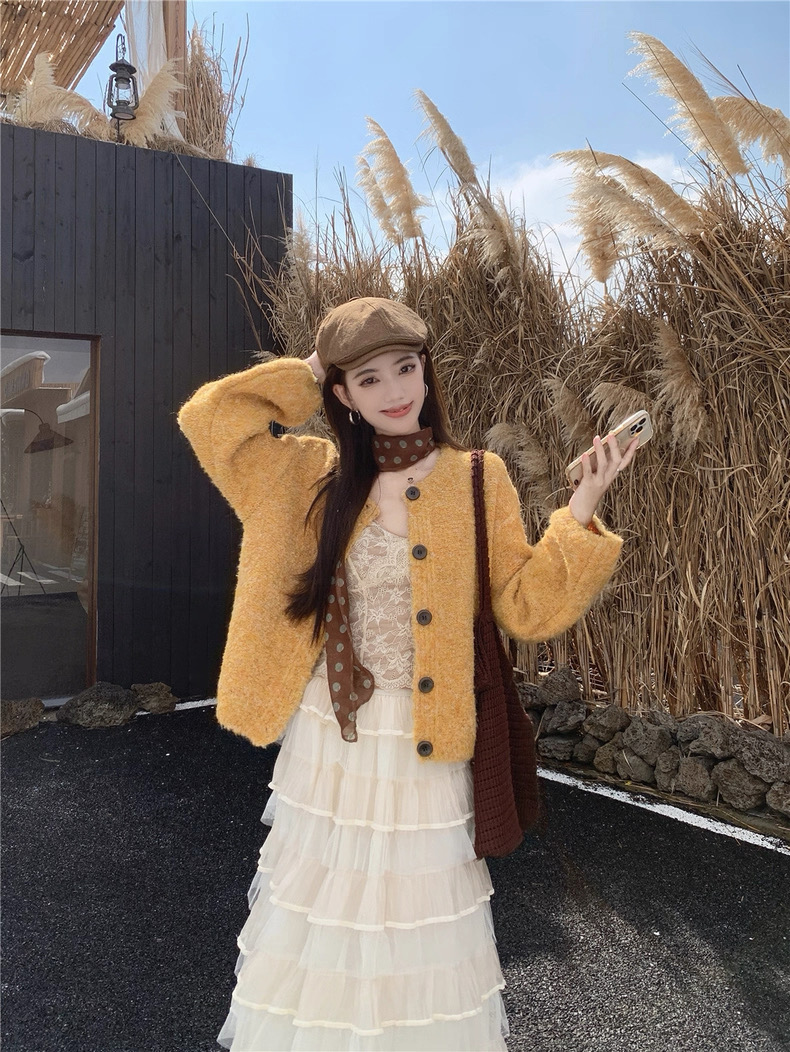 Áo cardigan lông vàng chân váy voan tầng_V03