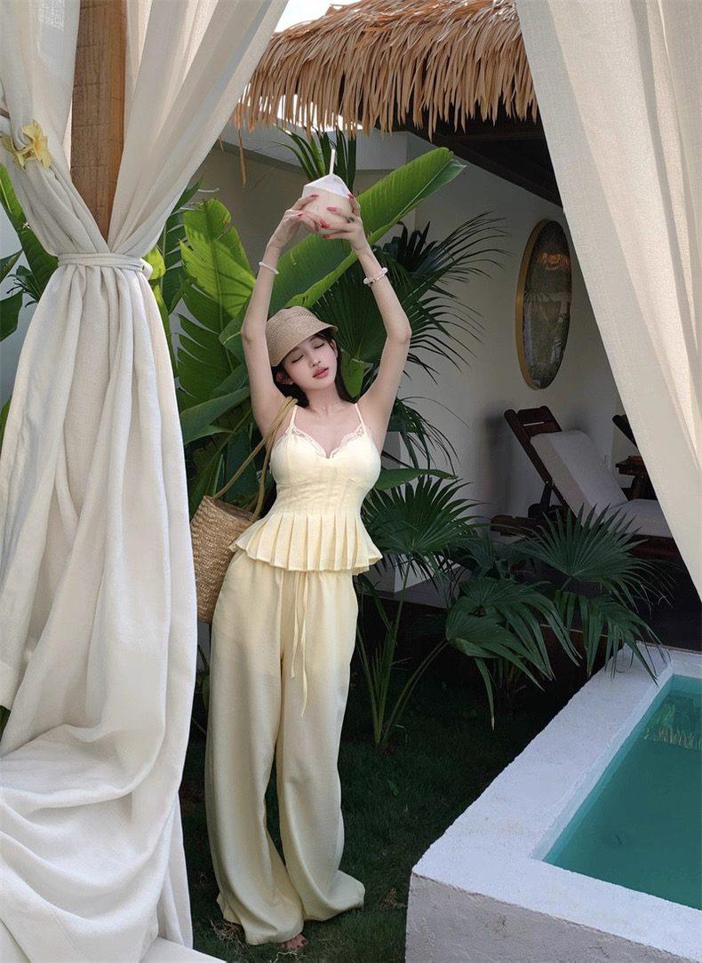 Thiết kế nhẹ nhàng với tone vàng pastel tươi tắn, mang vibe mùa hè trong trẻo. Áo hai dây ôm nhẹ kết hợp quần dài...