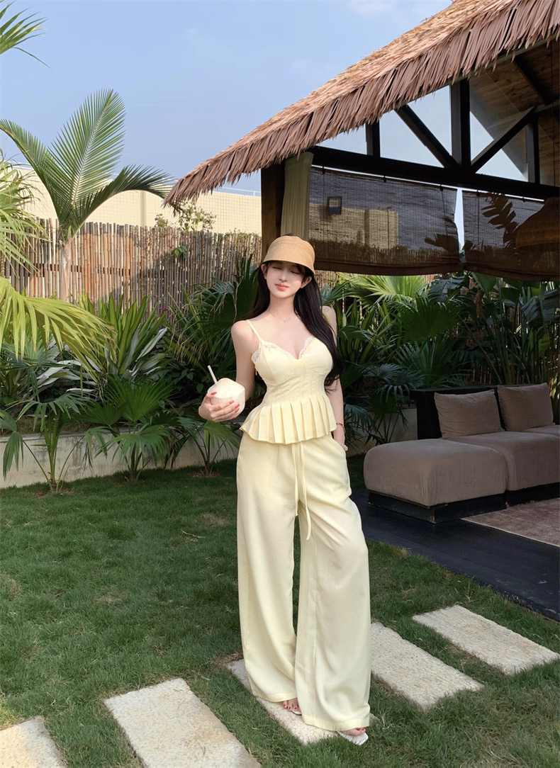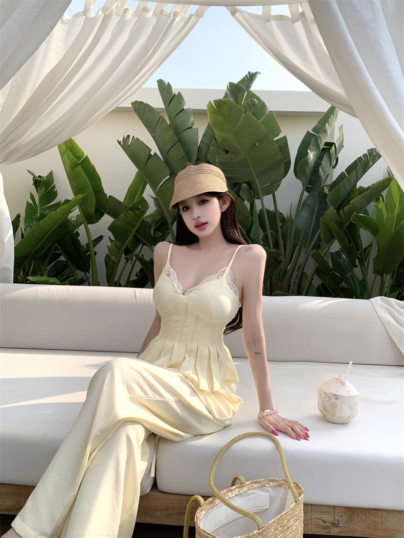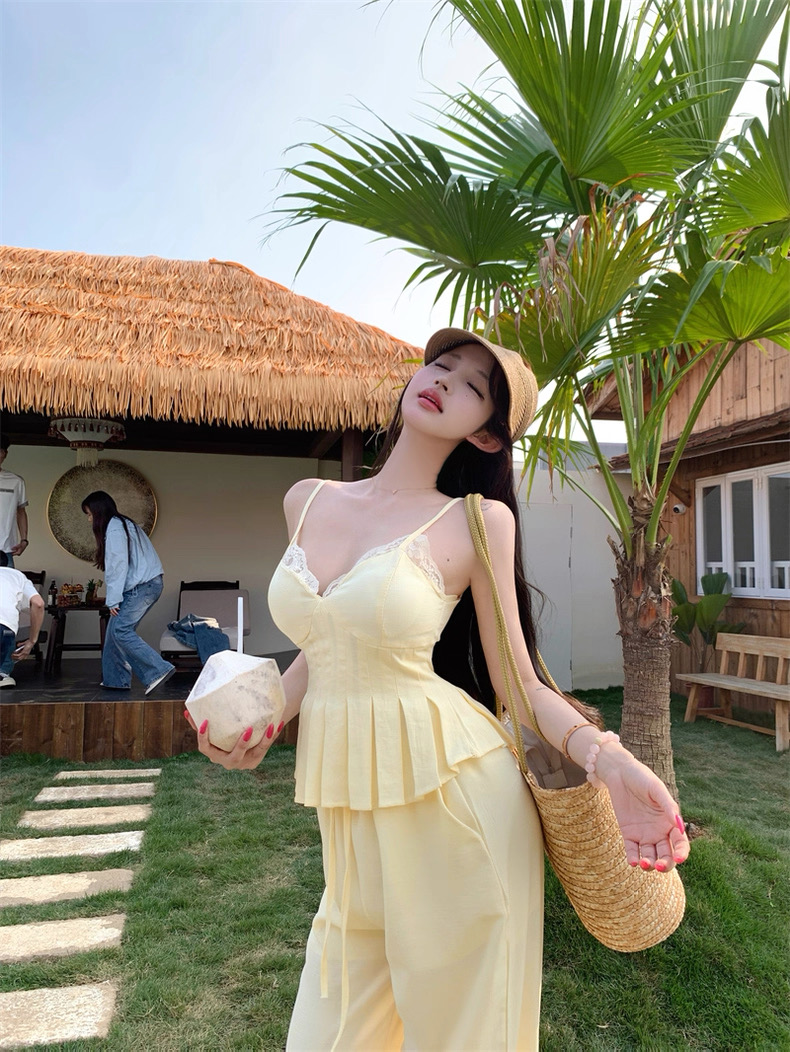 Áo hai dây phối quần vàng pastel nữ tính_E01