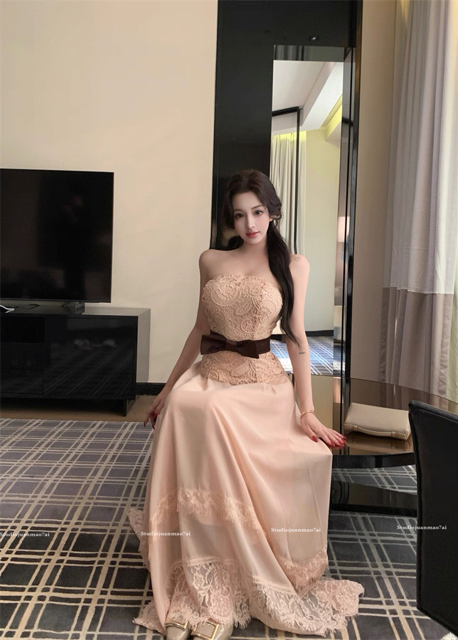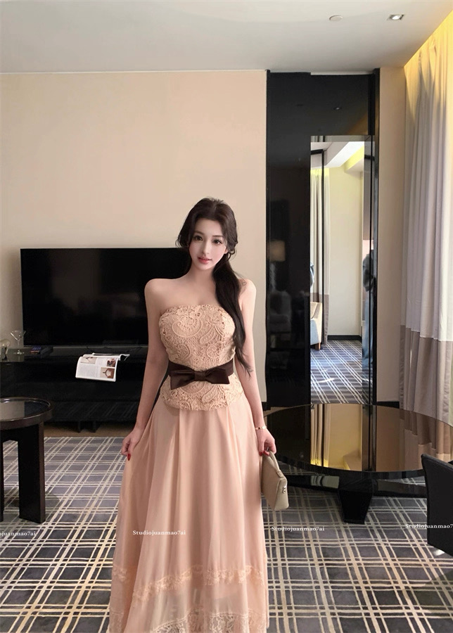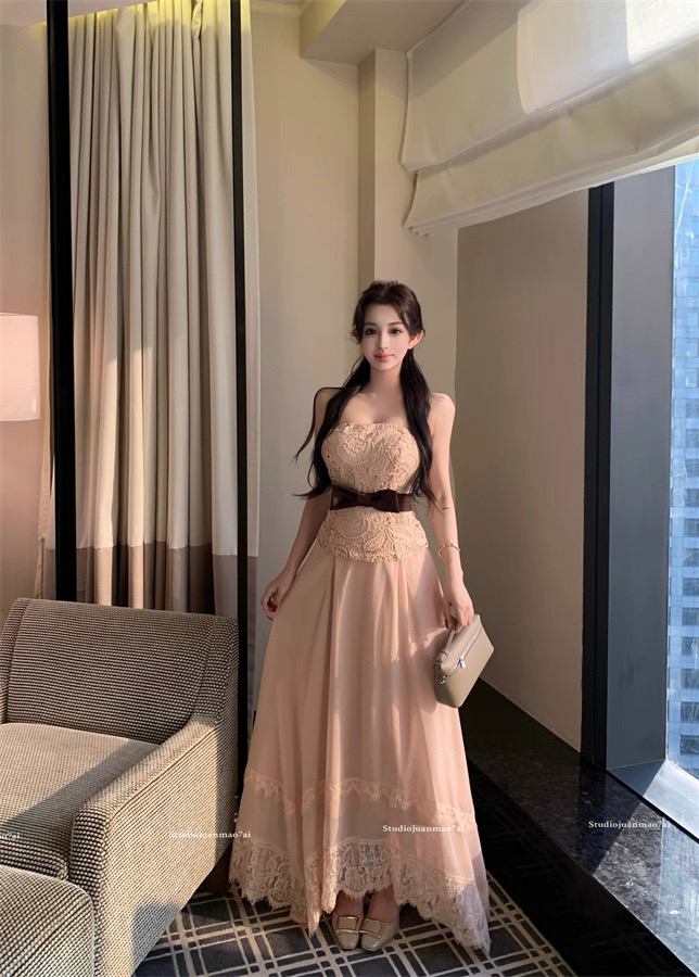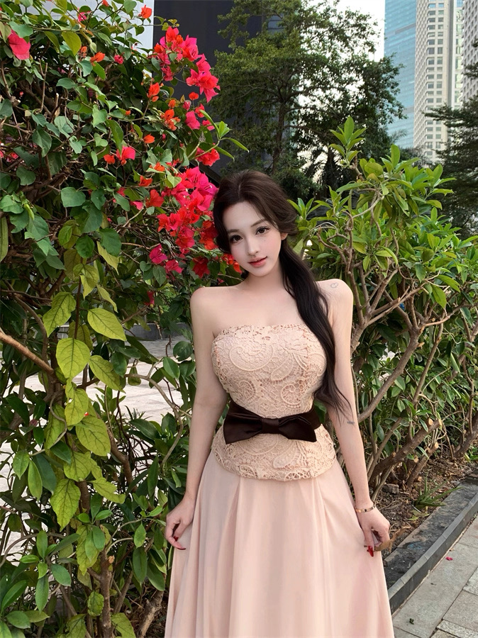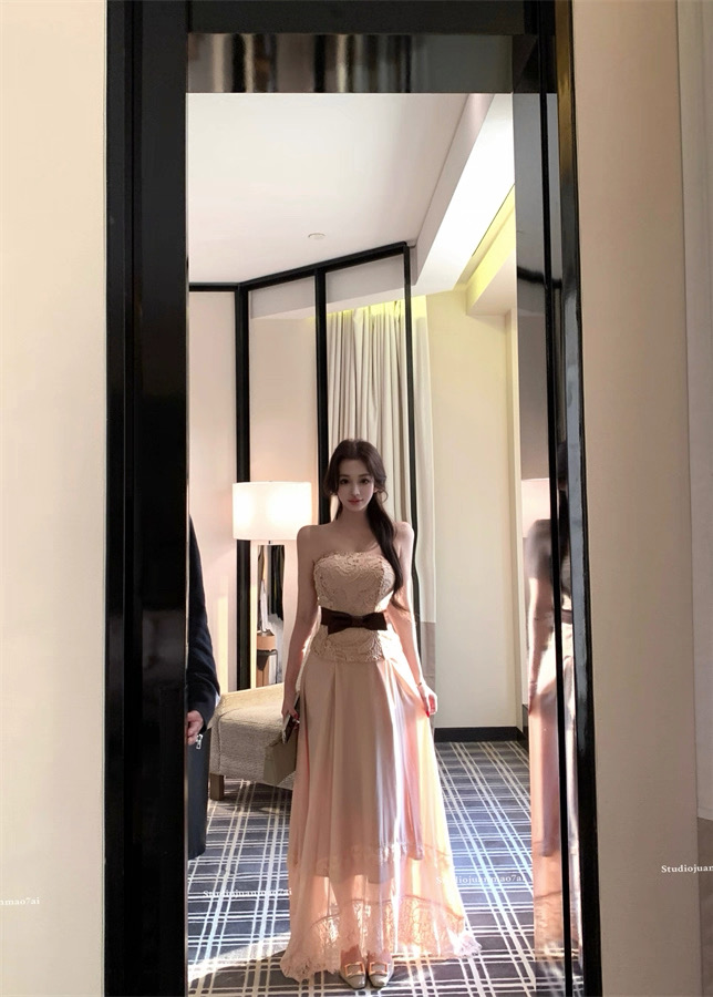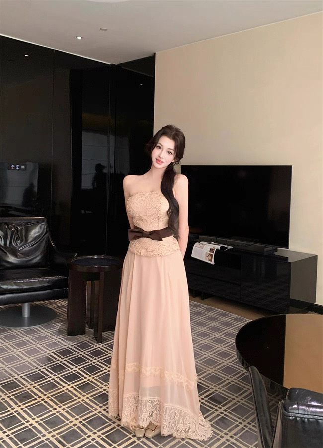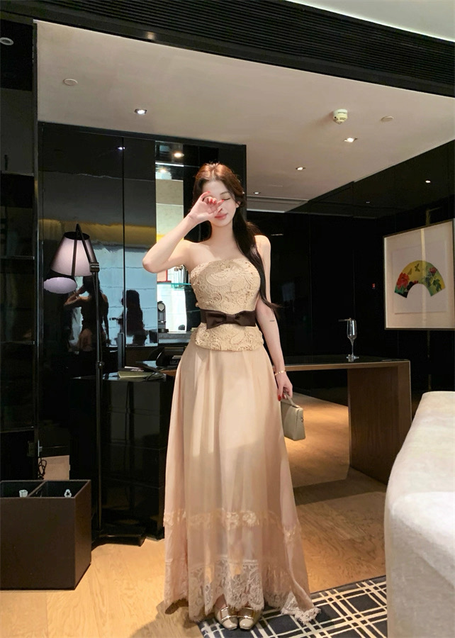 Áo ren chân váy dài thắt nơ eo tiểu thư_V33
