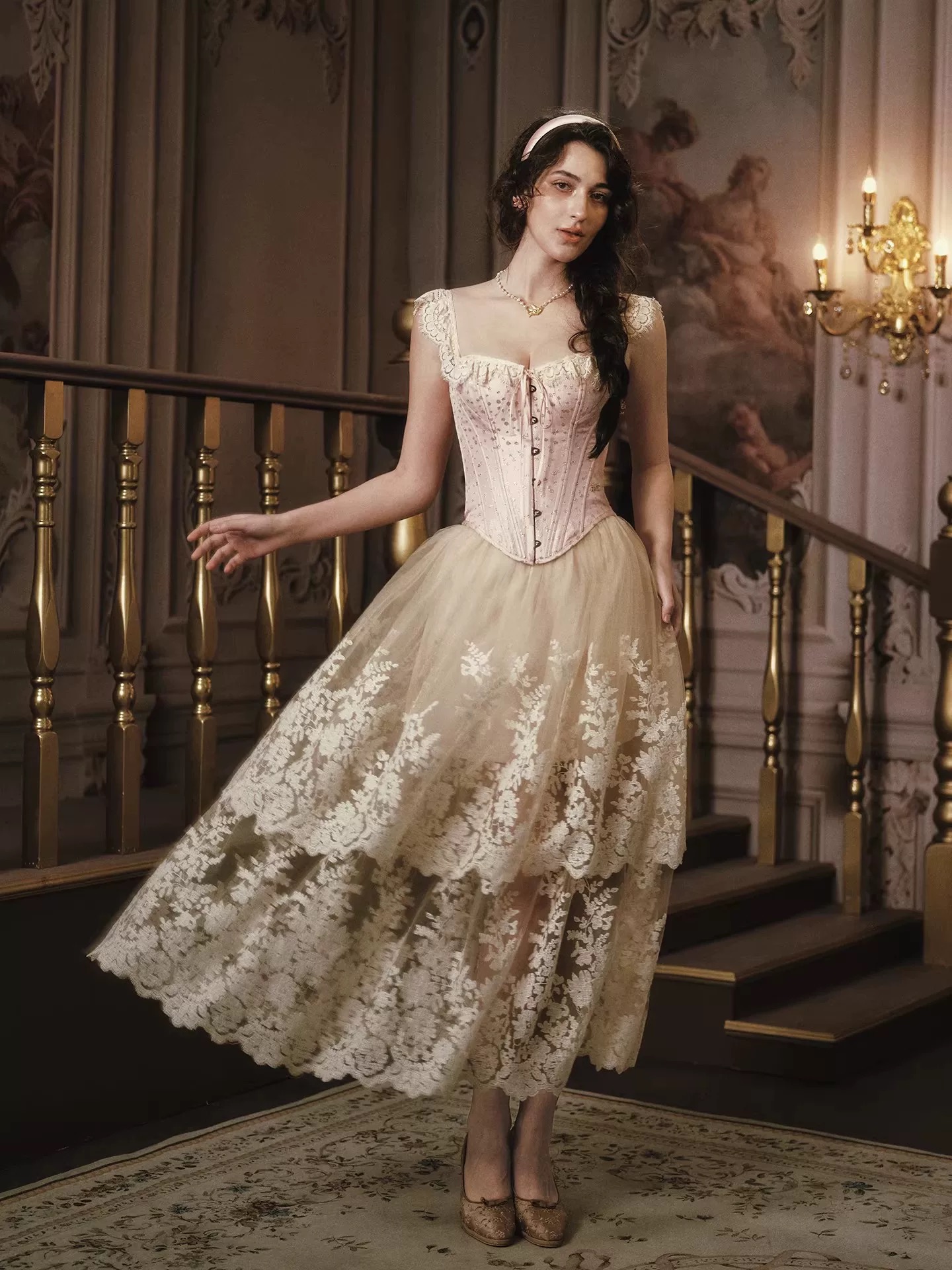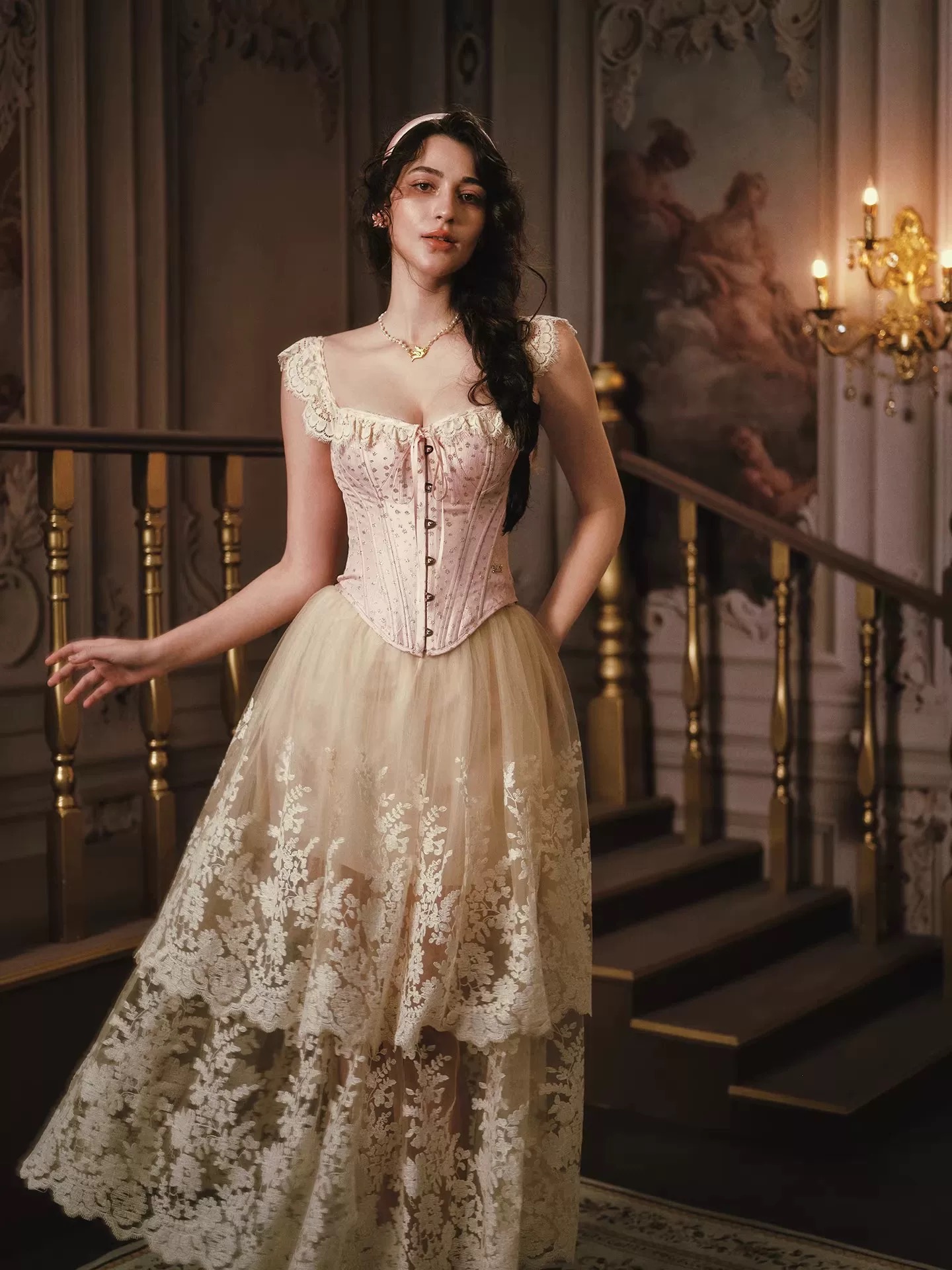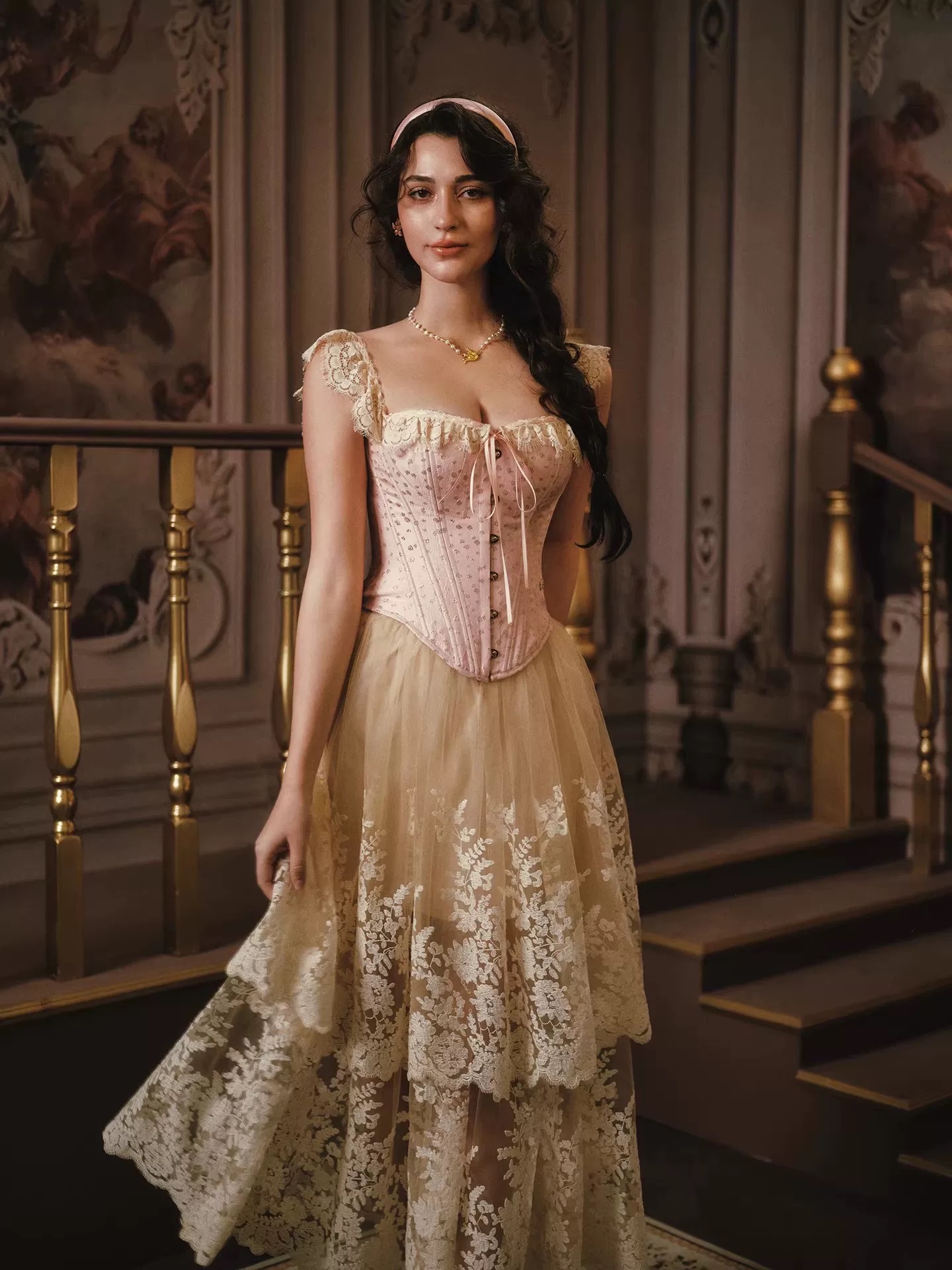 Thiết kế mang phong cách cổ điển châu Âu với tone vàng kem sang trọng, nổi bật phần corset siết eo giúp tôn đường cong cơ thể. Kết hợp chân váy ren dáng xòe nhiều lớp tạo độ bồng bềnh, mềm mại và nữ tính, lên dáng cực kỳ thanh thoát – phù hợp đi tiệc, chụp ảnh hoặc sự kiện.