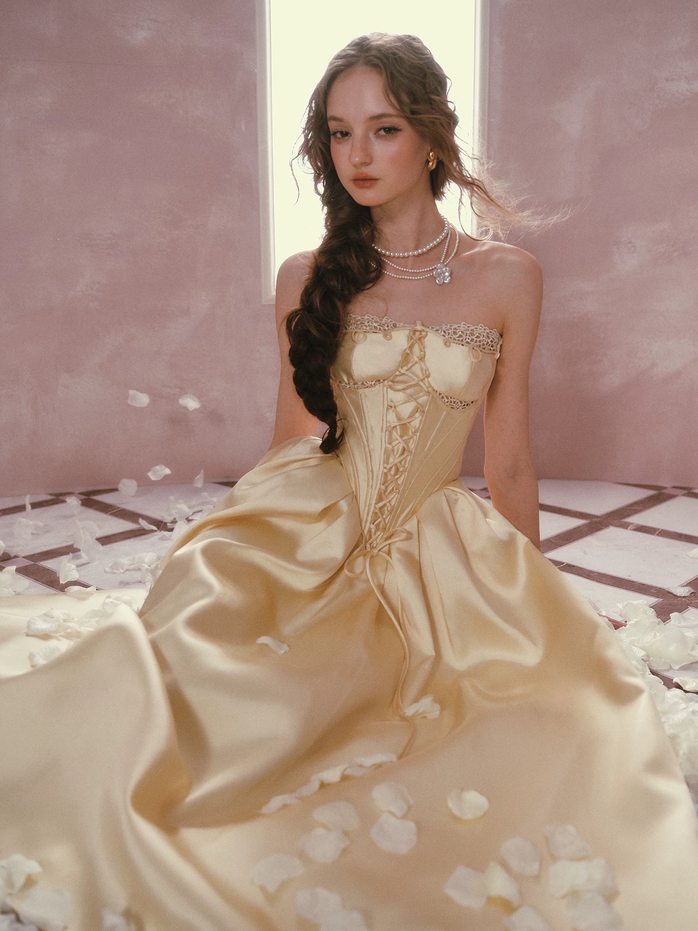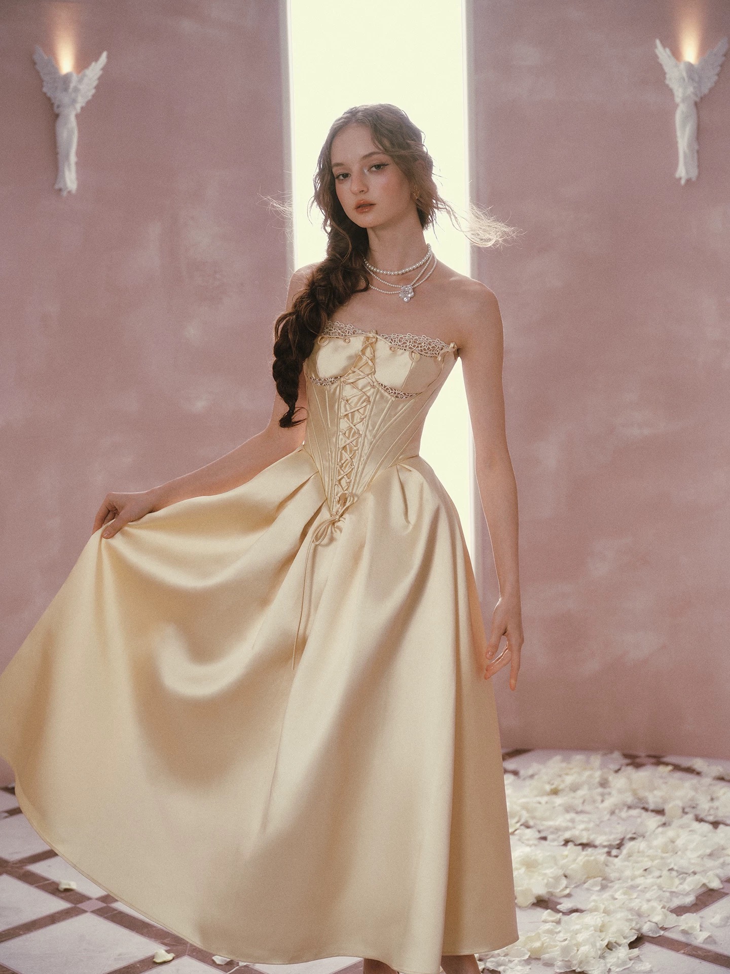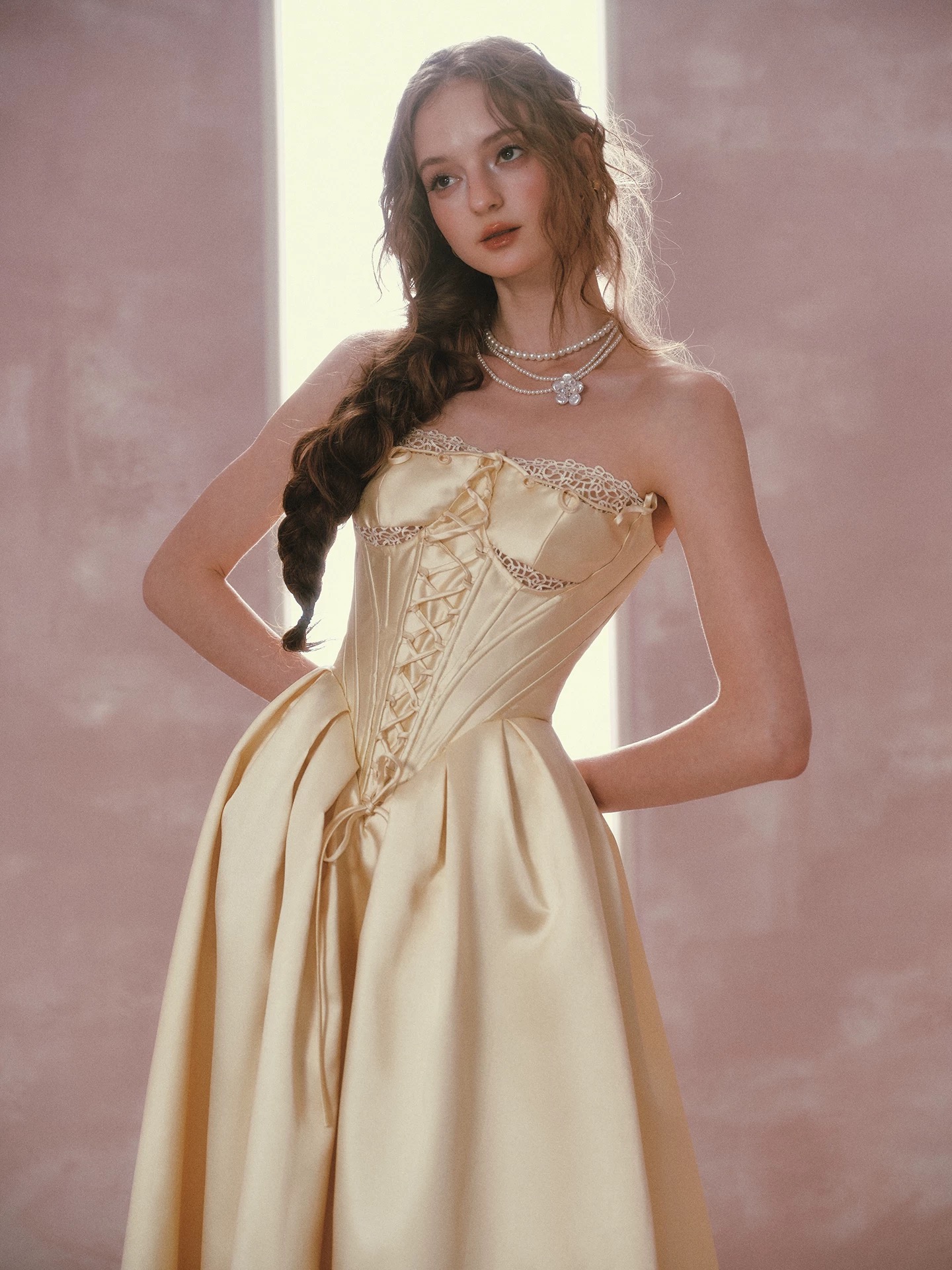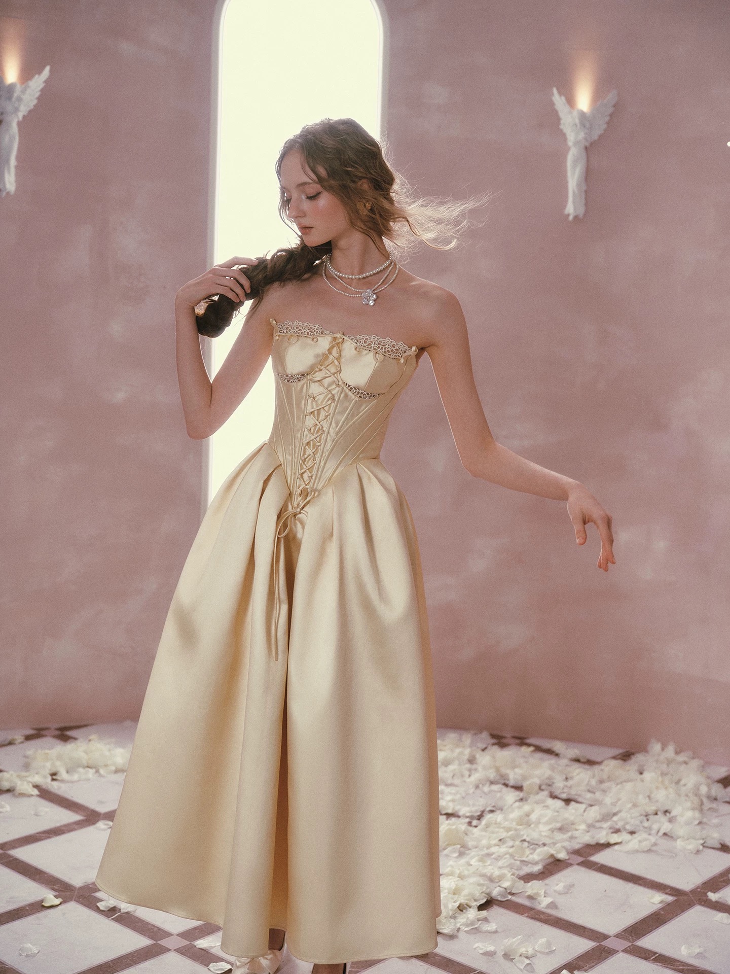 Thiết kế mang phong cách cổ điển châu Âu với tone vàng kem thanh lịch, phần corset ôm eo kết hợp chân váy xòe giúp...