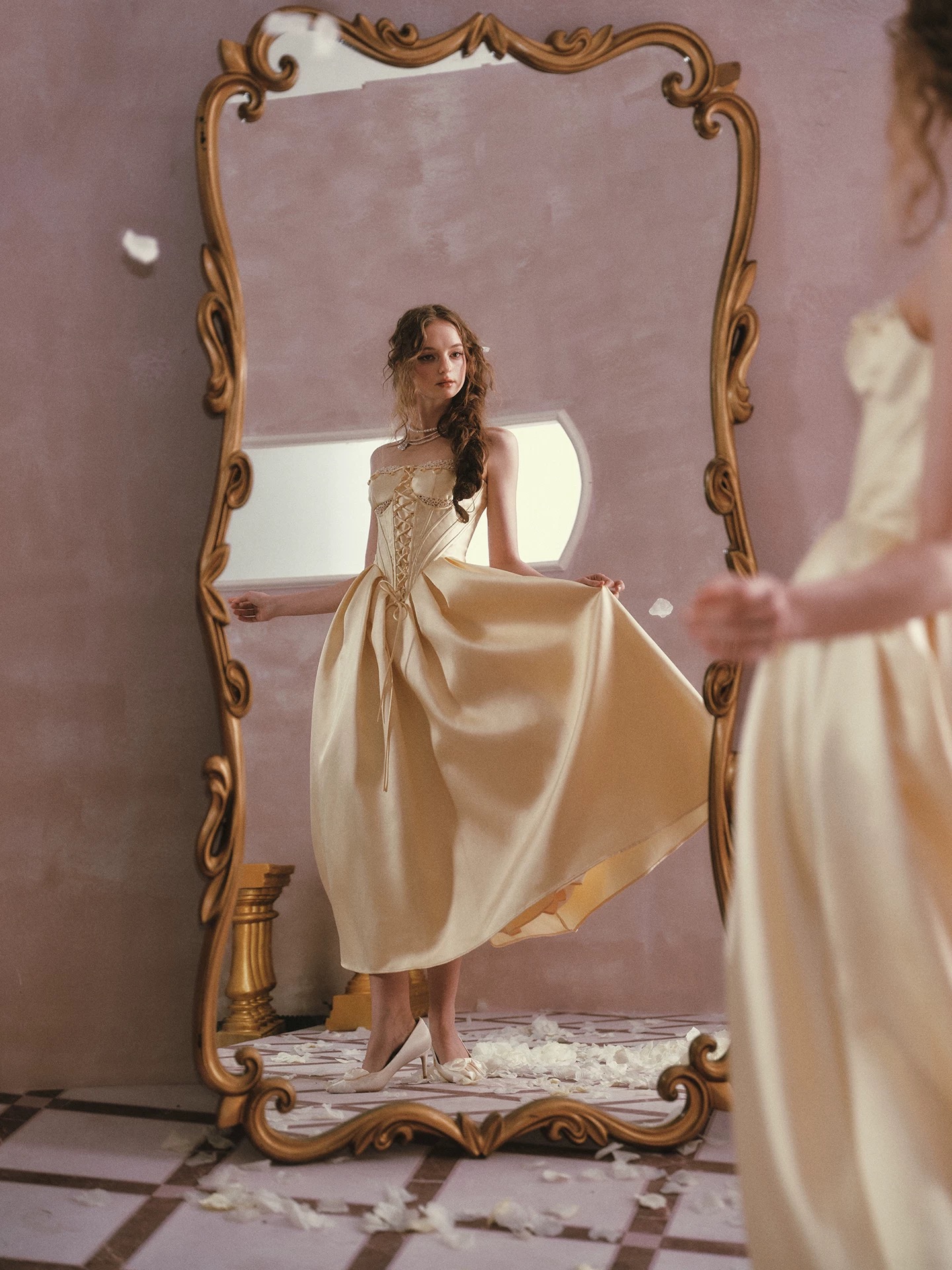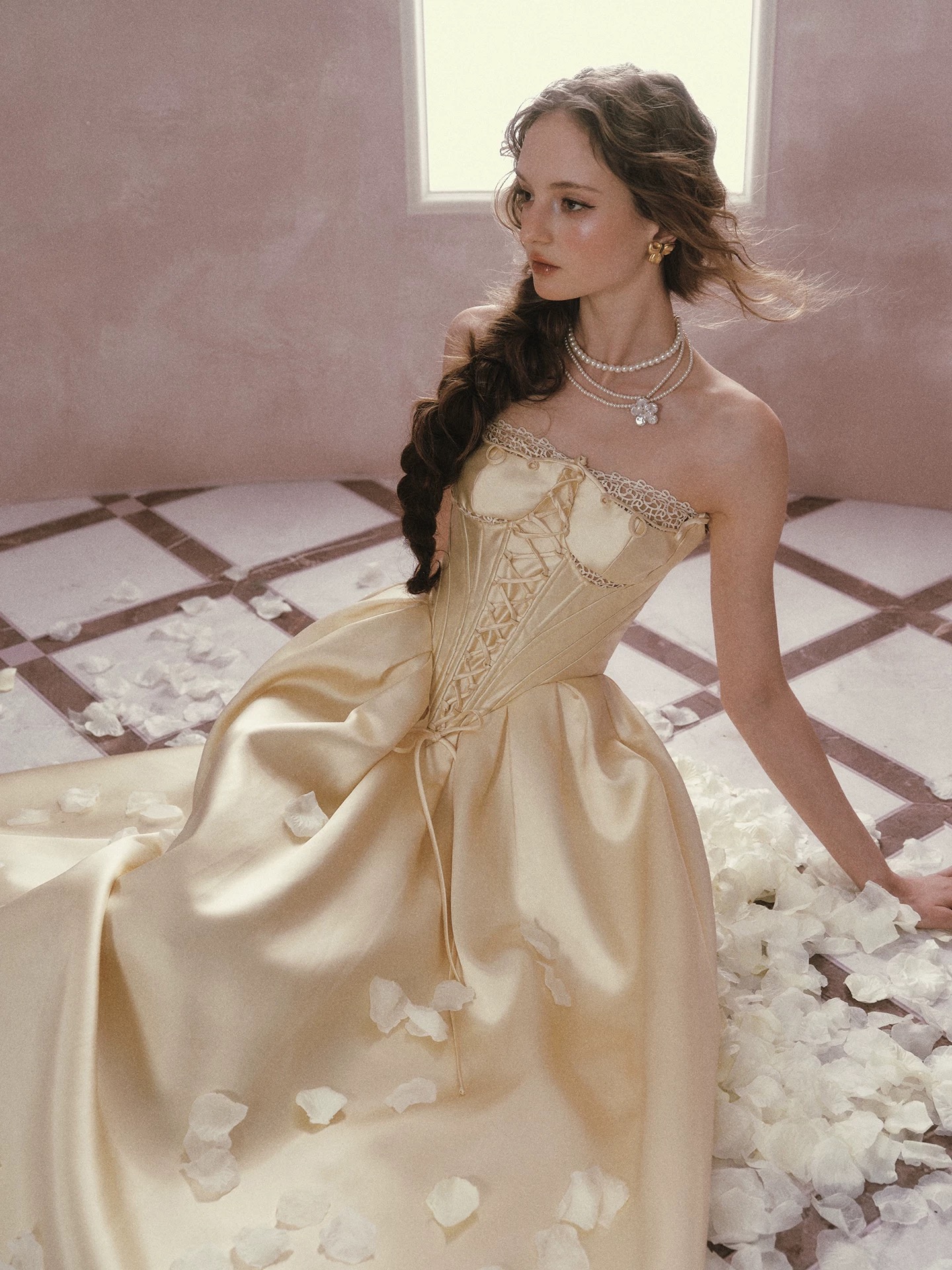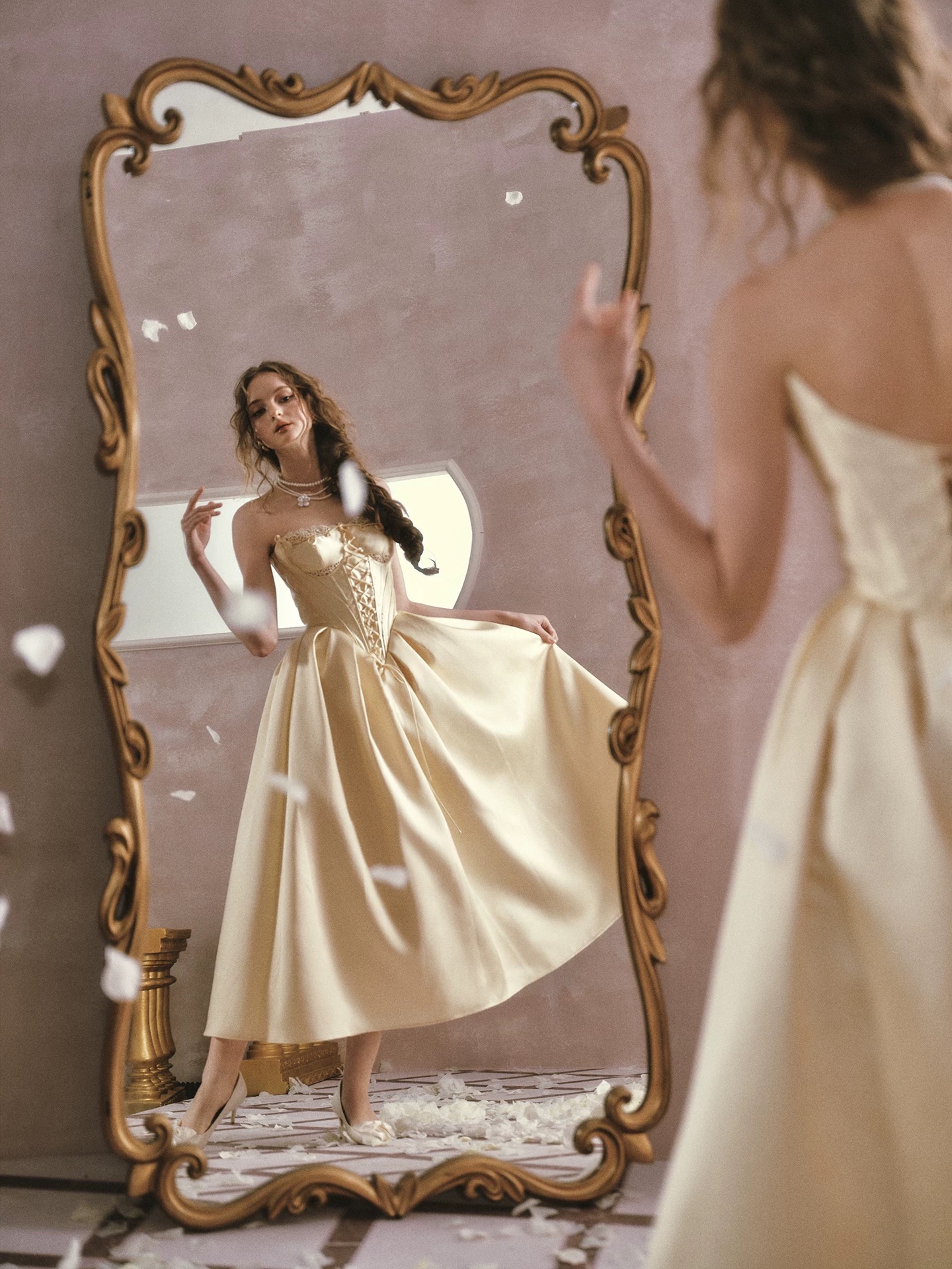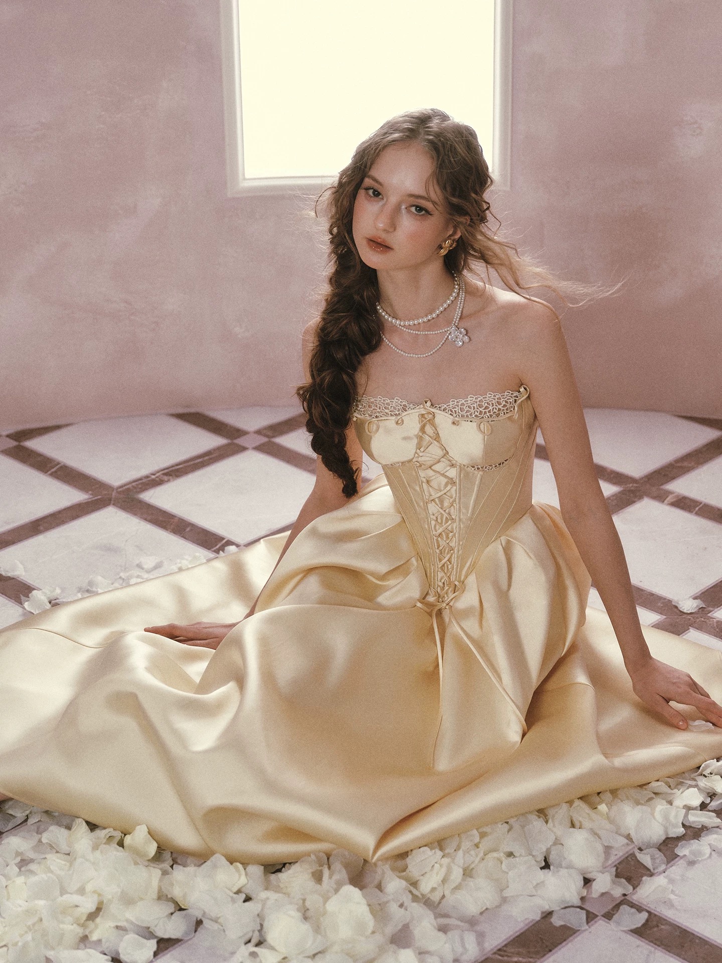 Thiết kế mang phong cách cổ điển châu Âu với tone vàng kem thanh lịch, phần corset ôm eo kết hợp chân váy xòe giúp...