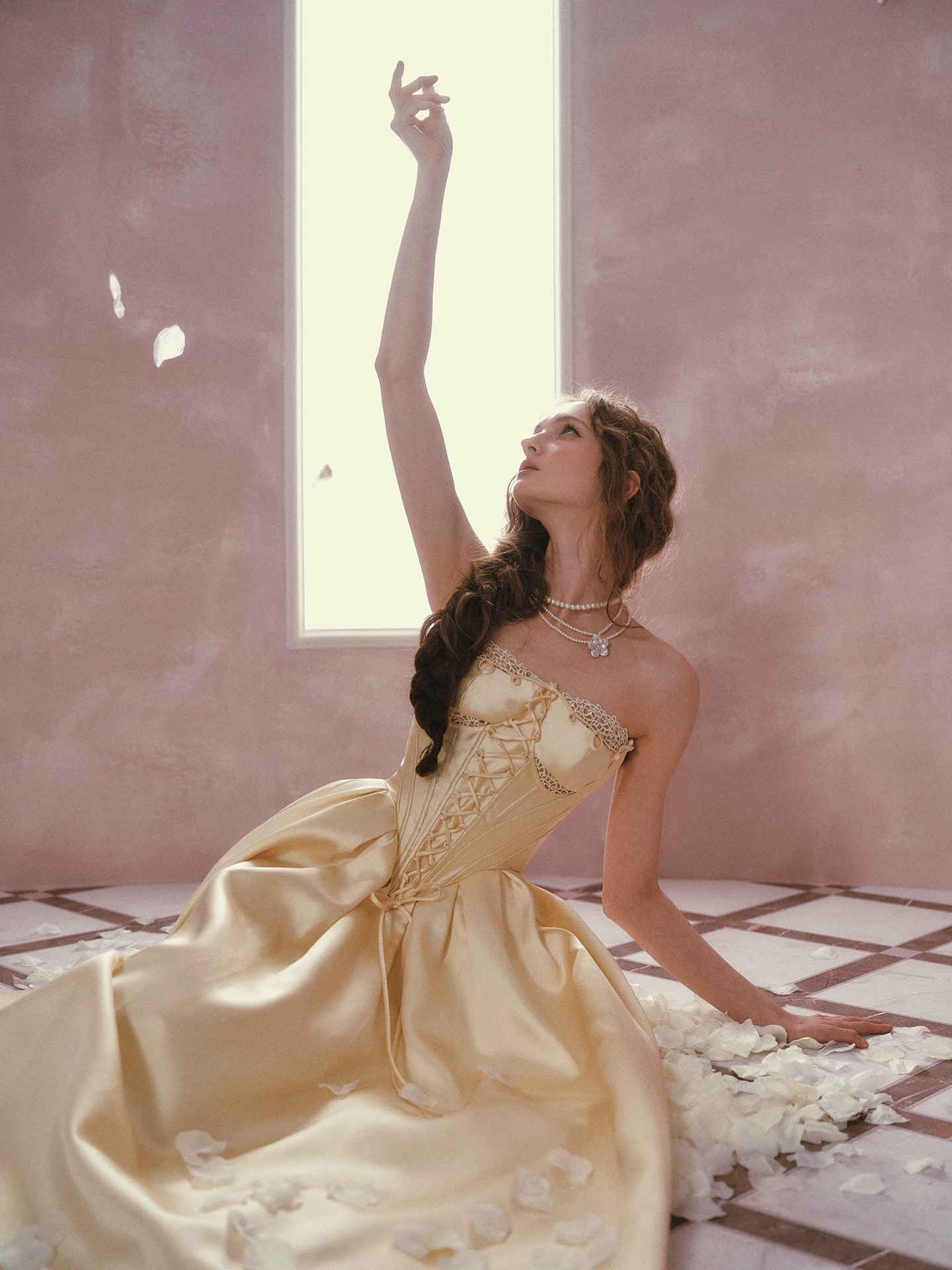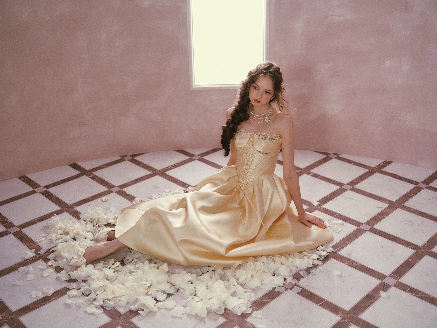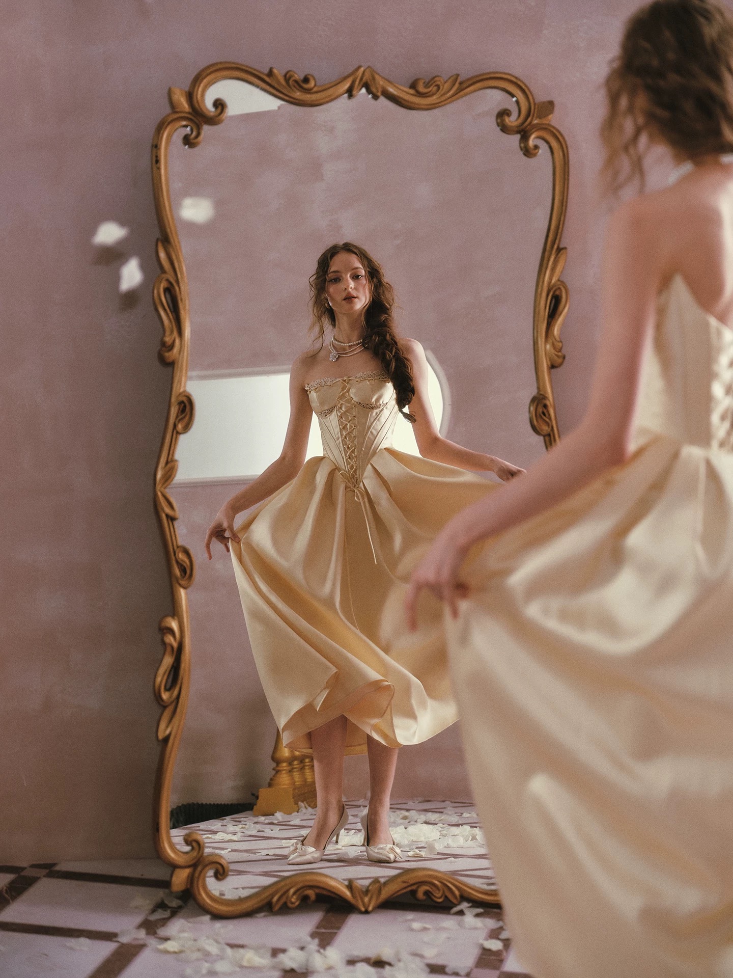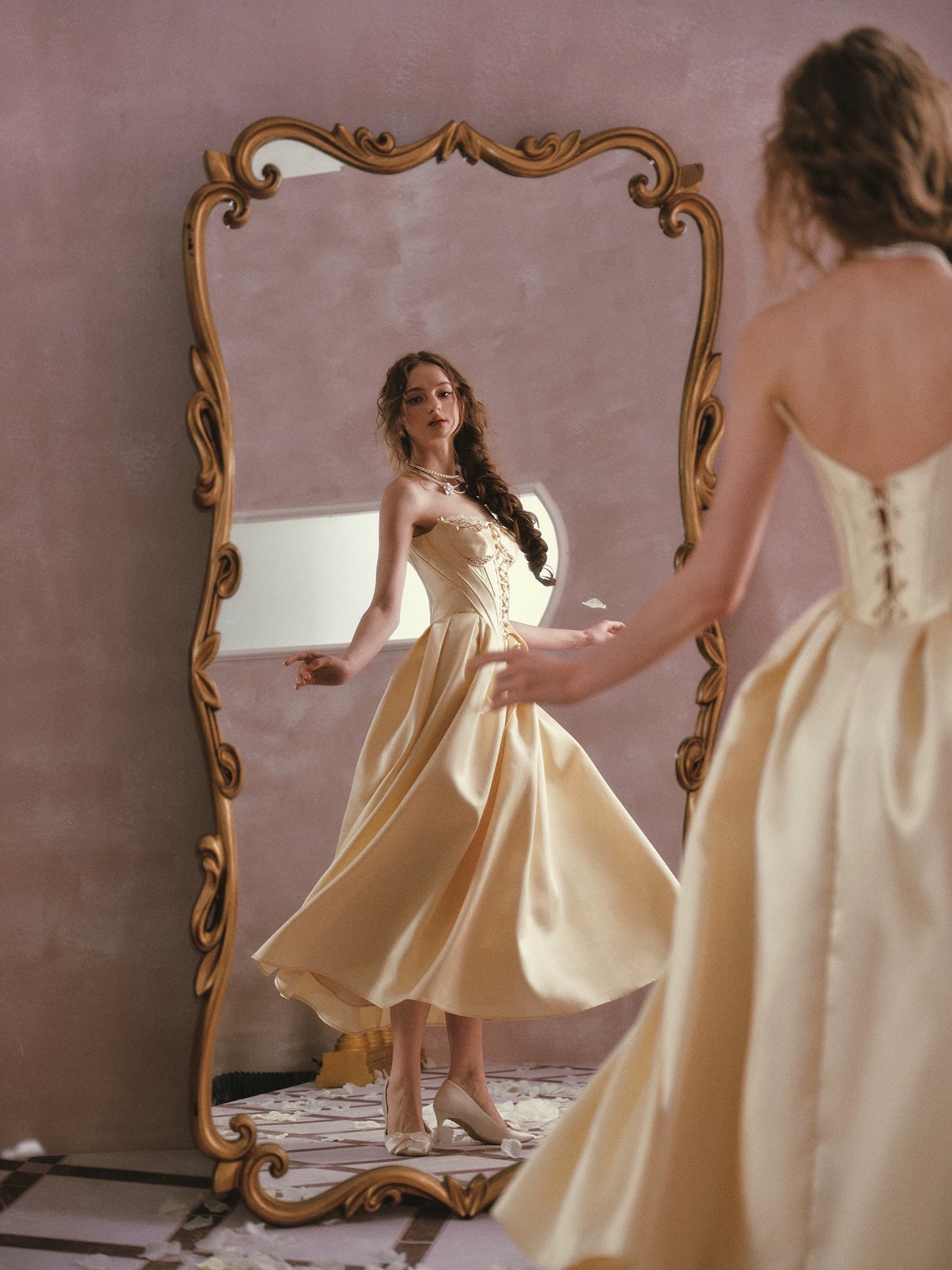 Thiết kế mang phong cách cổ điển châu Âu với tone vàng kem thanh lịch, phần corset ôm eo kết hợp chân váy xòe giúp...