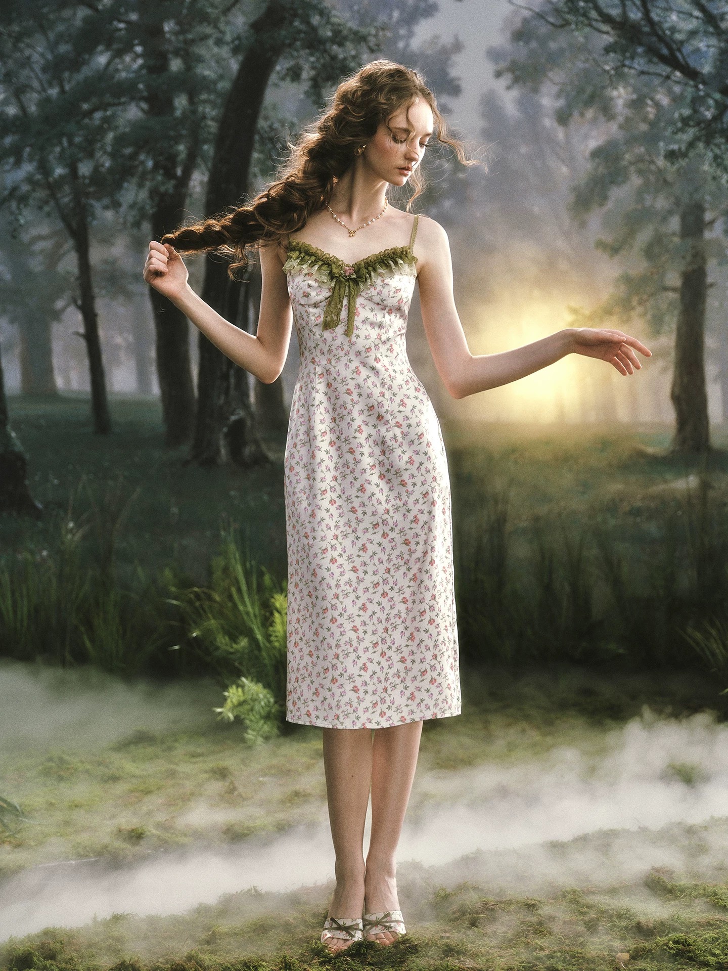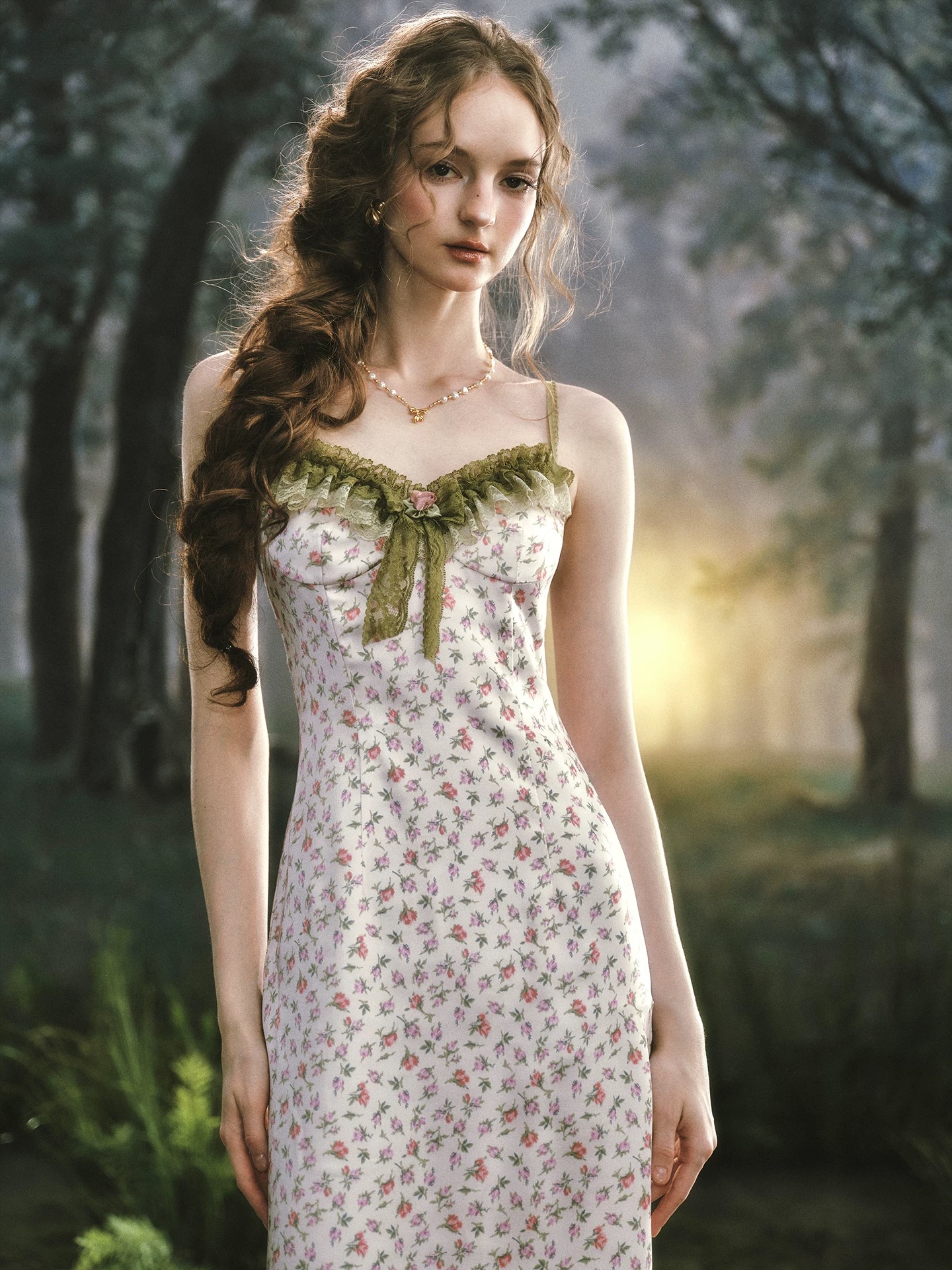LaceMade váy hoa nhí dáng ôm phối ren vintage_V22