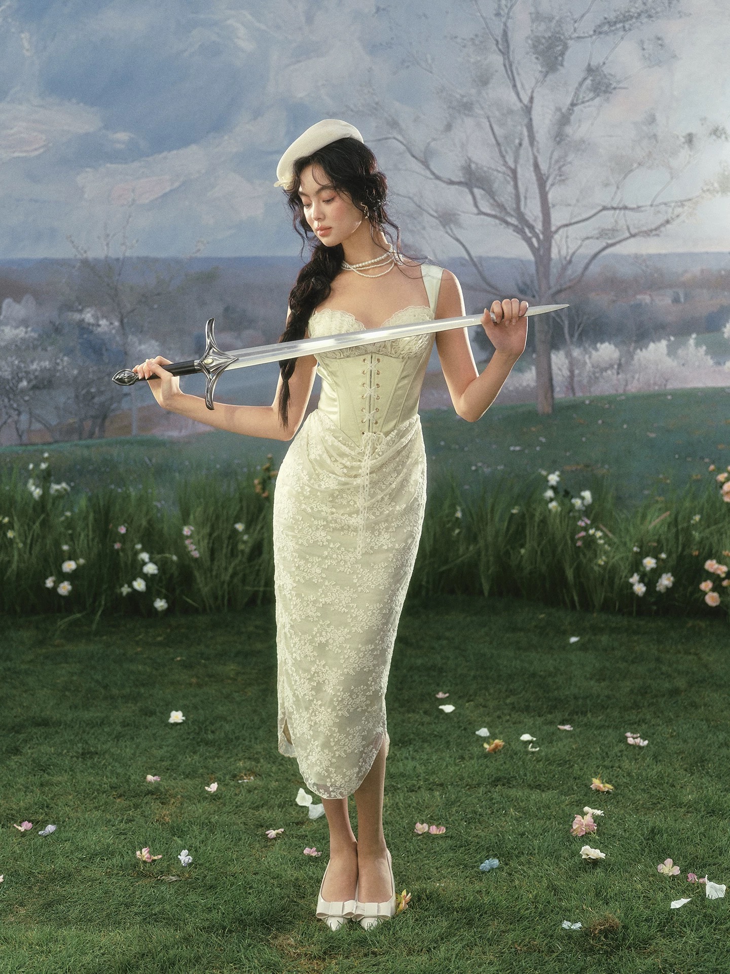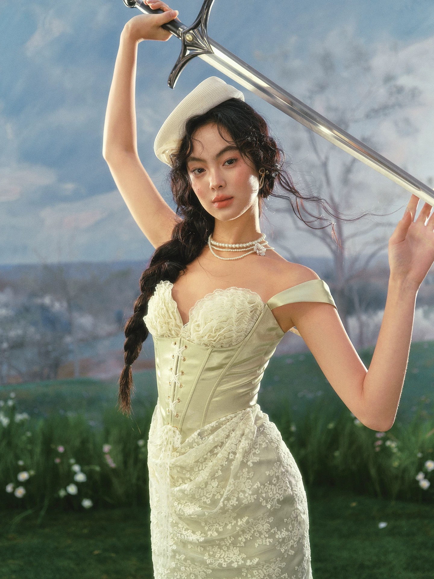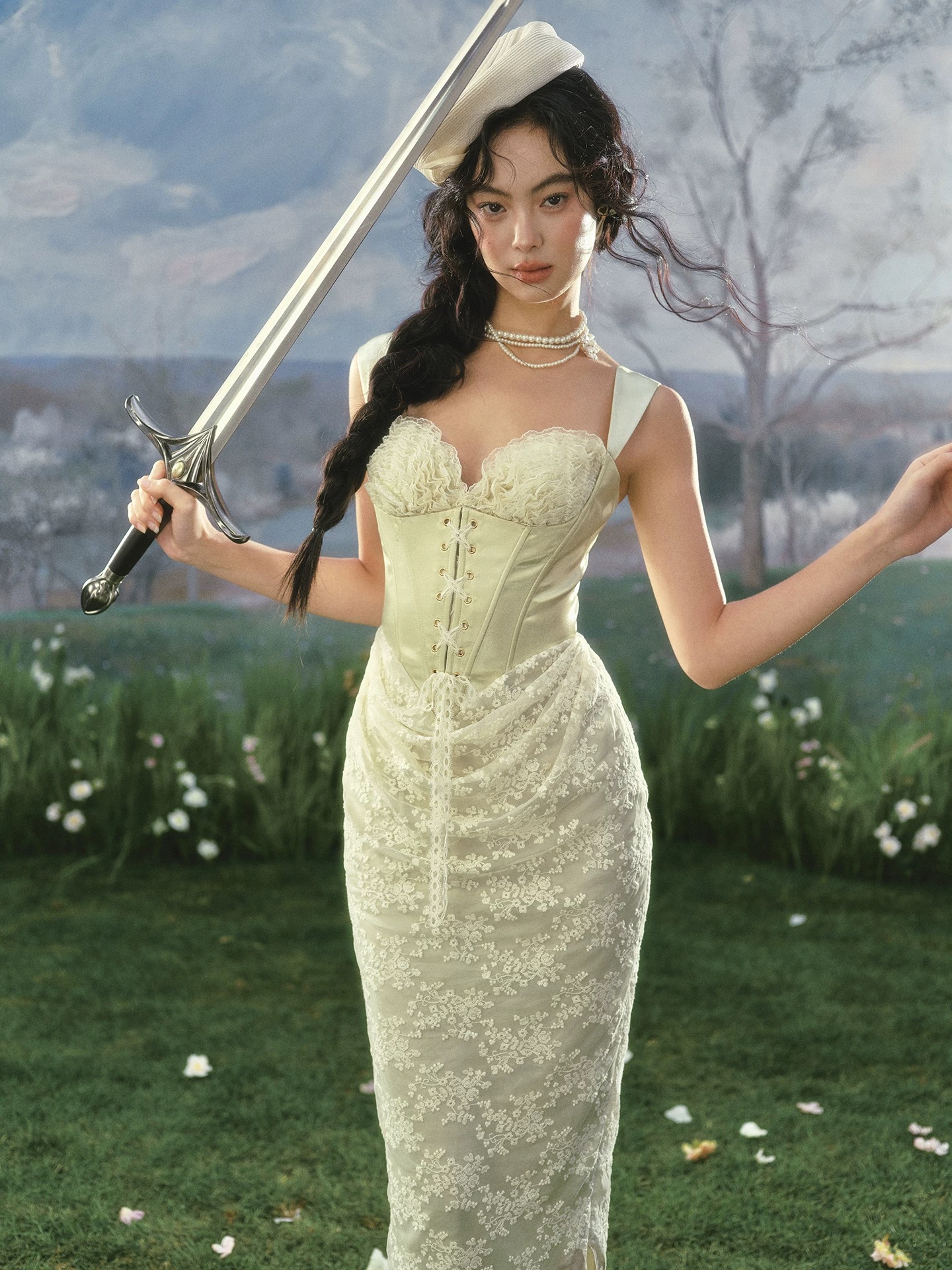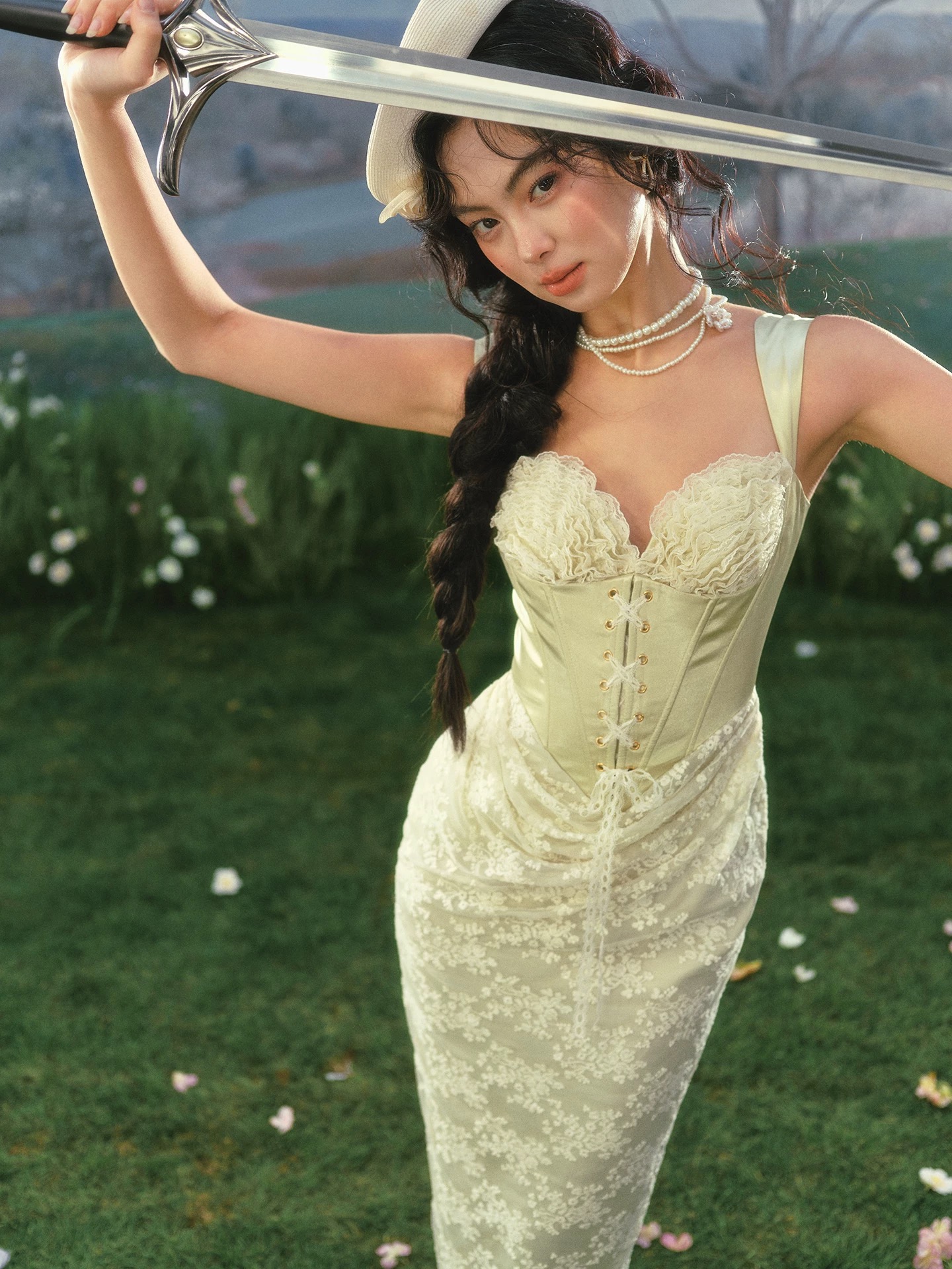 - Thiết kế: Corset siết eo, ngực cúp phối ren, xẻ sau nhẹ