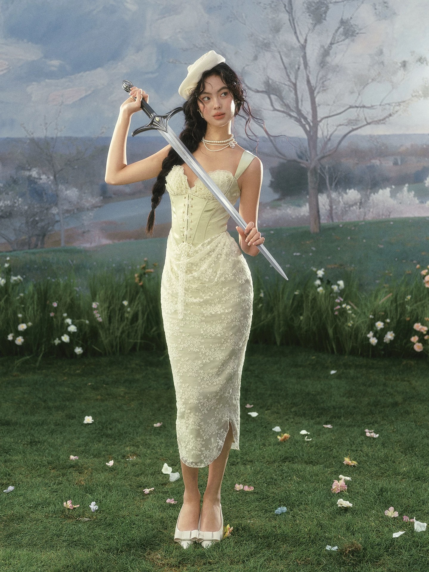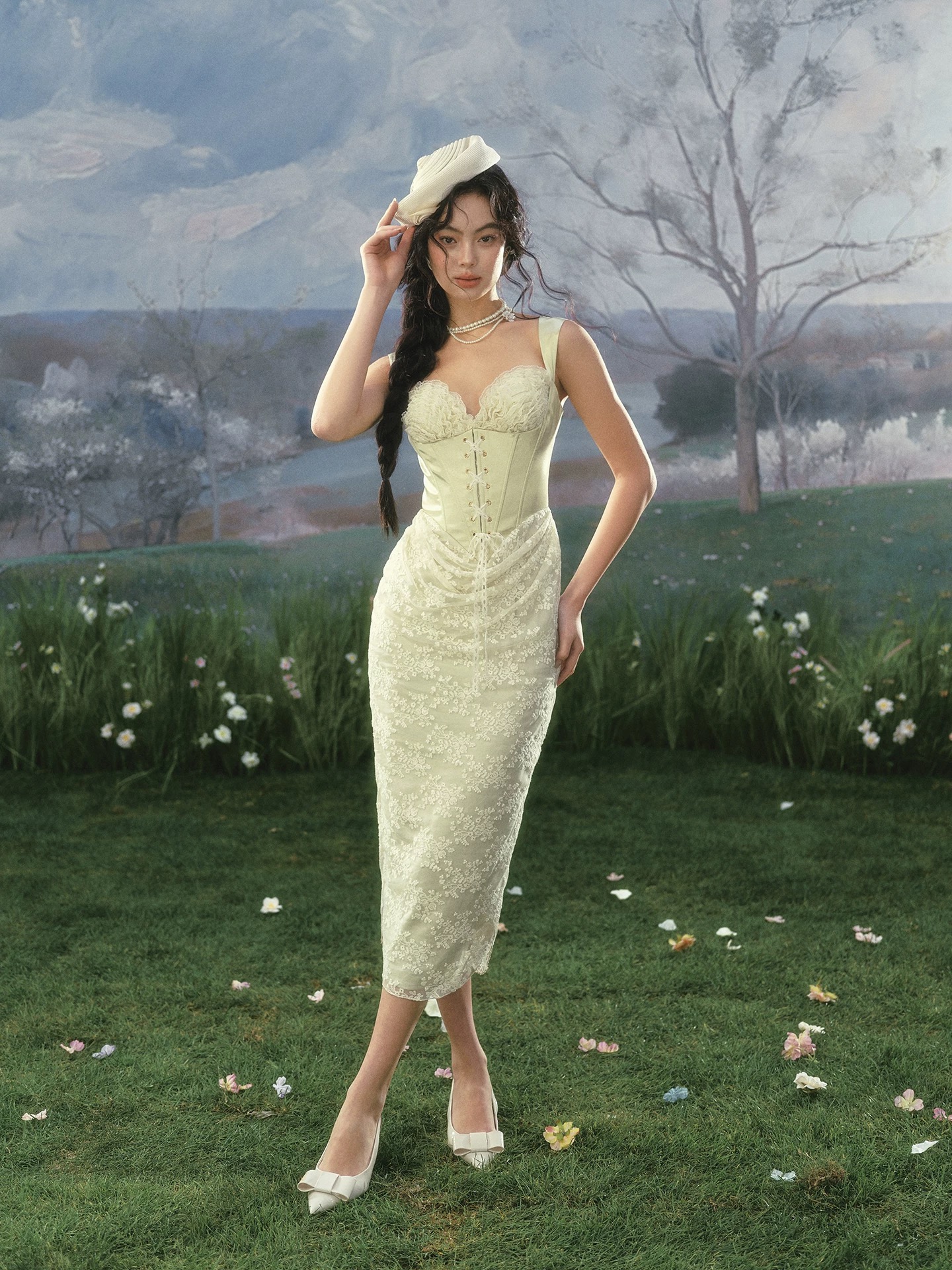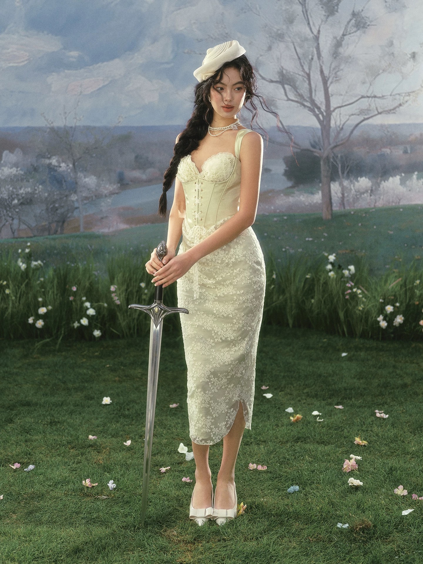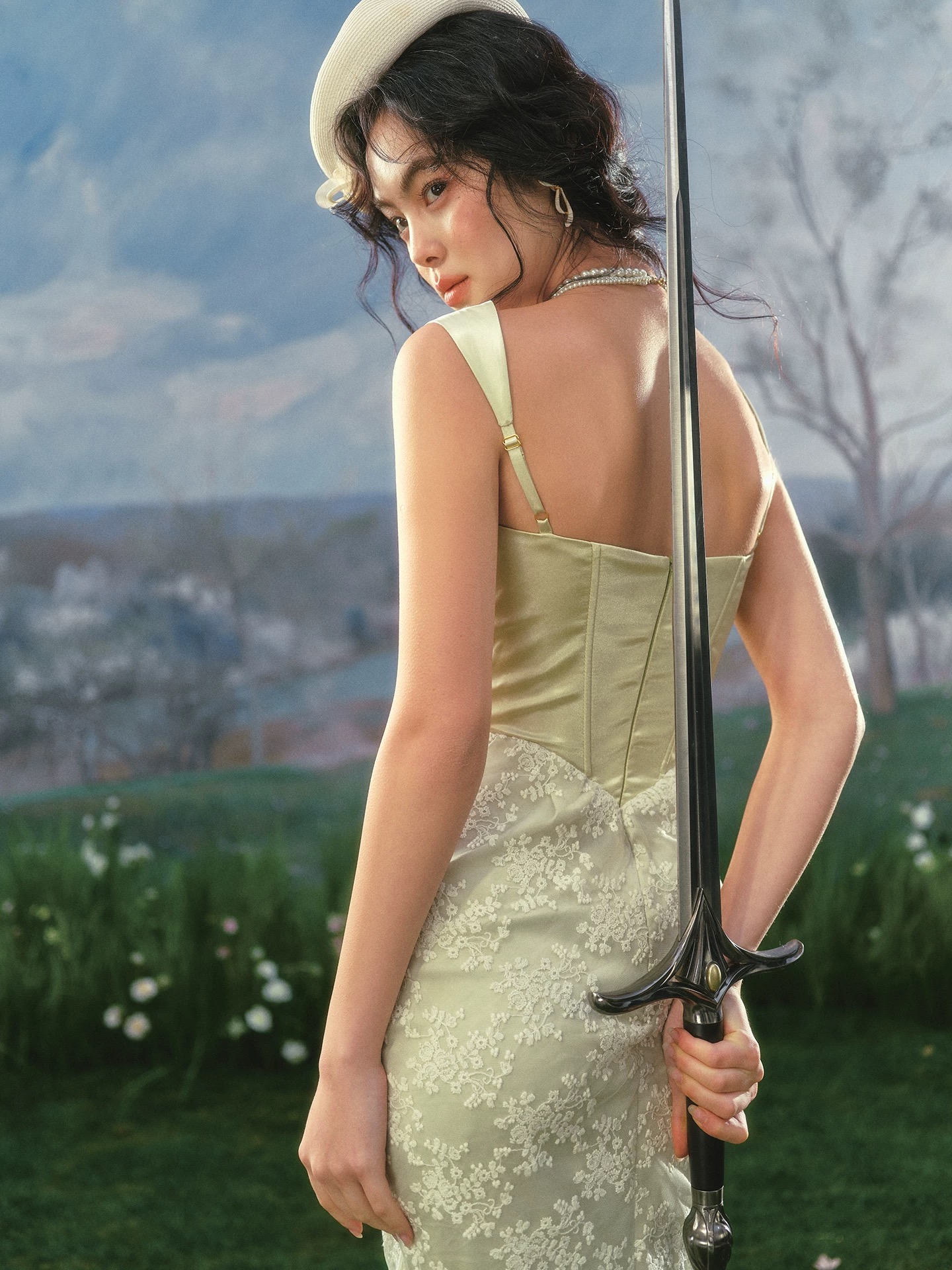 - Thiết kế: Corset siết eo, ngực cúp phối ren, xẻ sau nhẹ