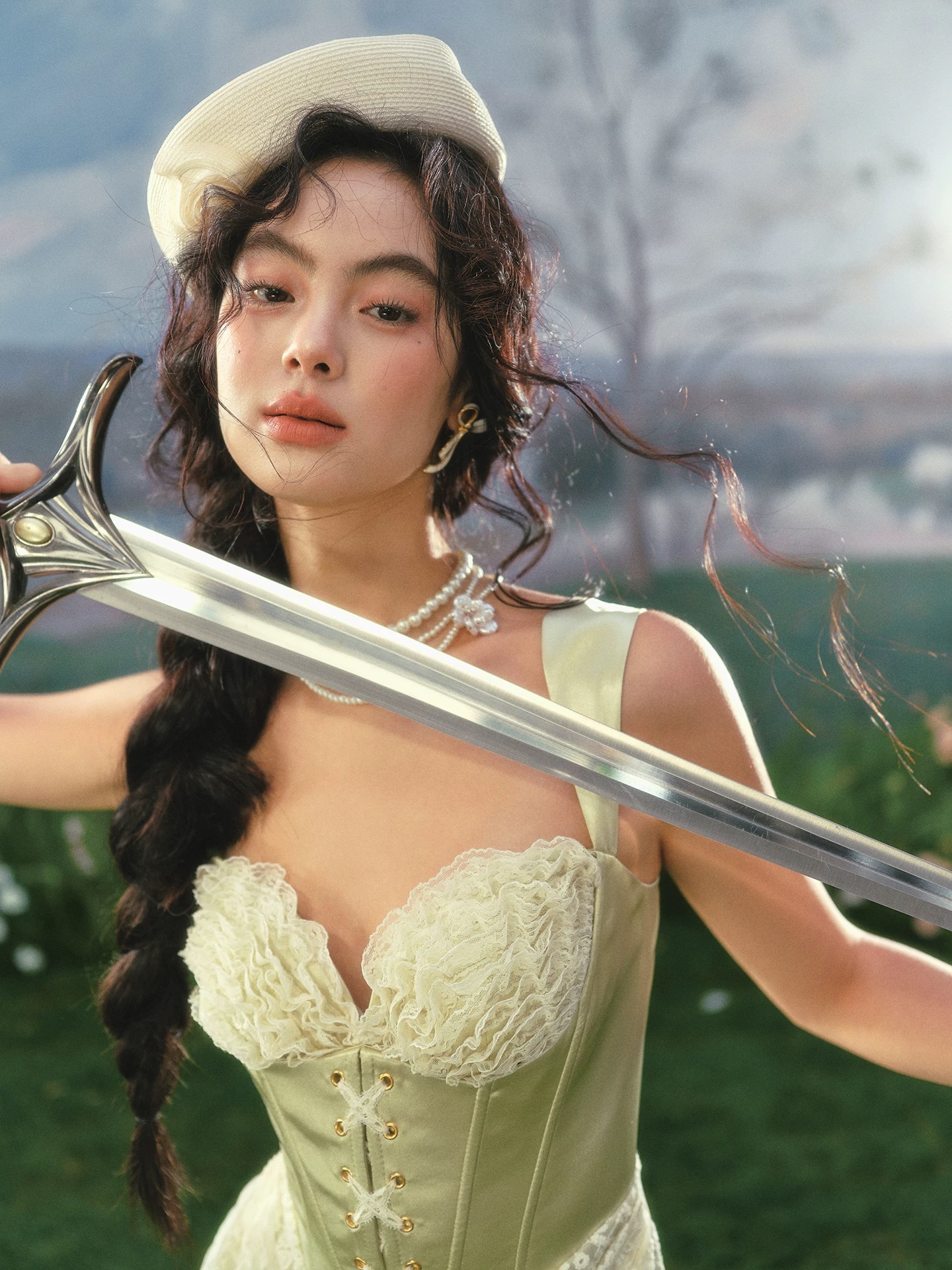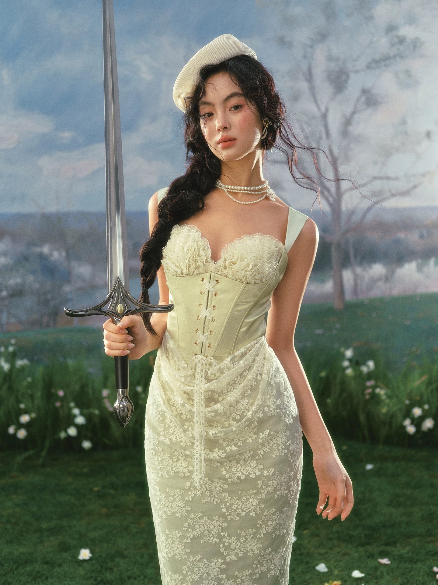 Thiết kế mang phong cách cổ điển châu Âu với tone xanh pastel dịu mắt, nổi bật phần corset ôm eo kết hợp chân váy ôm ren tinh tế giúp tôn dáng mềm mại và quyến rũ. Form dáng chuẩn, lên người thanh thoát, phù hợp đi tiệc, chụp ảnh hoặc hẹn hò.