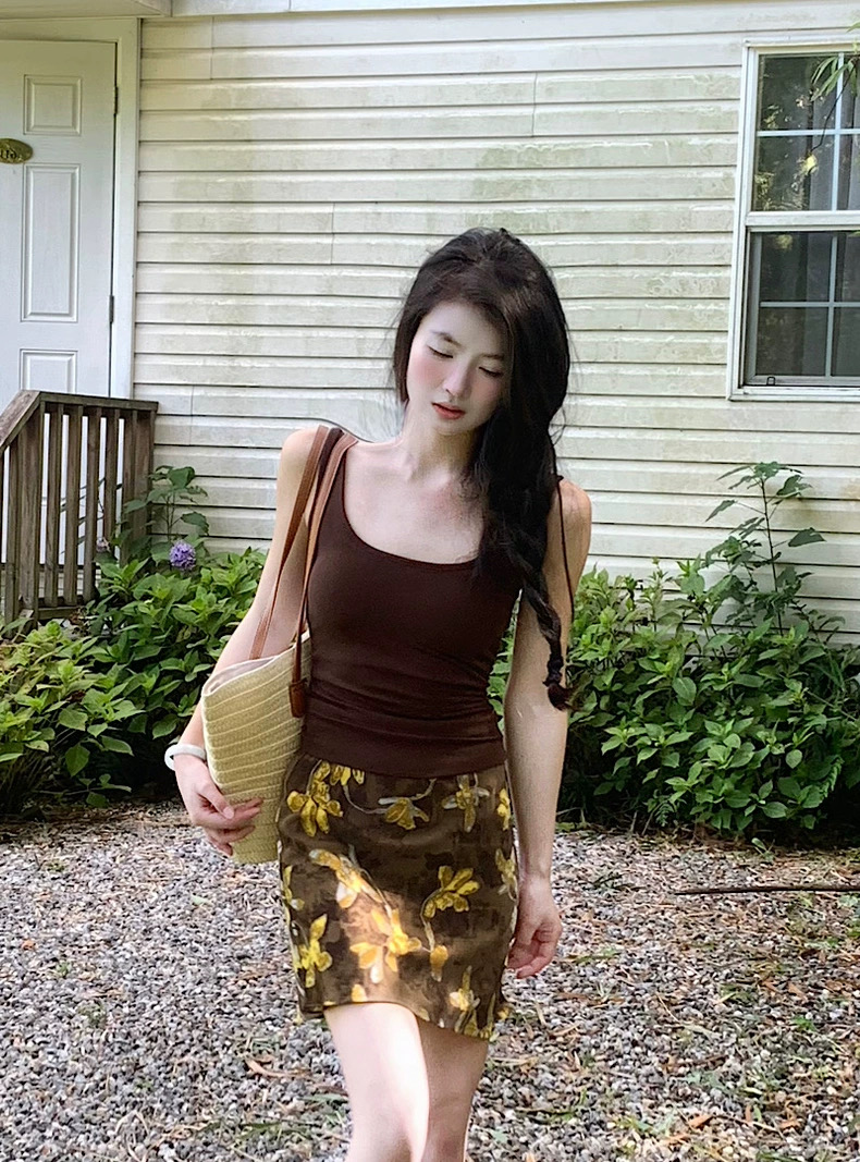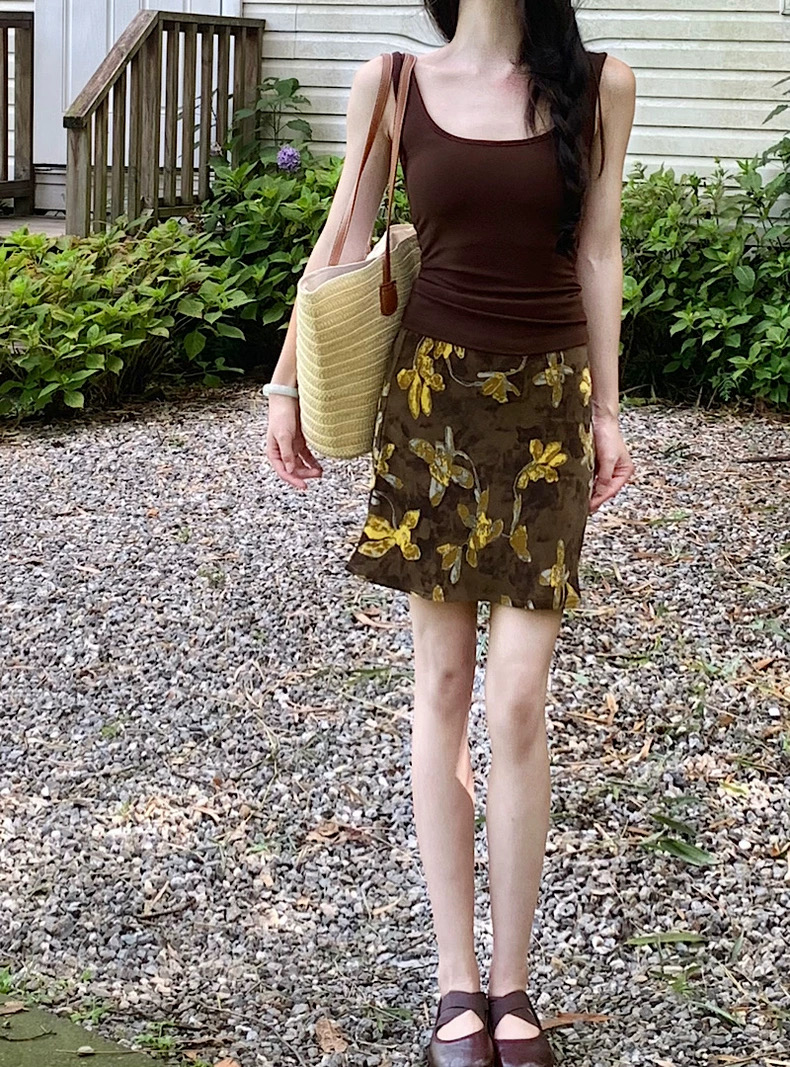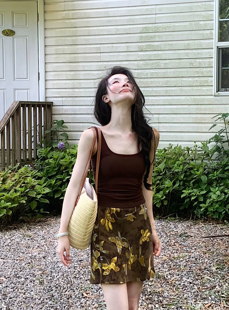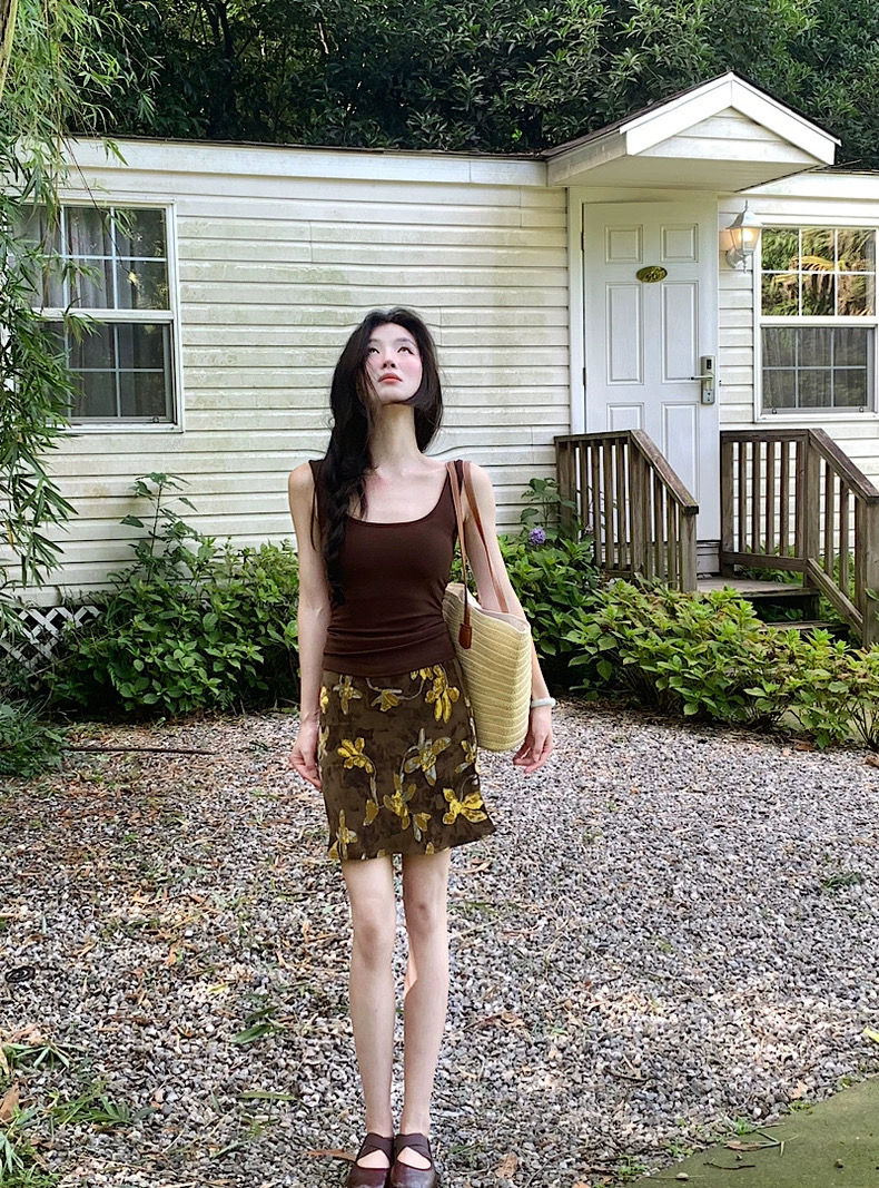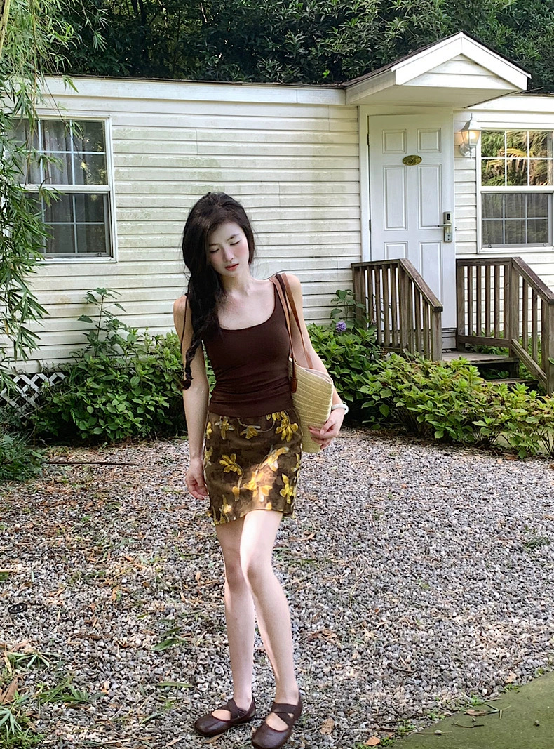 Áo 2 dây ôm phối chân váy họa tiết dáng ngắn_V11