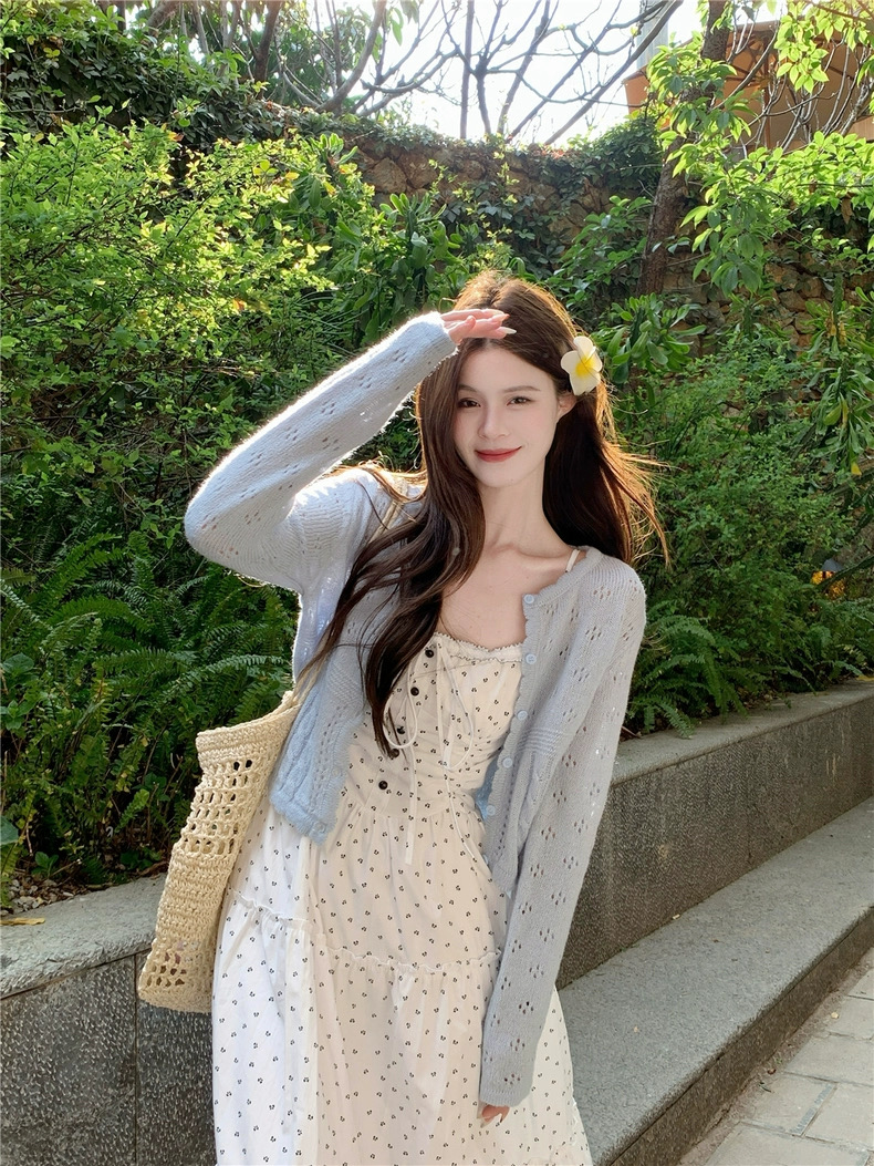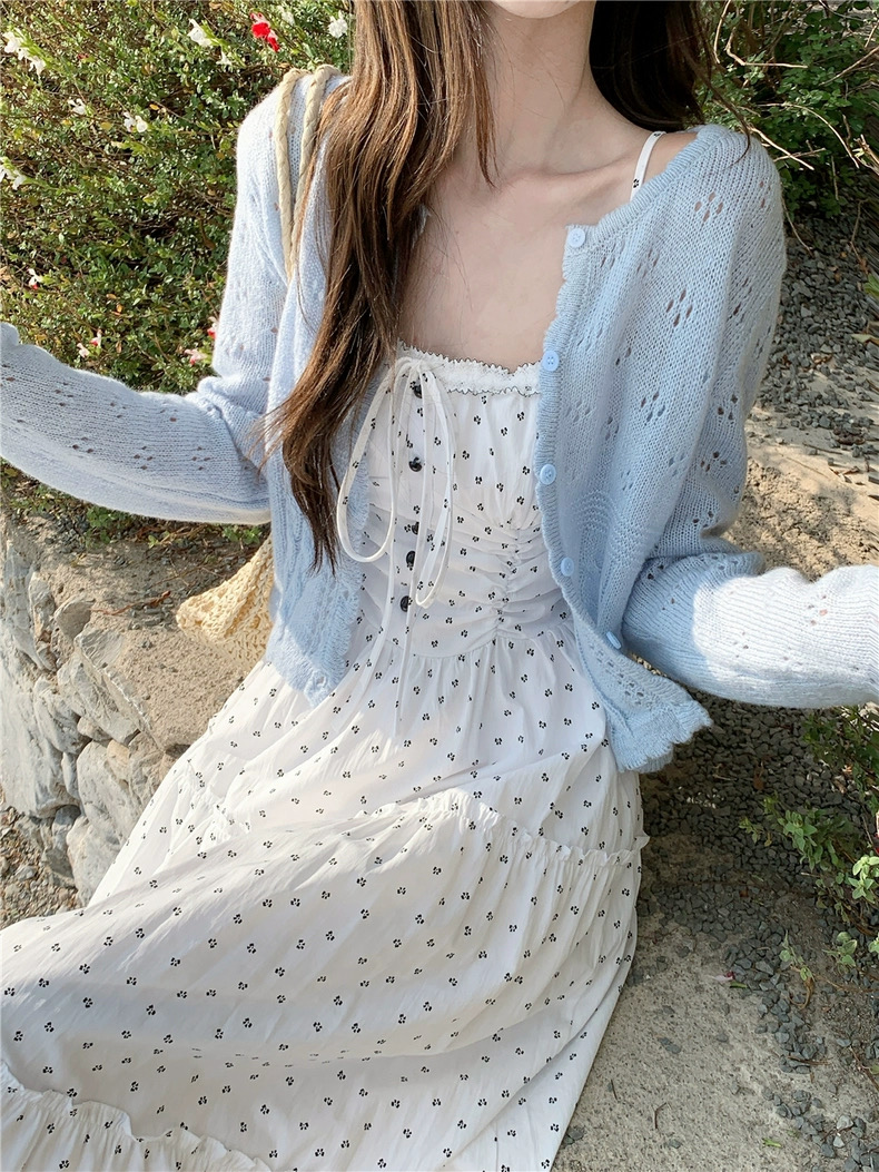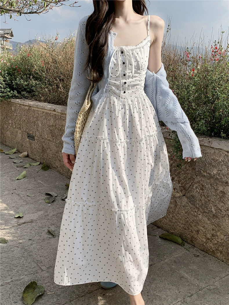 Đầm maxi hoa nhí phối áo cardigan len_V06