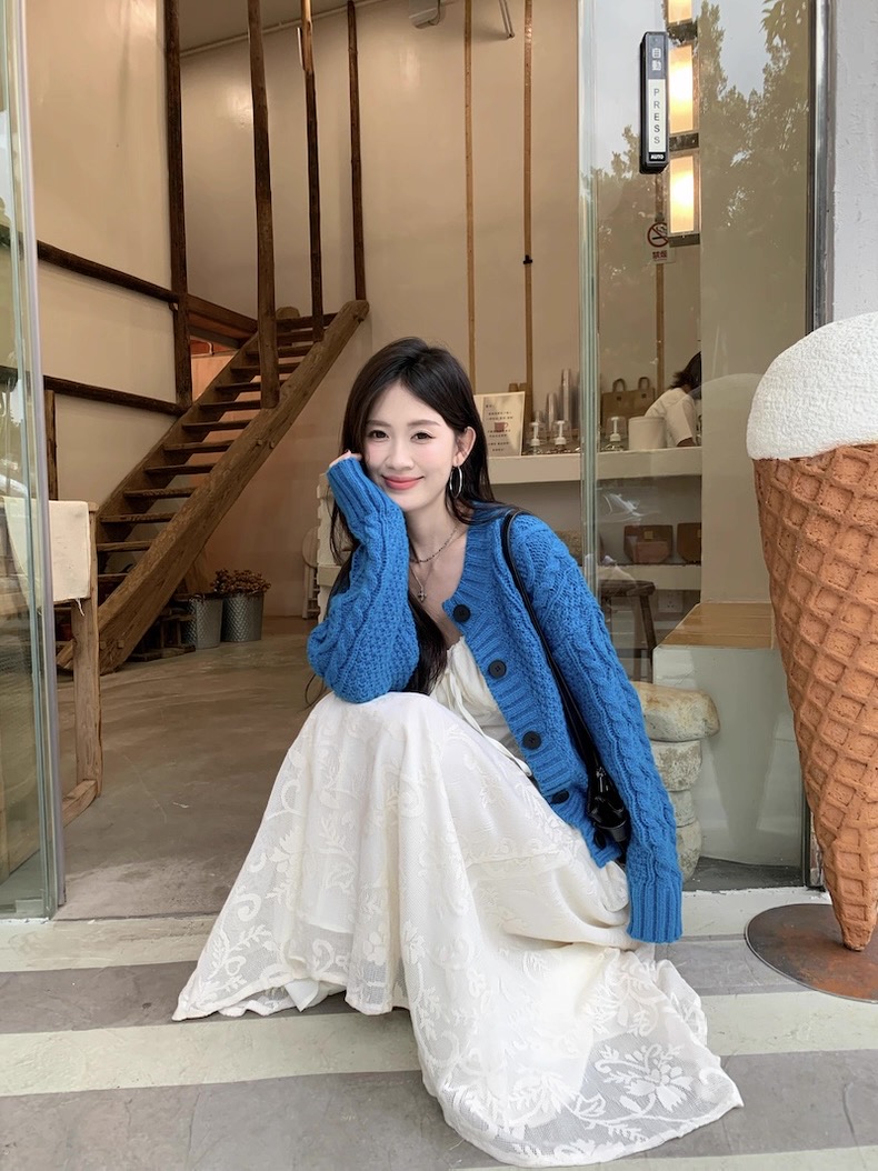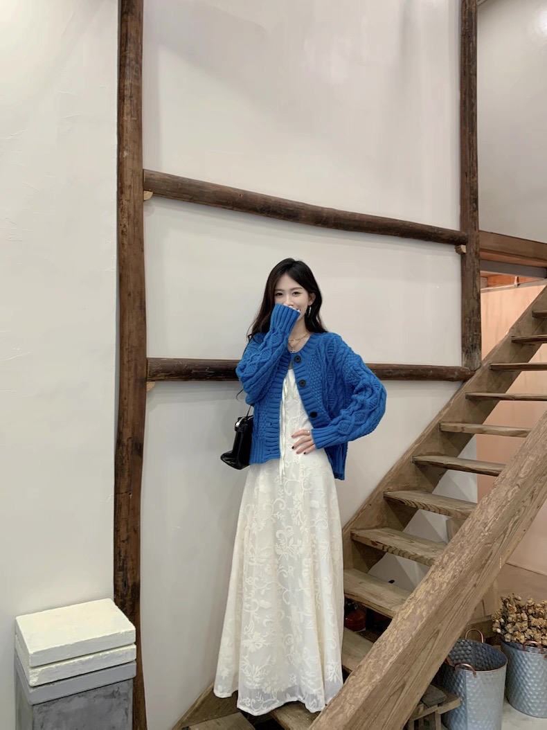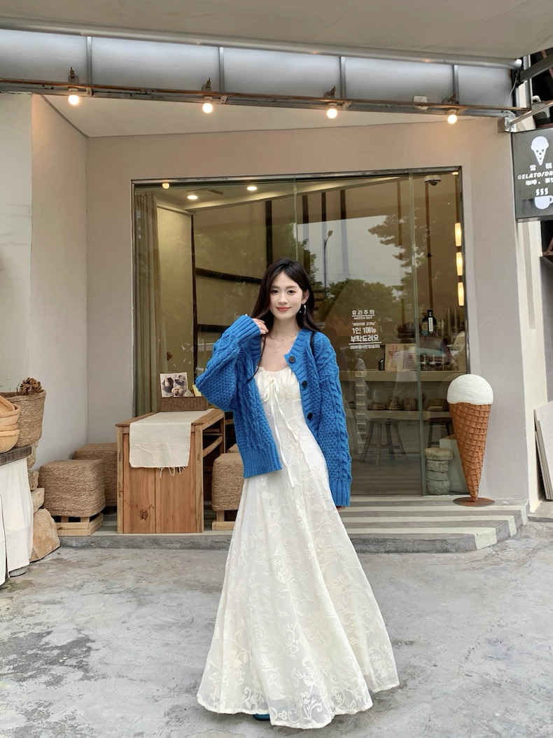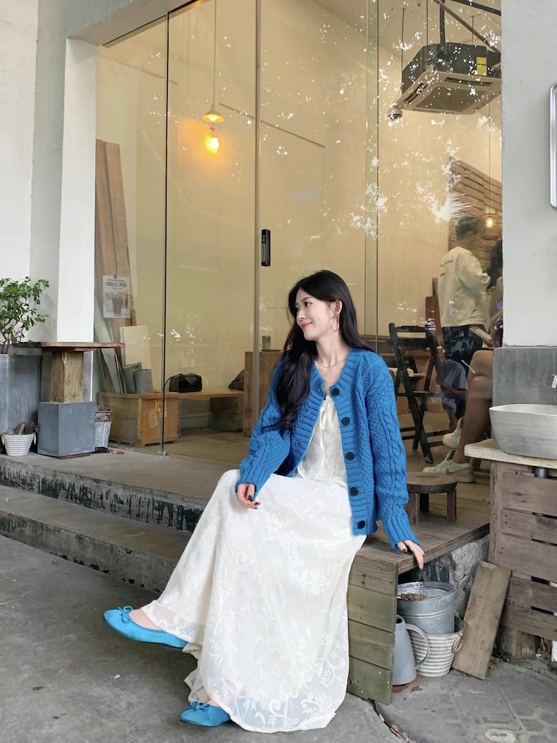 Đầm maxi trắng phối áo cardigan len xanh_V04