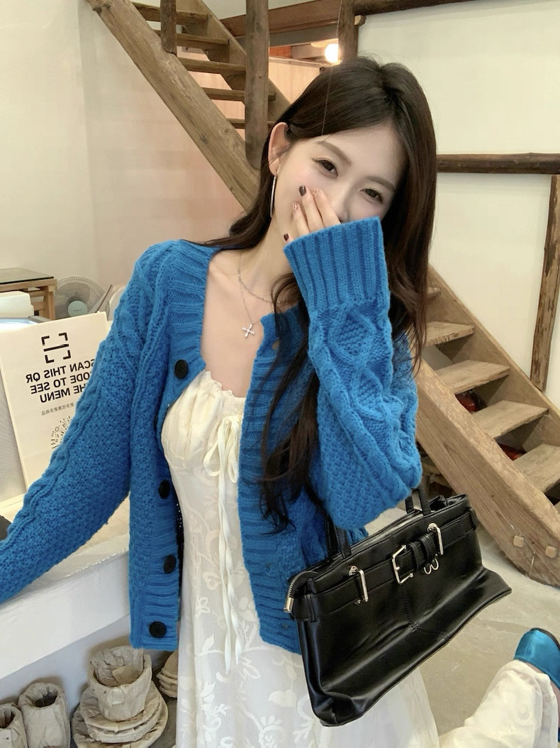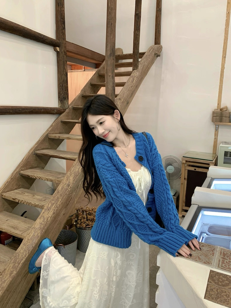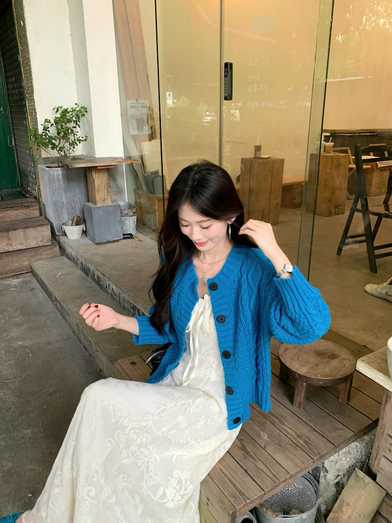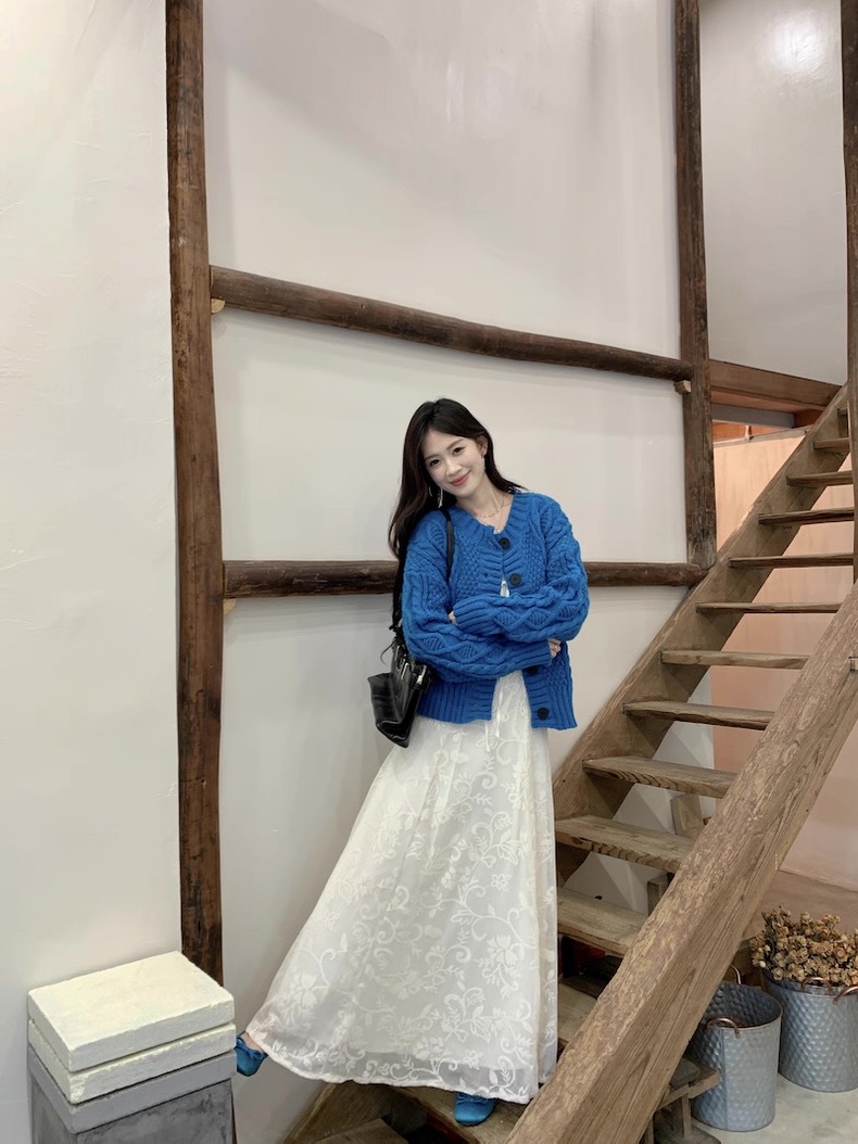 Đầm maxi trắng phối áo cardigan len xanh_V04
