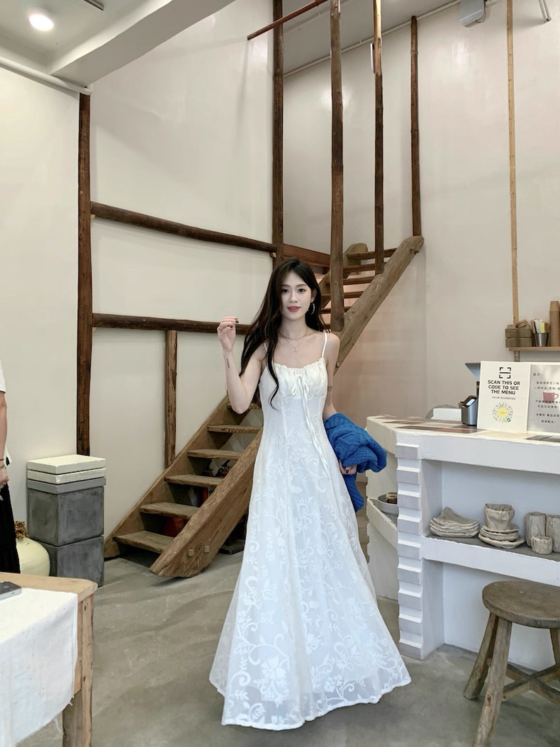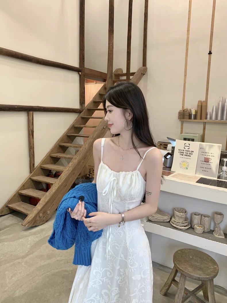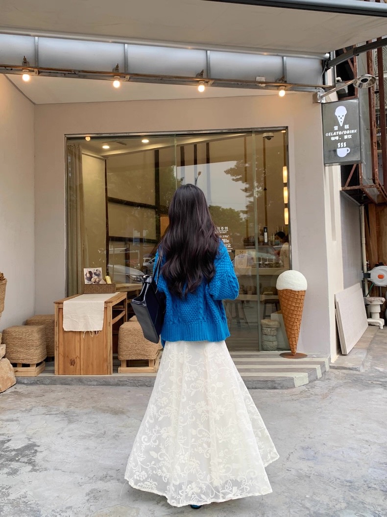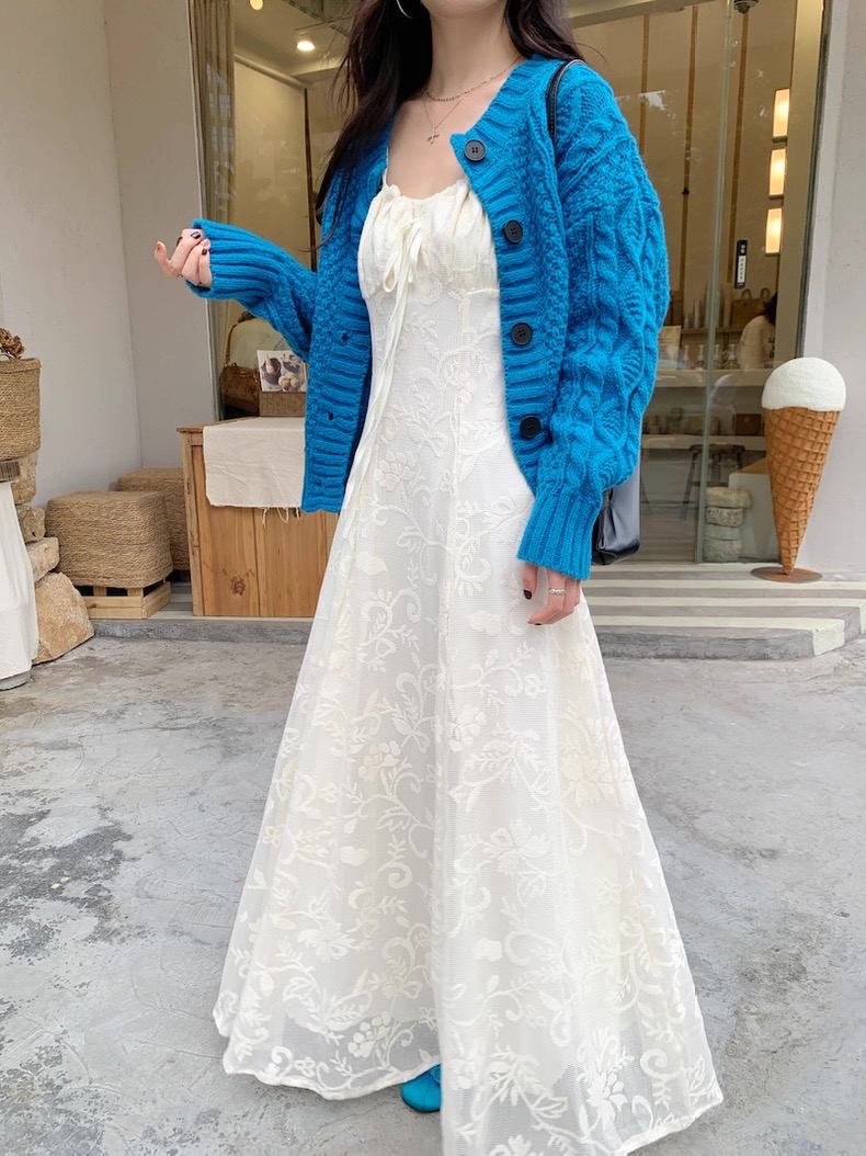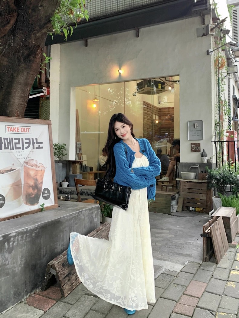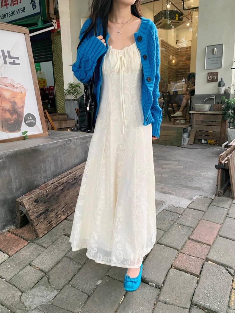 Set đồ mang phong cách nữ tính, nhẹ nhàng và thanh lịch, gồm đầm maxi ren trắng dáng dài phối cùng áo cardigan len mềm...