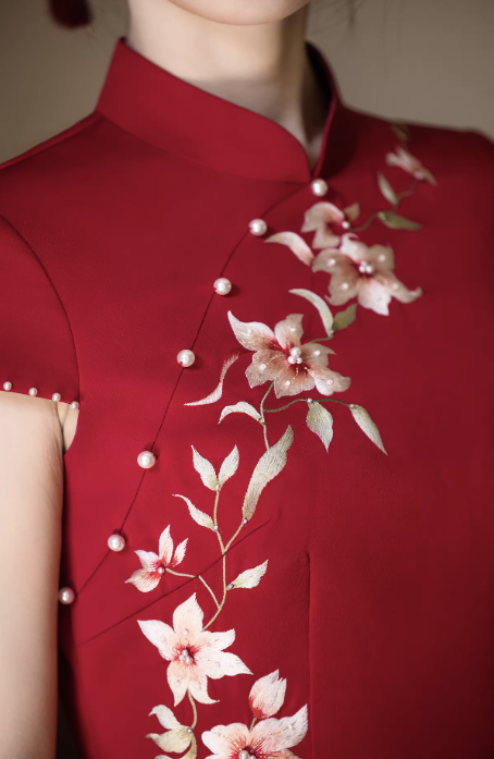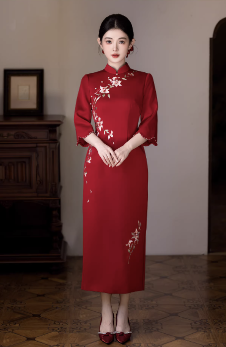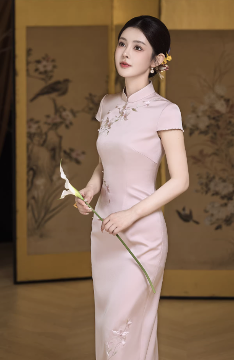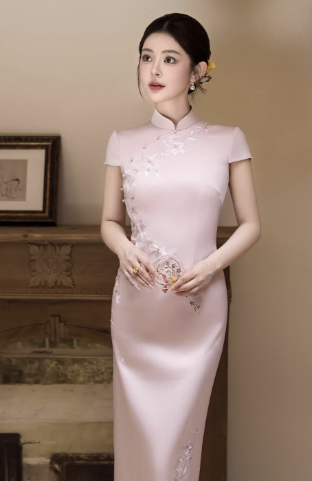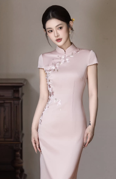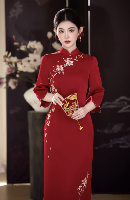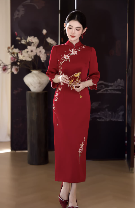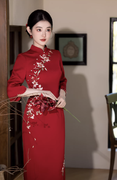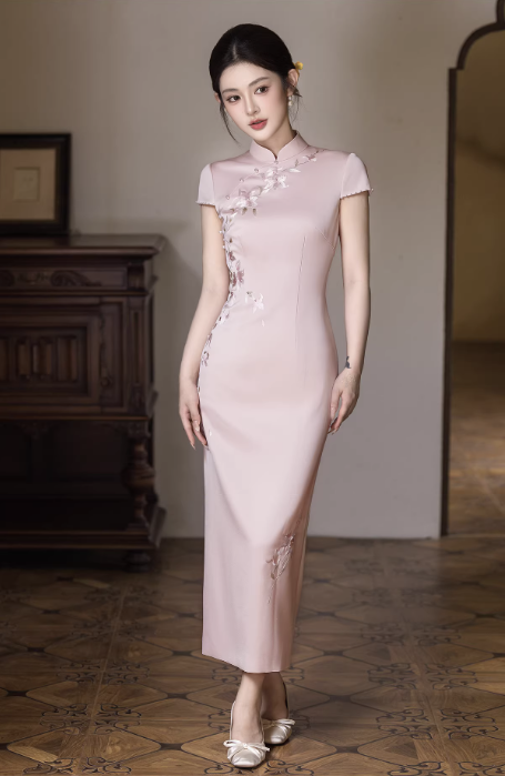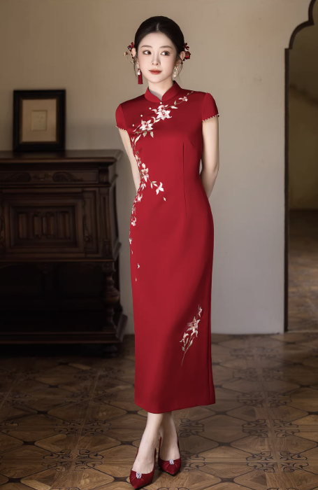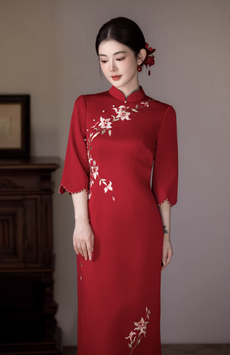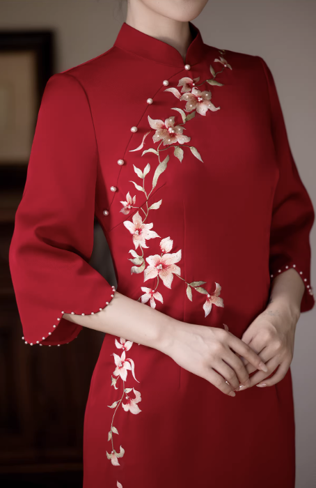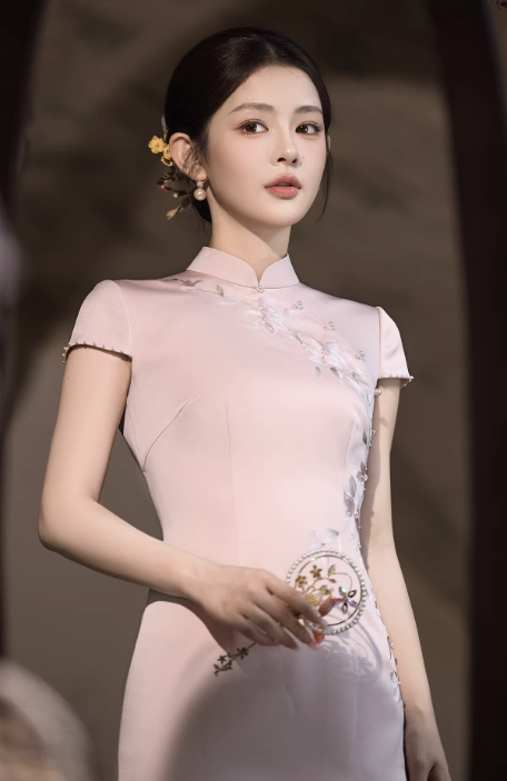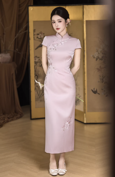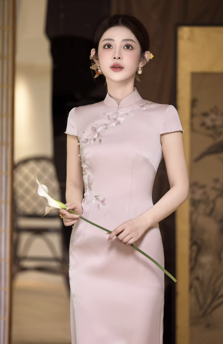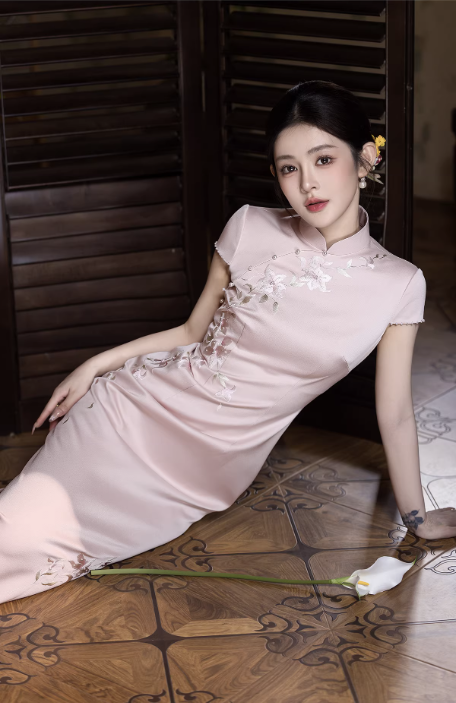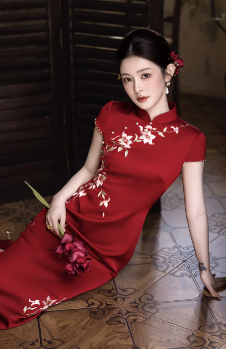 Sườn xám thiết kế dáng dài ôm body, mang phong cách Trung Hoa hiện đại kết hợp nét thanh lịch truyền thống. Điểm nhấn nổi bật là họa tiết hoa thêu tinh xảo chạy dọc thân váy, phối đính ngọc nhẹ nhàng giúp tổng thể trở nên sang trọng và cuốn hút.