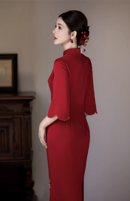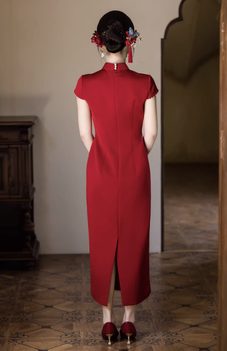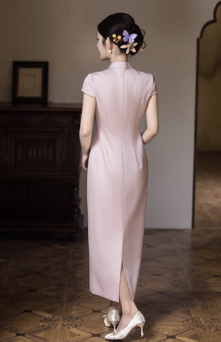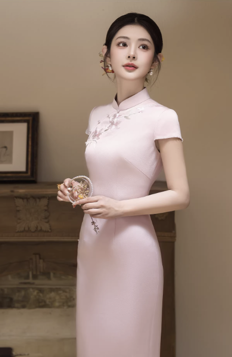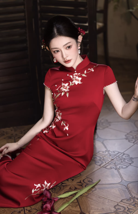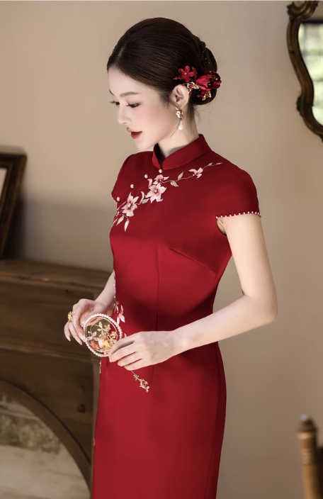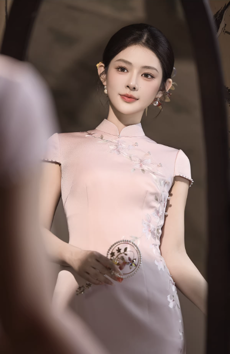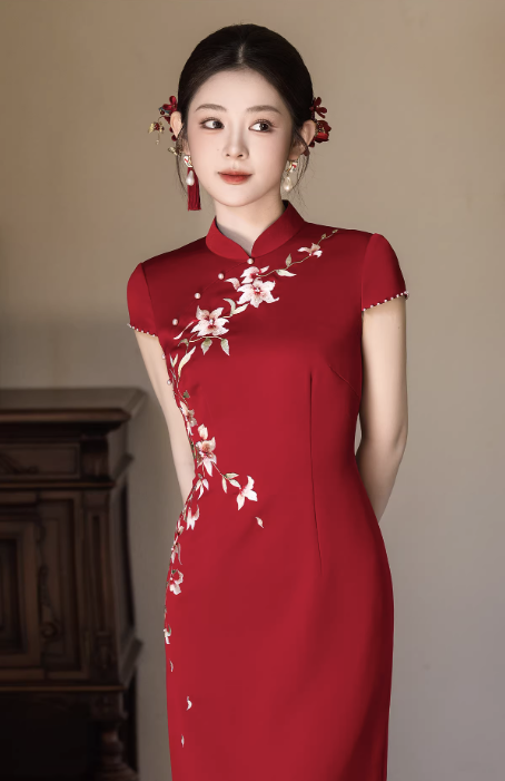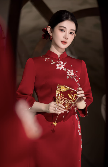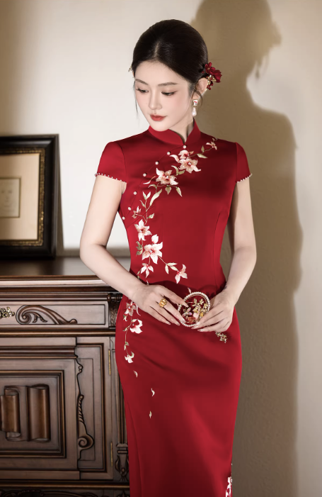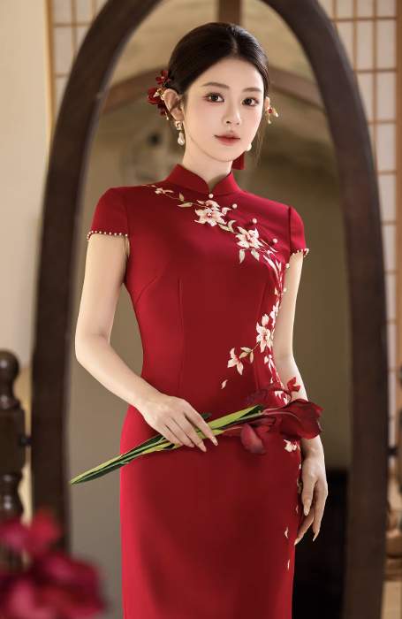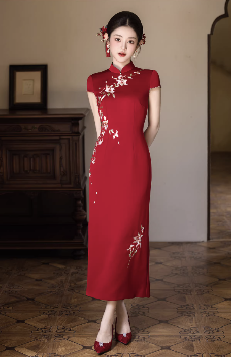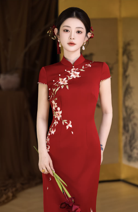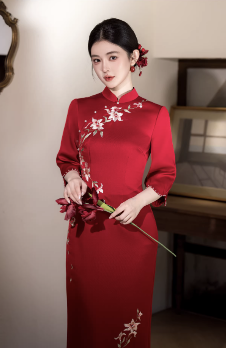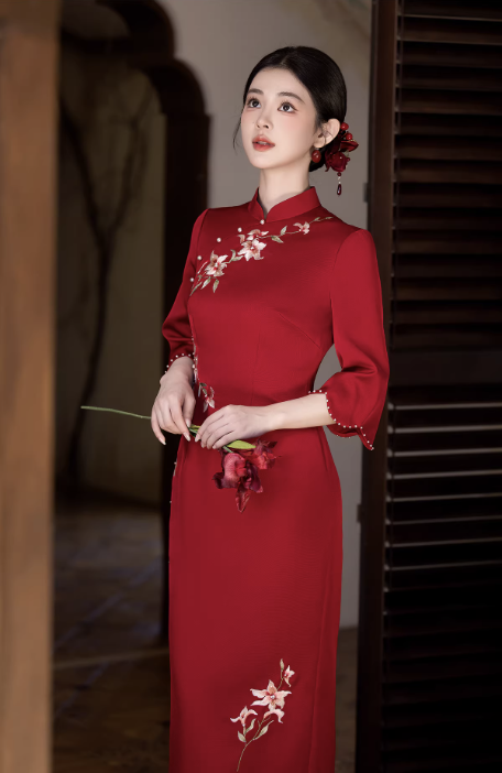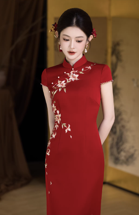 Sườn xám thiết kế dáng dài ôm body, mang phong cách Trung Hoa hiện đại kết hợp nét thanh lịch truyền thống. Điểm nhấn nổi bật là họa tiết hoa thêu tinh xảo chạy dọc thân váy, phối đính ngọc nhẹ nhàng giúp tổng thể trở nên sang trọng và cuốn hút.