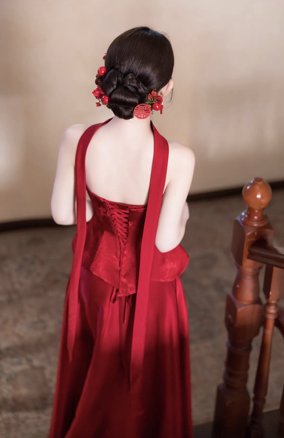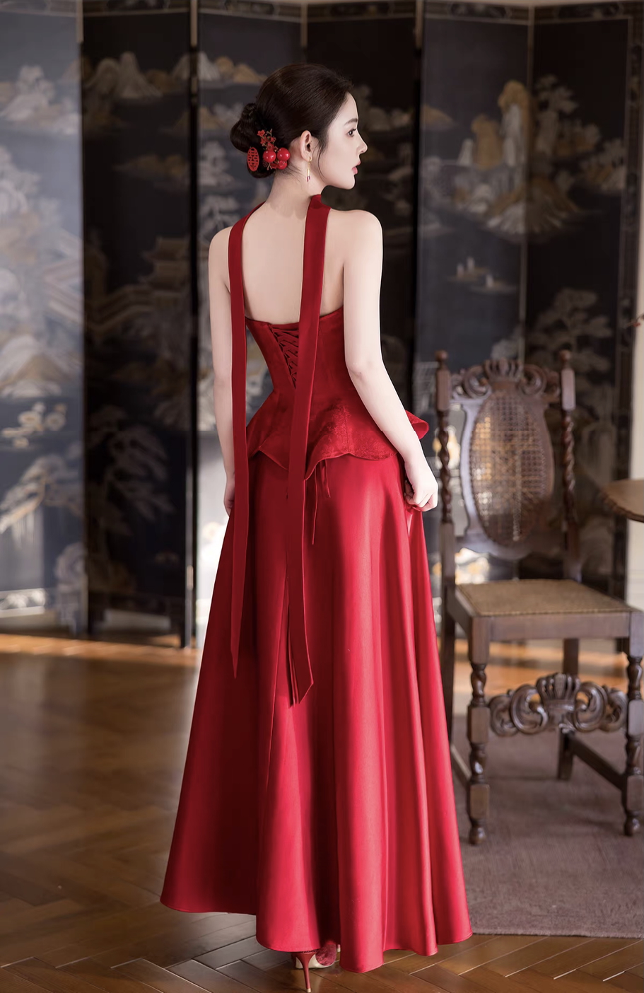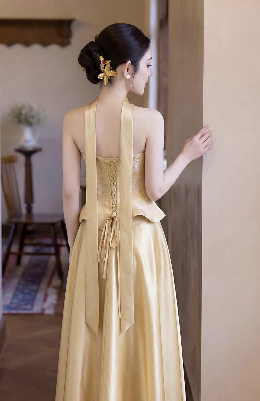 Sườn xám cách tân thiết kế cổ yếm hiện đại, tôn lên phần vai và cổ thanh thoát, mang lại vẻ ngoài vừa quyến rũ vừa sang trọng. Form ôm nhẹ kết hợp dáng peplum giúp định hình vòng eo, tạo hiệu ứng thon gọn và cân đối cơ thể.
