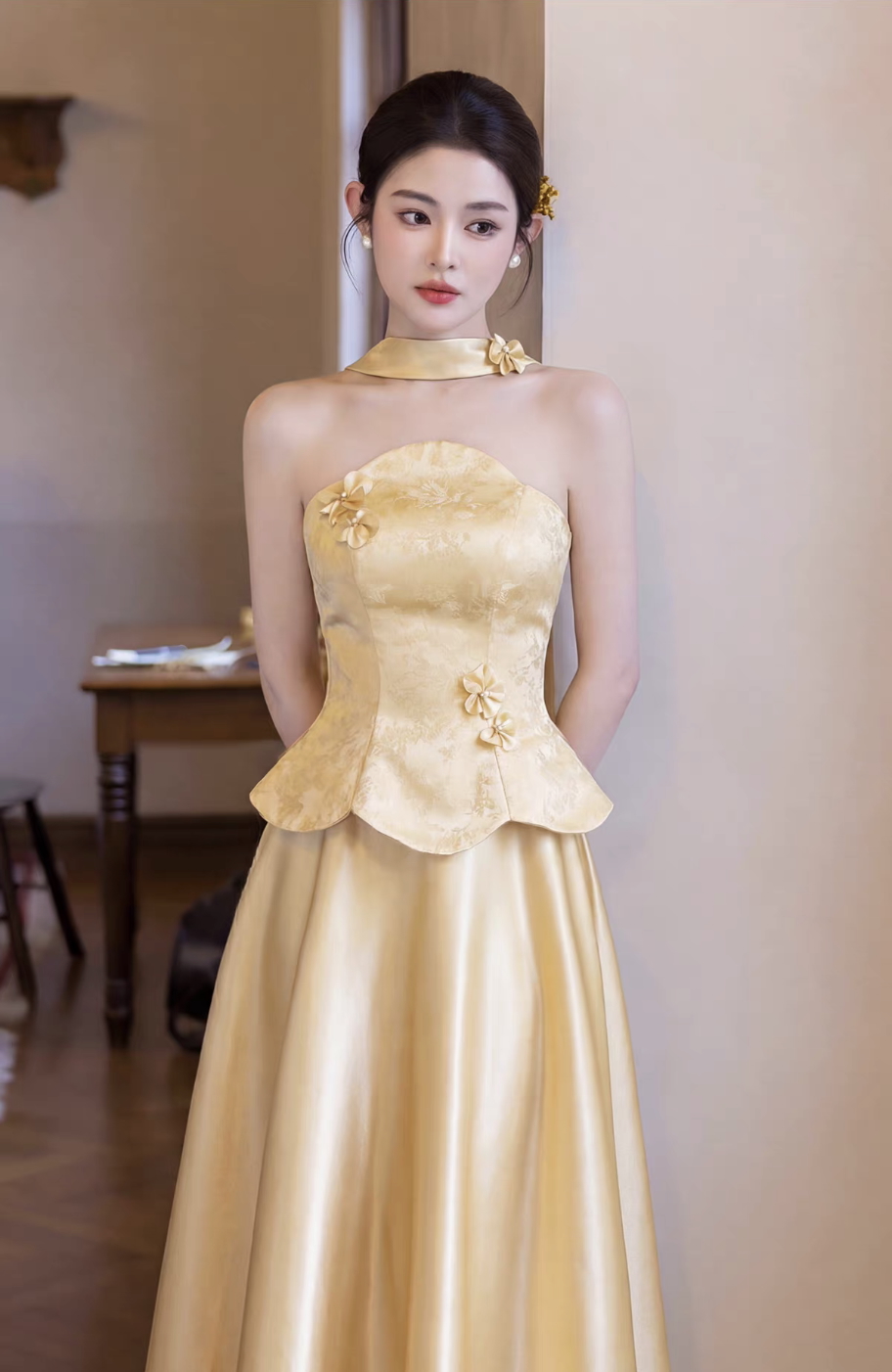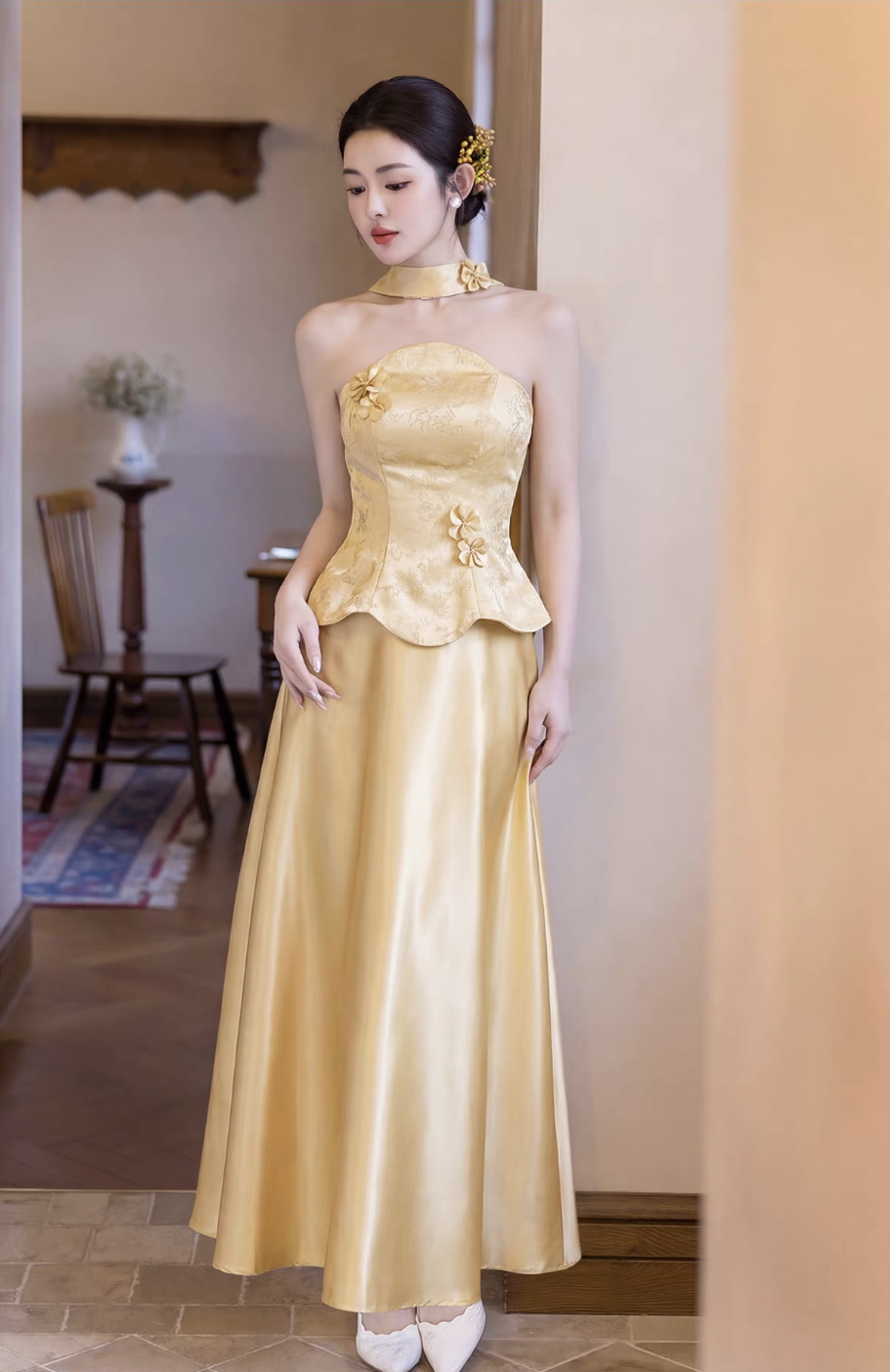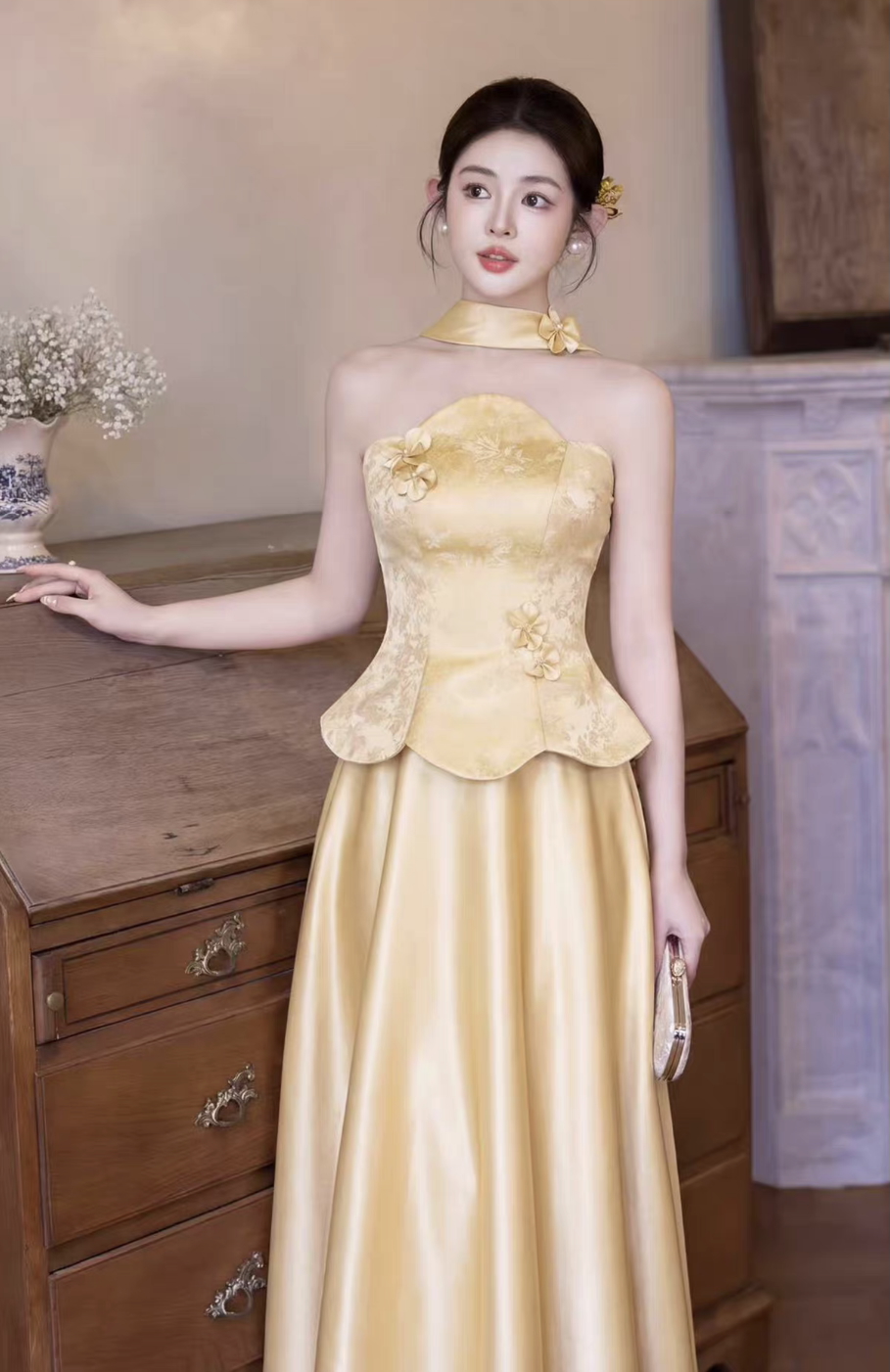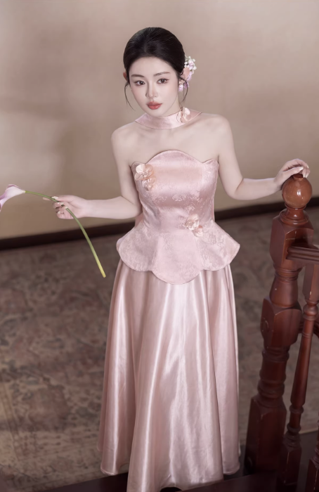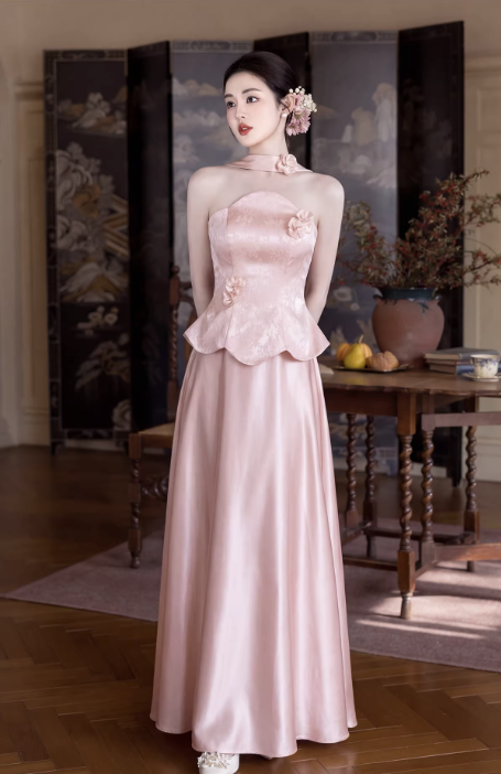 – Kiểu dáng: Sườn xám cách tân, cổ yếm, peplum