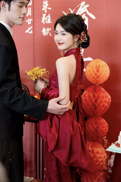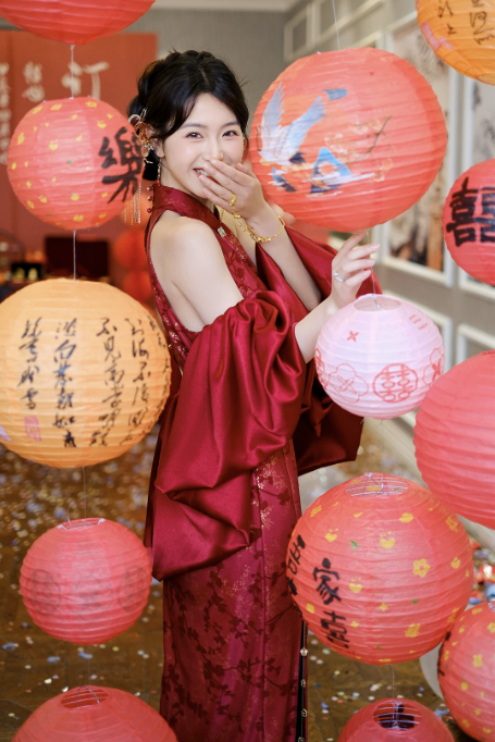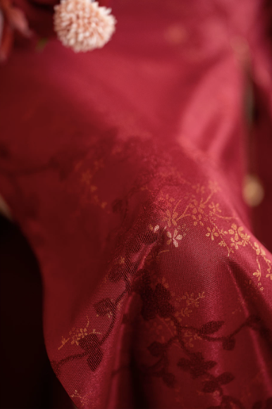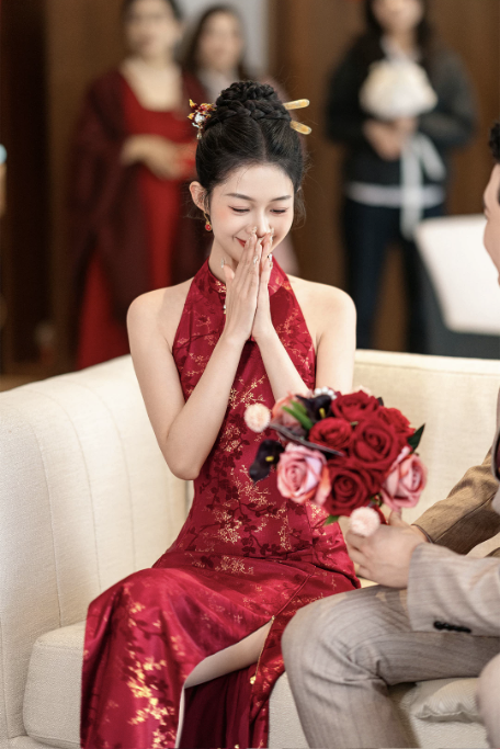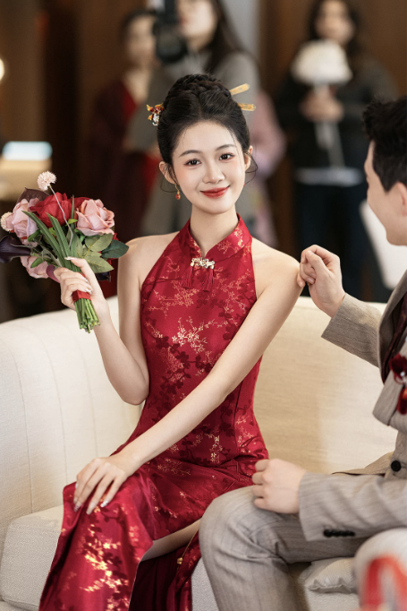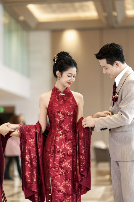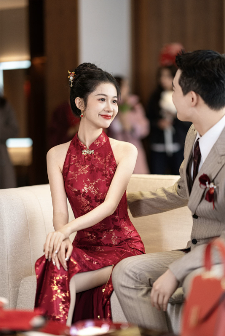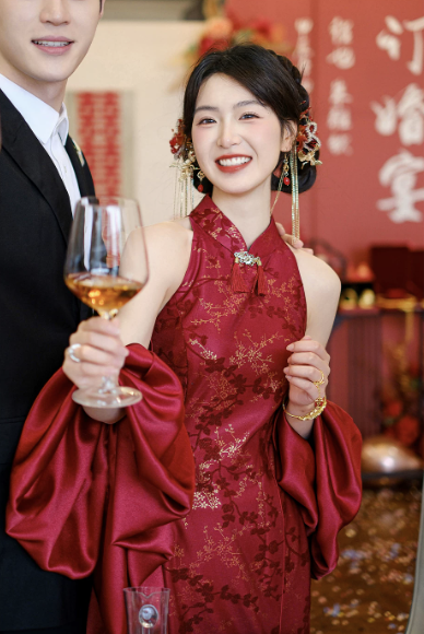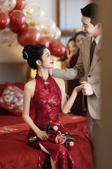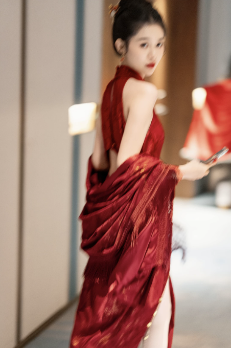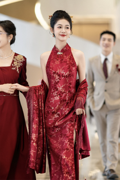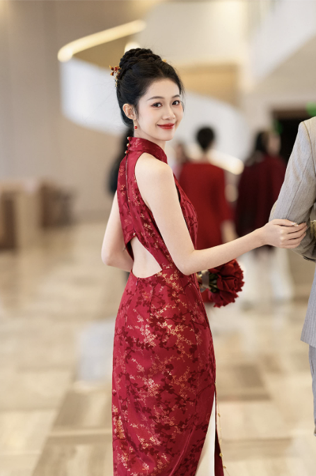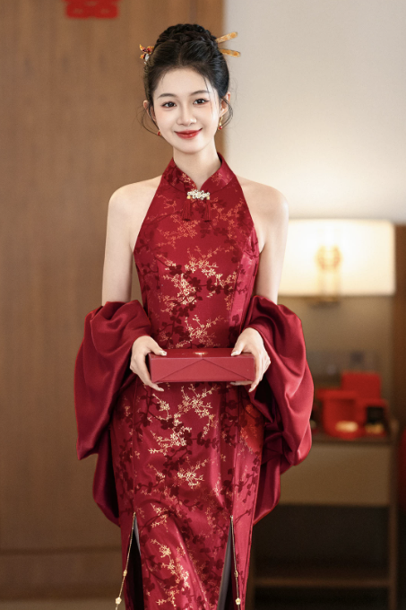 Thiết kế sườn xám dáng dài cổ yếm thanh lịch, mang đậm phong cách Trung Hoa hiện đại. Gam màu đỏ nổi bật kết hợp họa tiết gấm hoa ánh kim tinh xảo, tạo hiệu ứng sang trọng, quý phái – cực kỳ phù hợp cho các dịp cưới hỏi, lễ nghi và sự kiện.