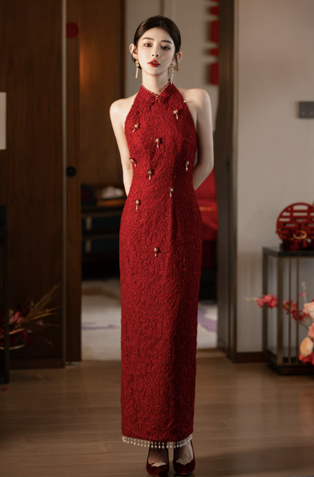 Sườn xám thiết kế dáng dài ôm body tôn dáng, mang vẻ đẹp quyến rũ pha nét cổ điển, cực kỳ phù hợp cho các dịp cưới hỏi, tiệc sang trọng.