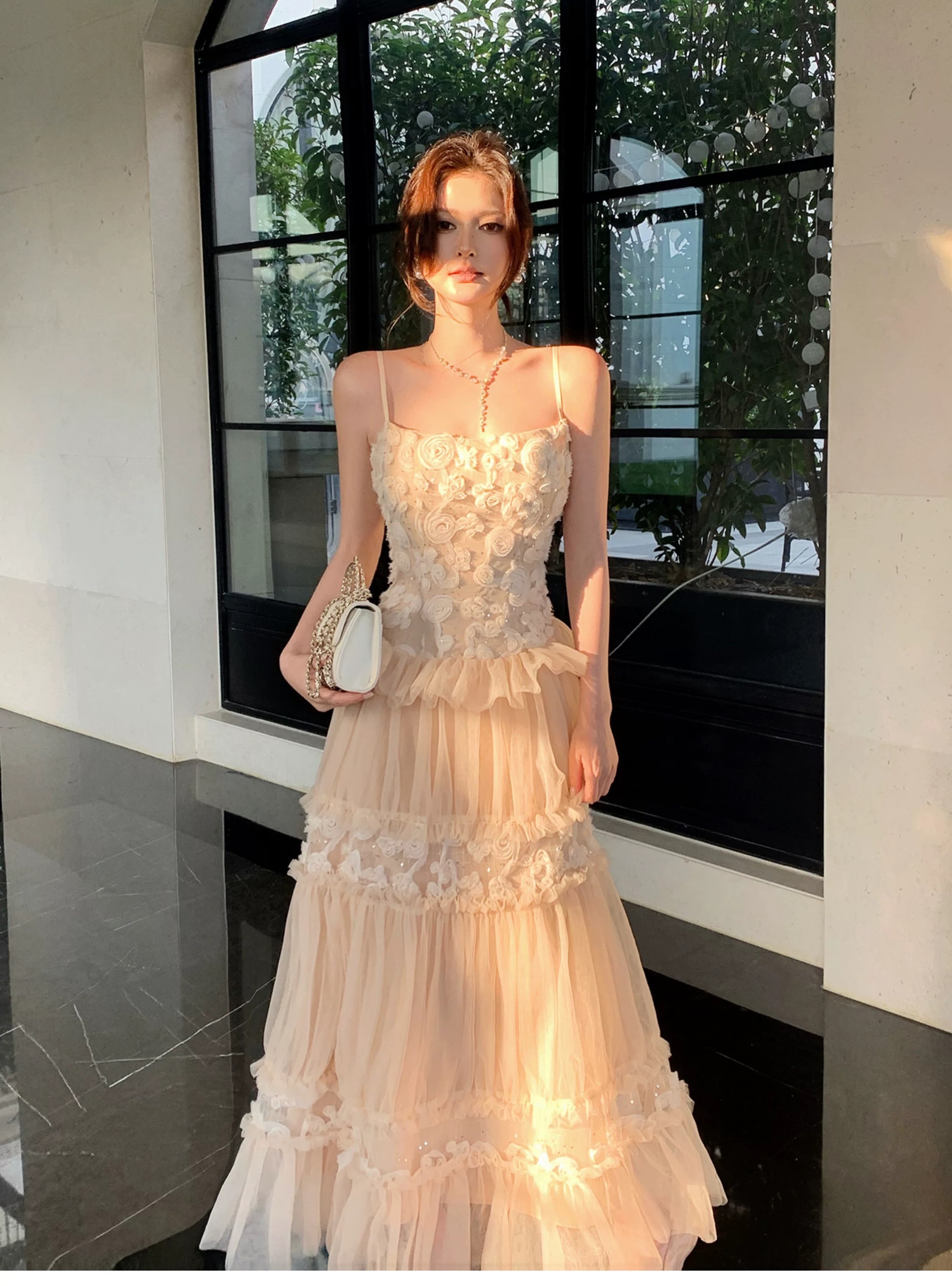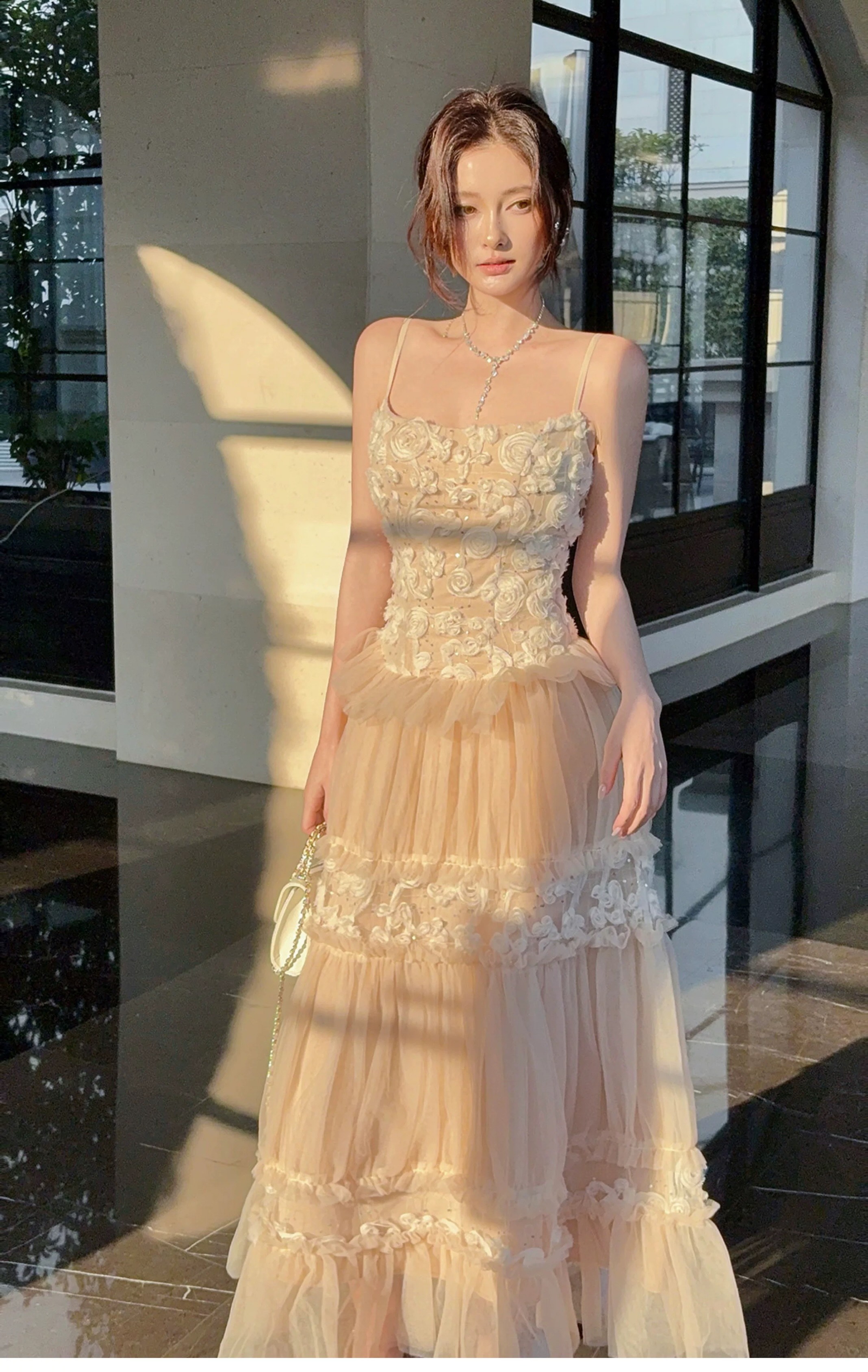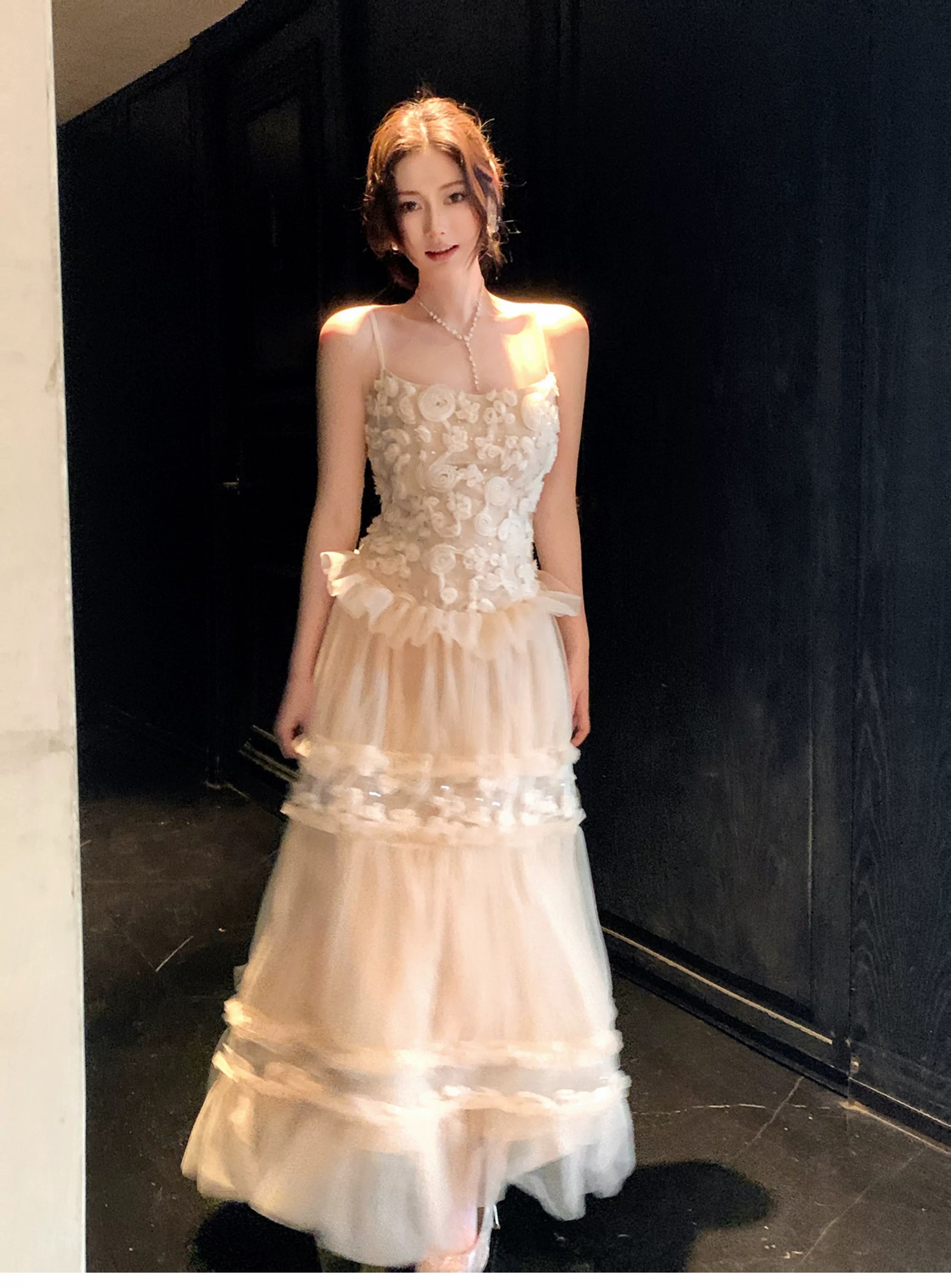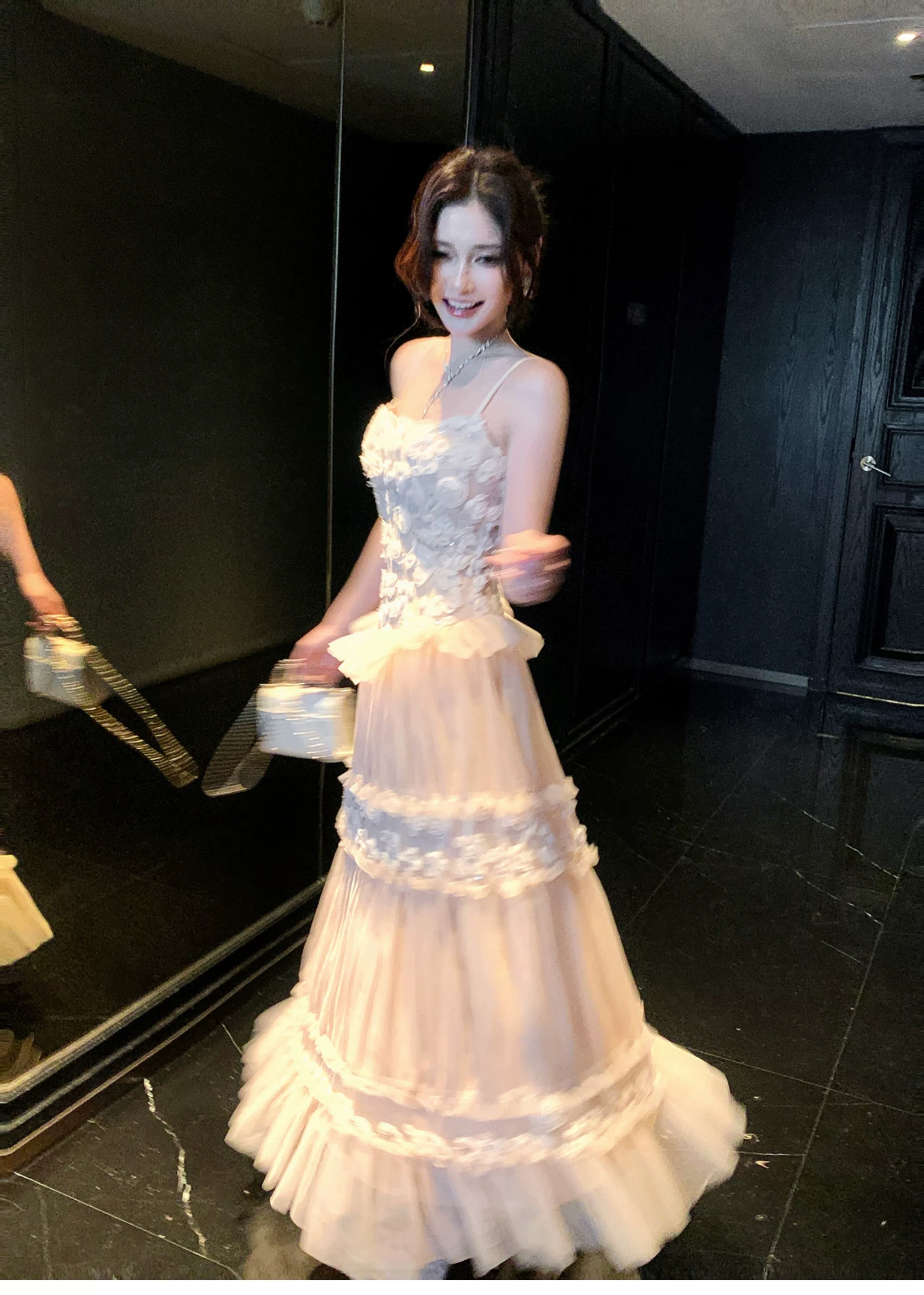 Váy hai dây dáng dài thiết kế nữ tính, nổi bật với chi tiết hoa 3D đính thân áo kết hợp tầng voan xếp bèo...