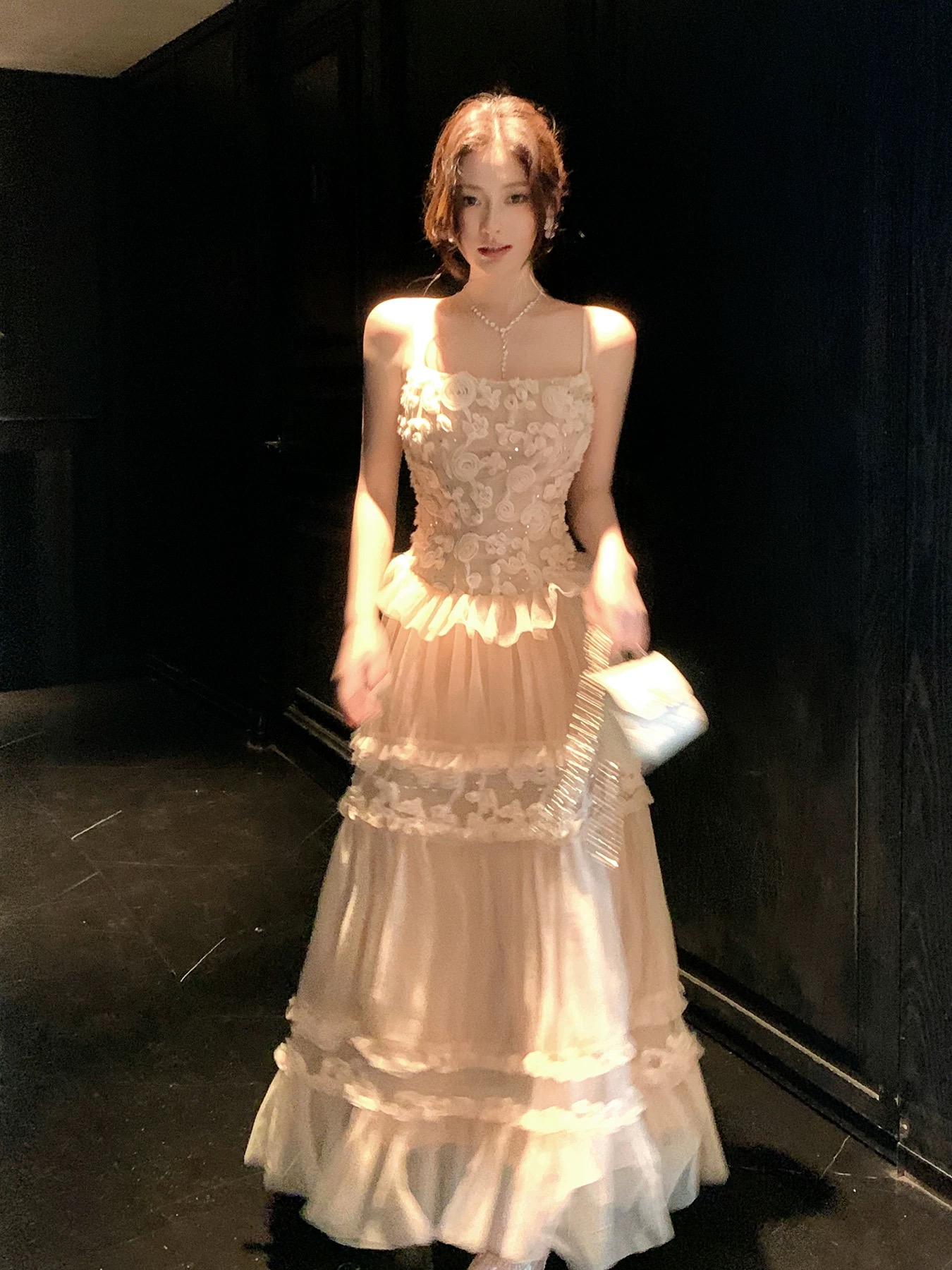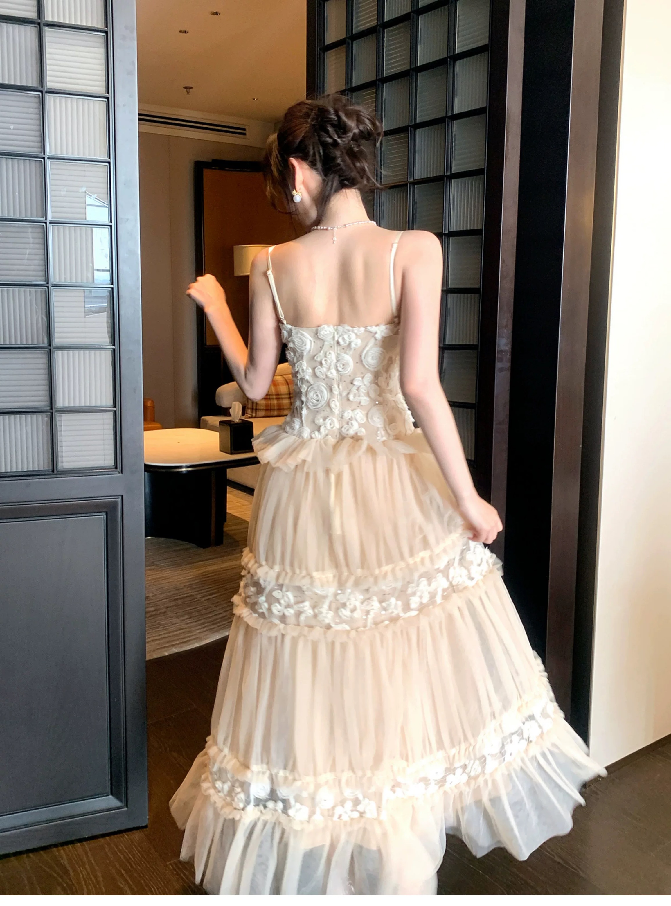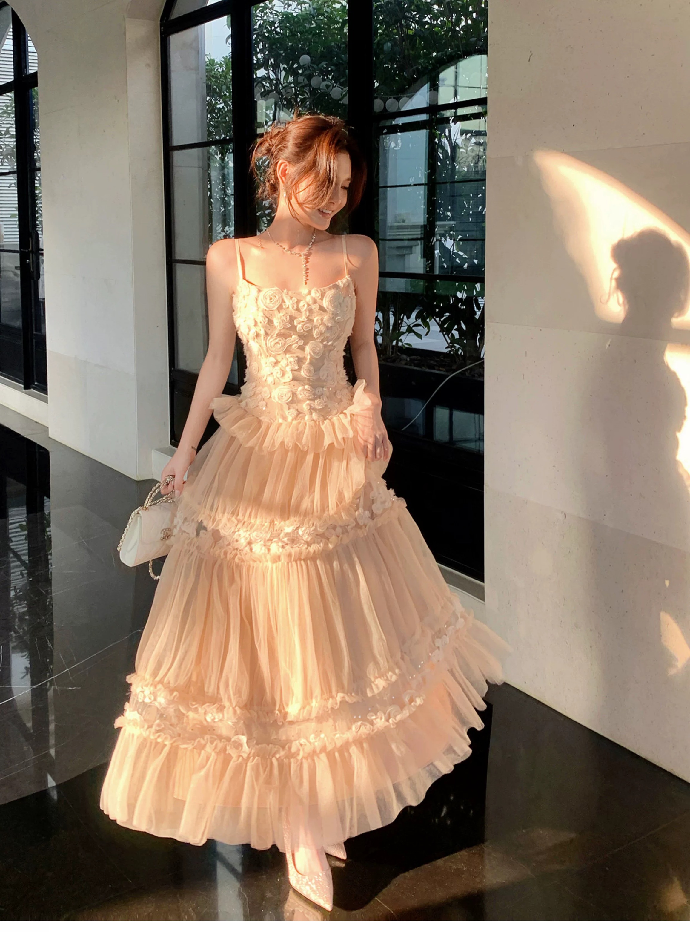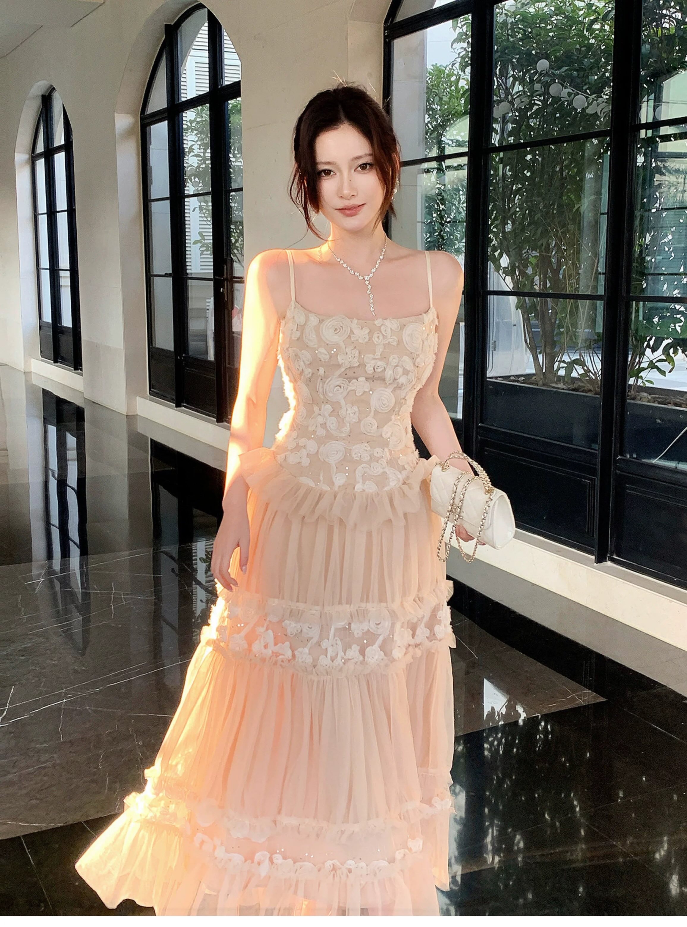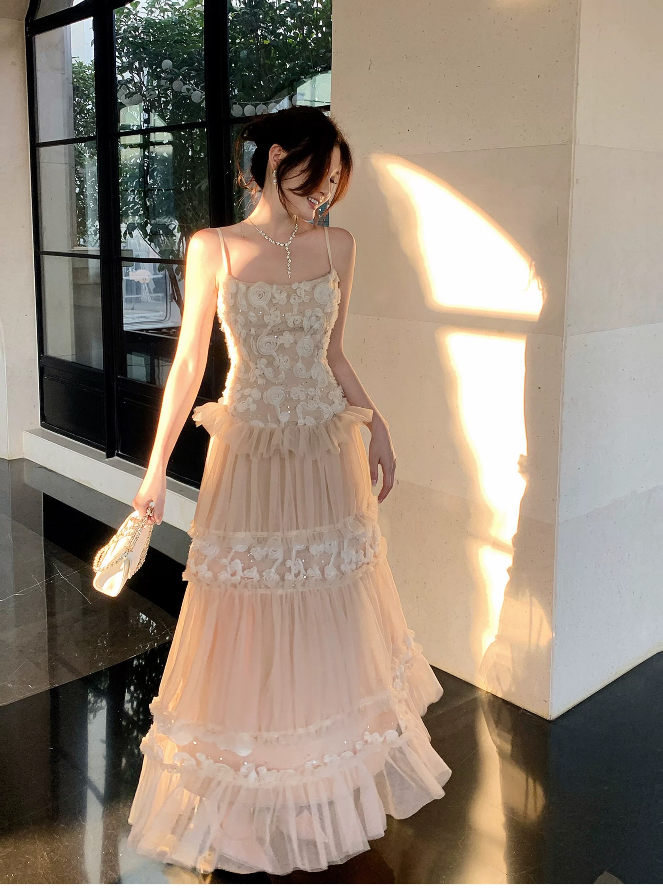 Váy hai dây dáng dài thiết kế nữ tính, nổi bật với chi tiết hoa 3D đính thân áo kết hợp tầng voan xếp bèo...