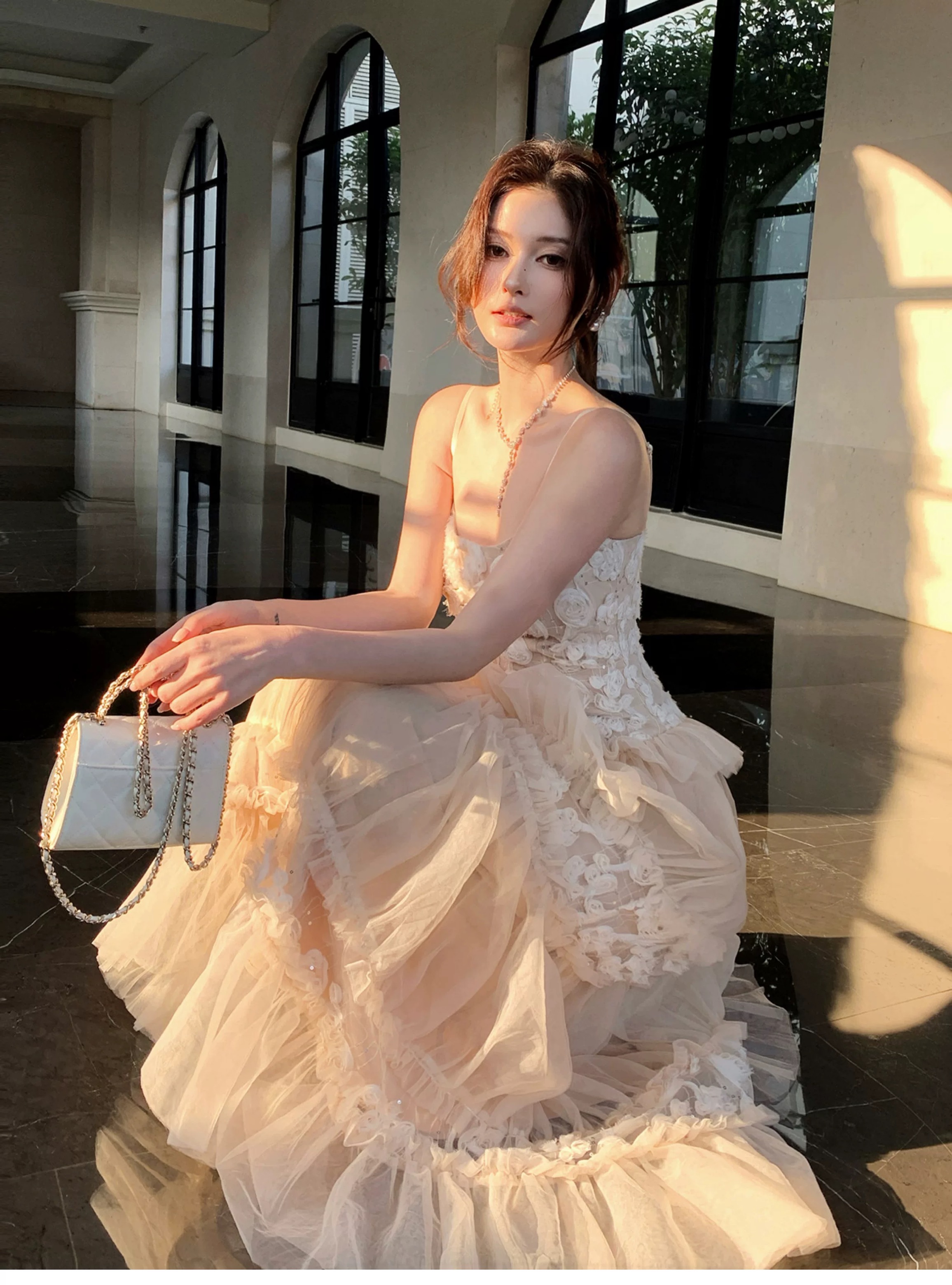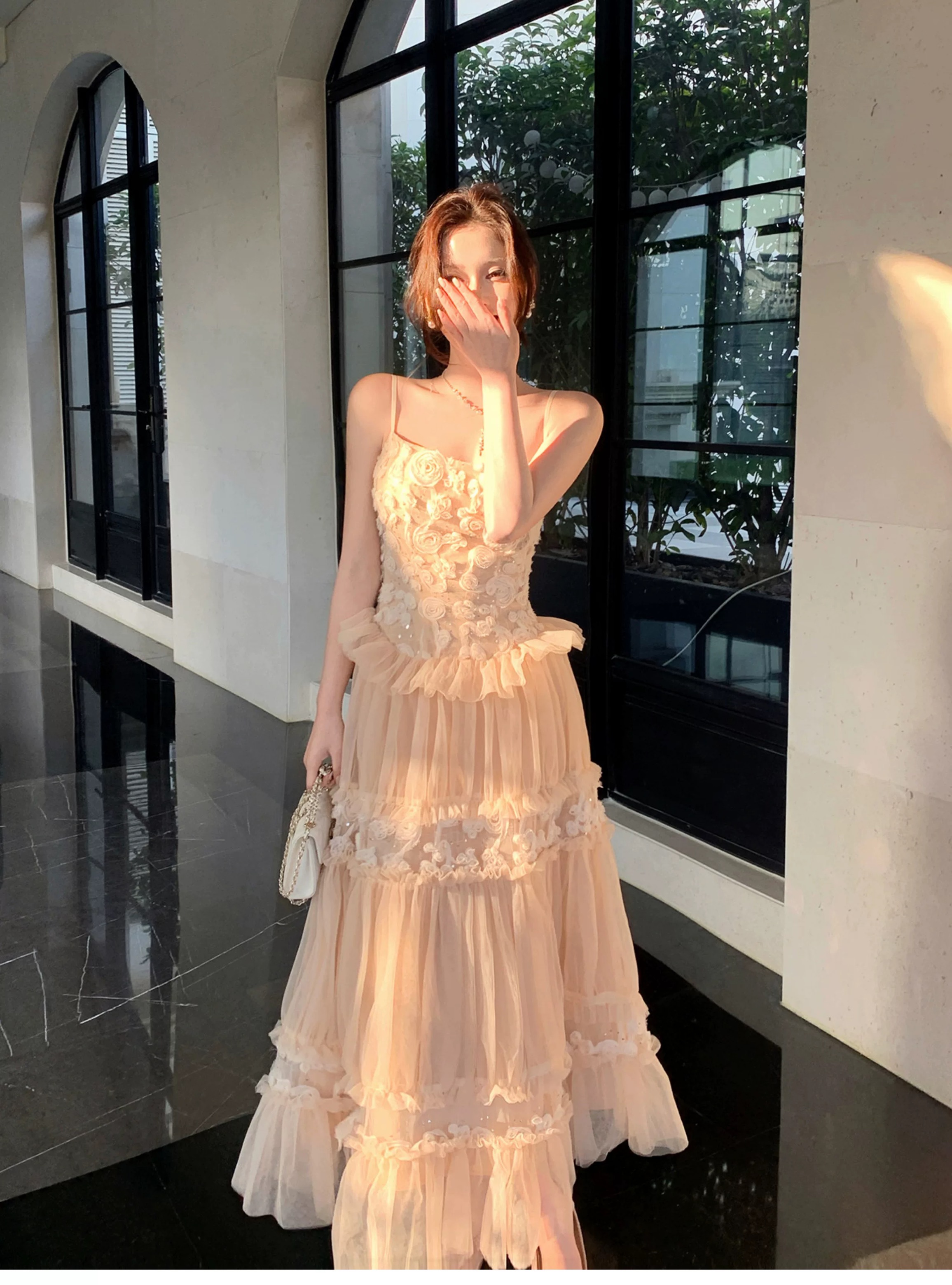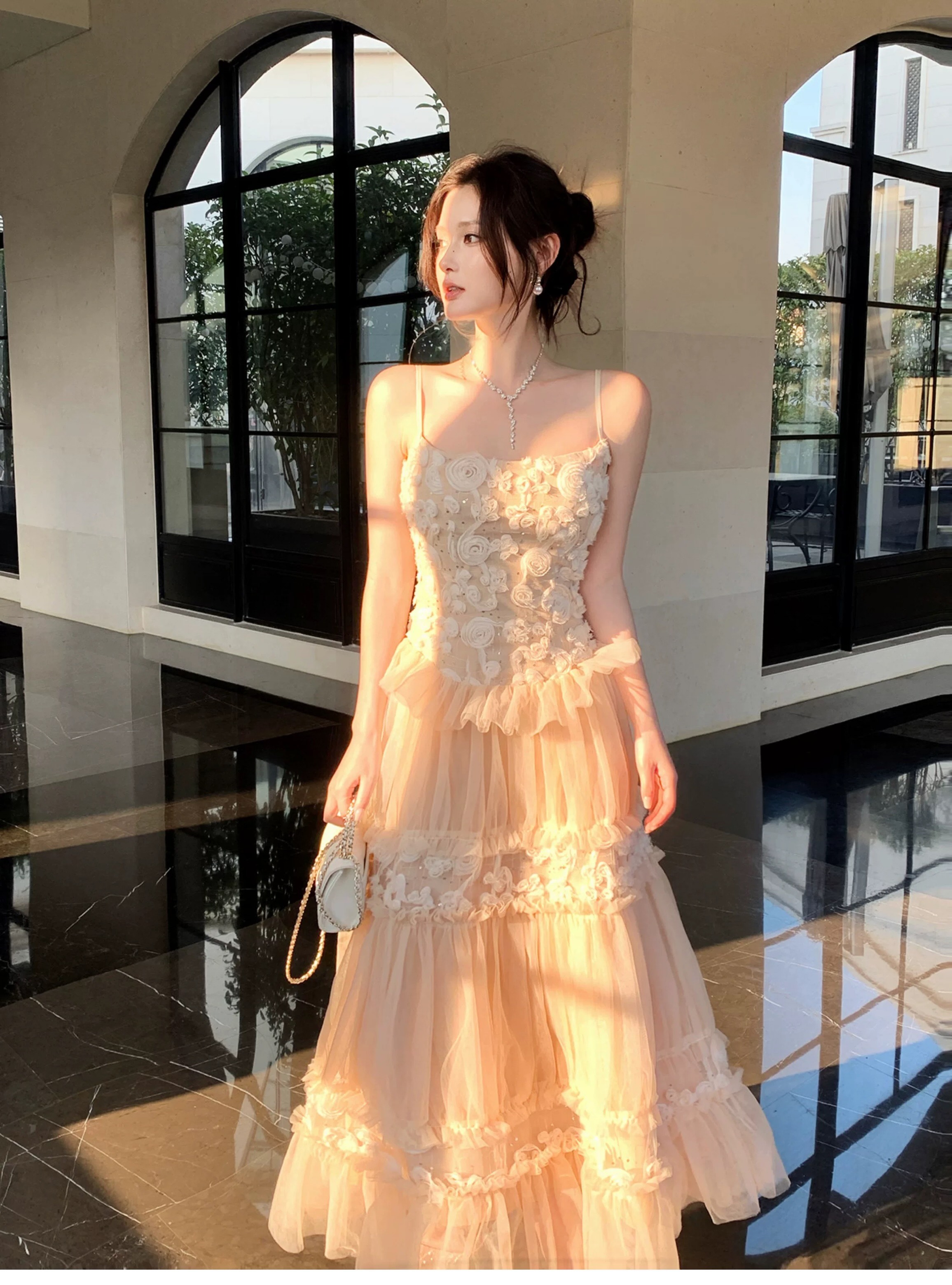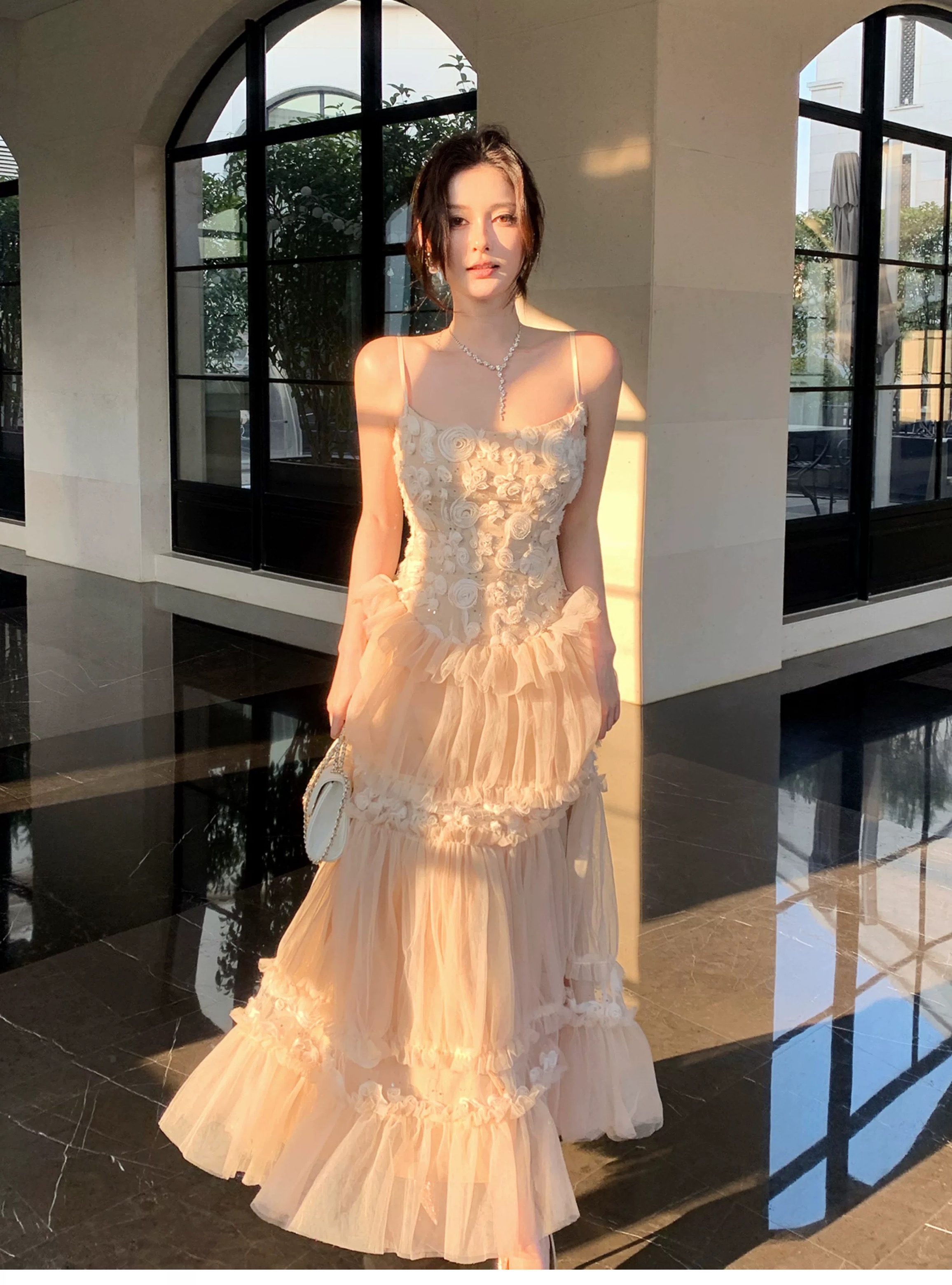 Váy hai dây dáng dài thiết kế nữ tính, nổi bật với chi tiết hoa 3D đính thân áo kết hợp tầng voan xếp bèo...