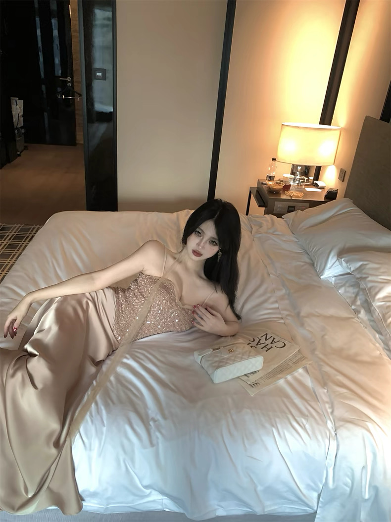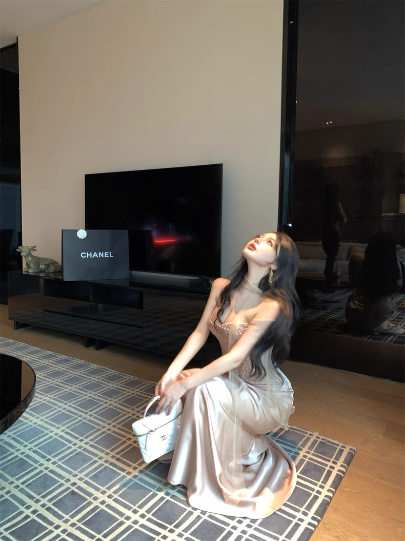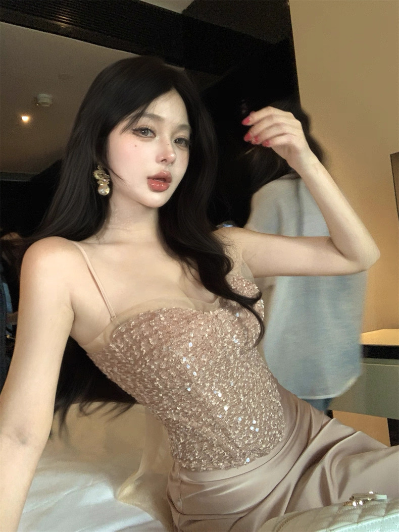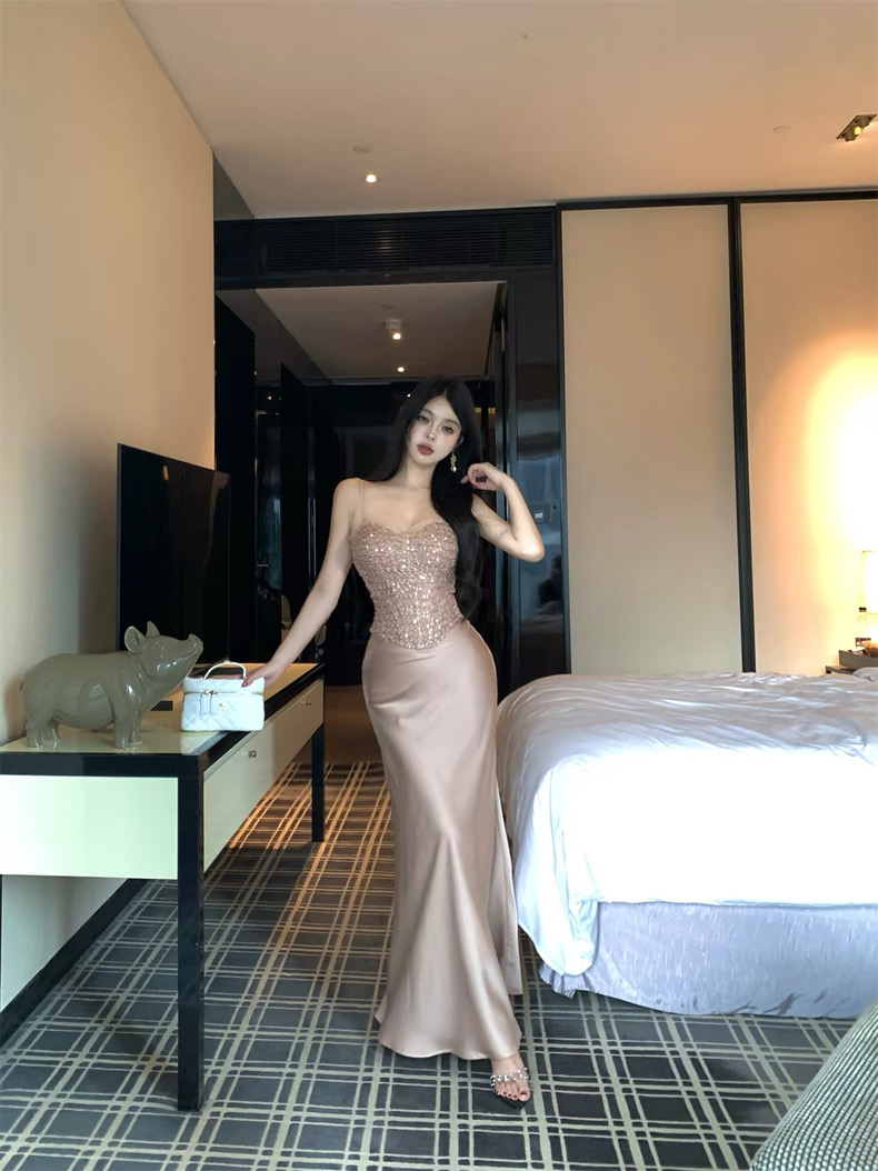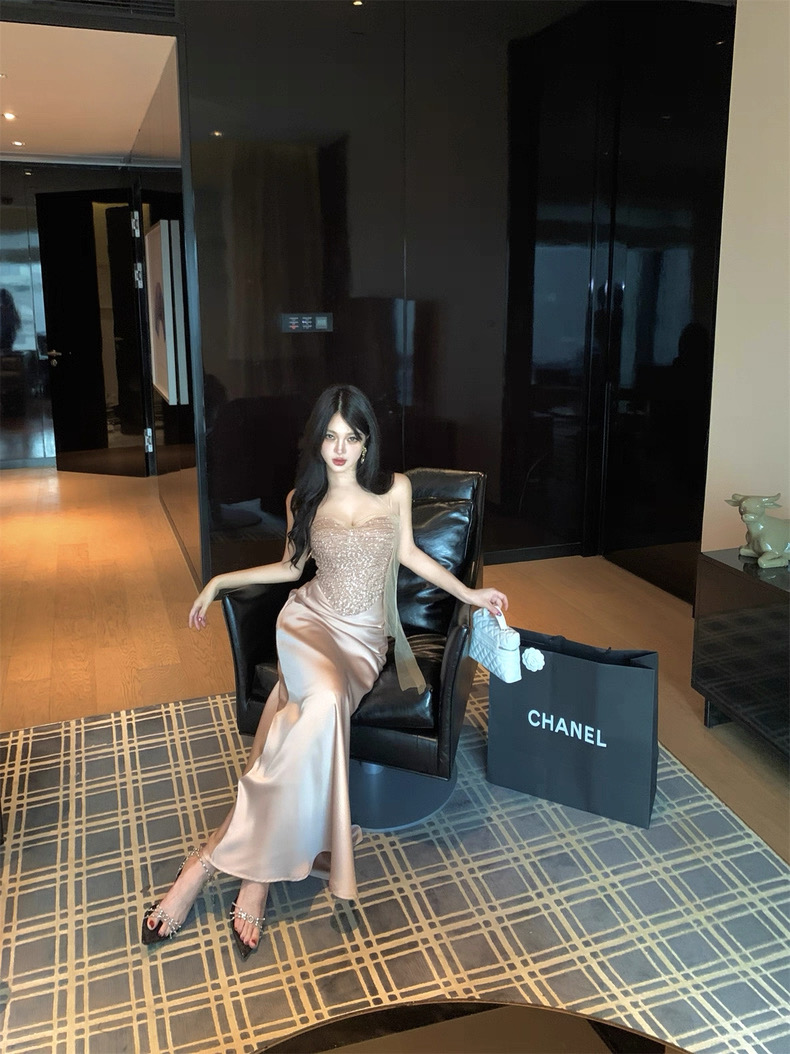 Thiết kế gồm áo cúp ngực đính đá lấp lánh kết hợp chân váy dài ôm dáng, mang phong cách sang chảnh và quyến rũ....