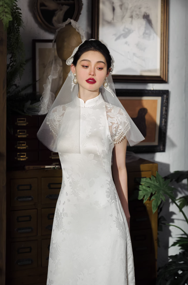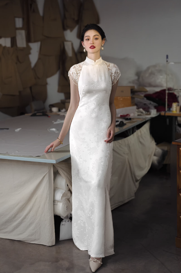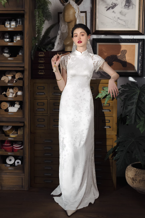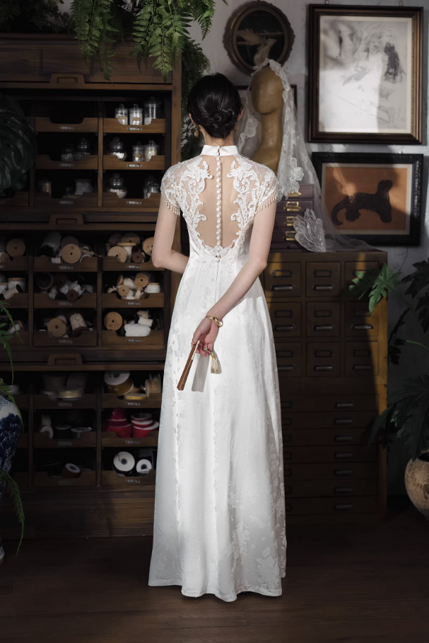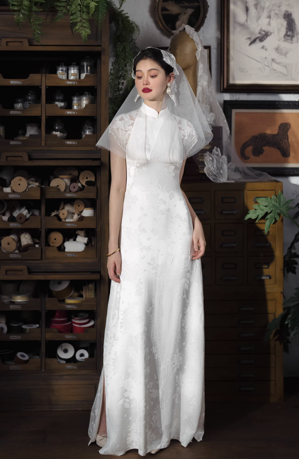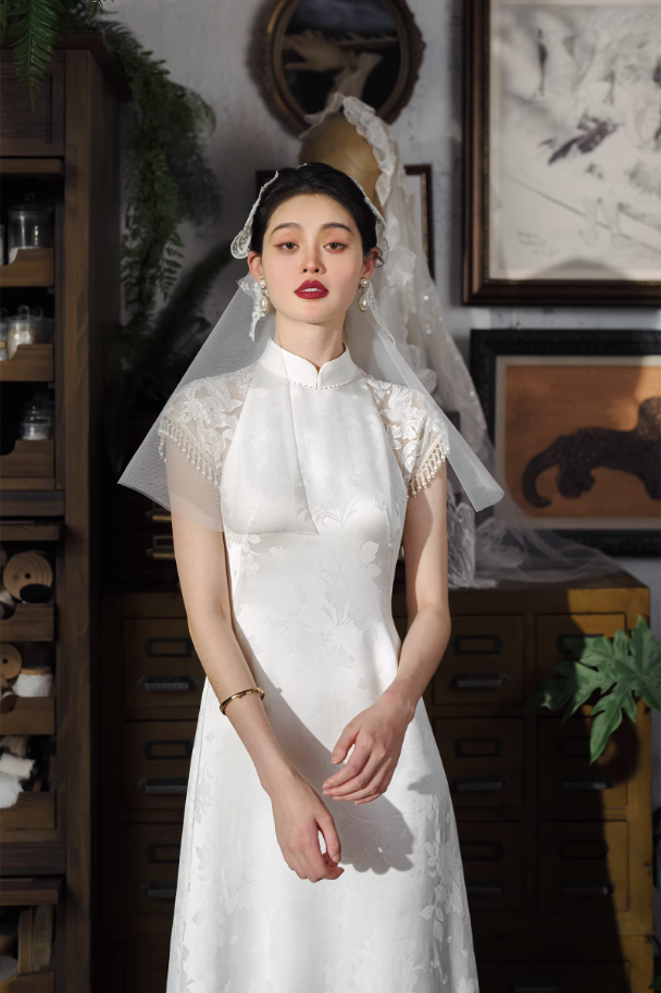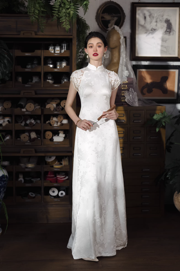 Váy cưới cổ cao dáng dài thanh lịch, thiết kế ôm nhẹ theo đường cong cơ thể giúp tôn dáng và tạo cảm giác thon gọn. Phần vai và tay phối ren tinh tế mang lại vẻ mềm mại, nữ tính nhưng vẫn giữ nét sang trọng. Chất liệu vải hoa chìm nhẹ nhàng, tạo hiệu ứng thanh lịch và trang nhã, phù hợp cho lễ cưới, chụp ảnh cưới hoặc tiệc cưới phong cách tối giản.