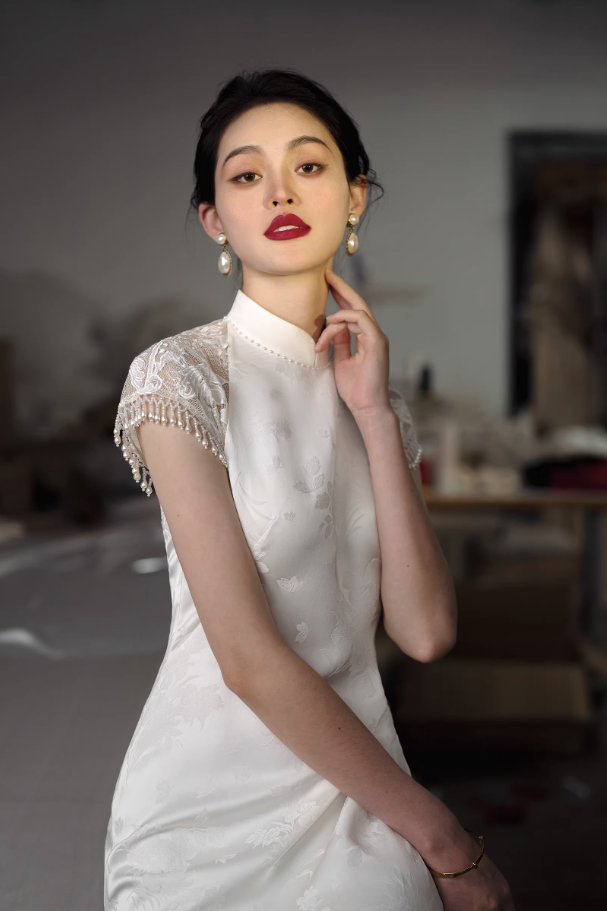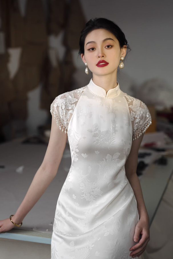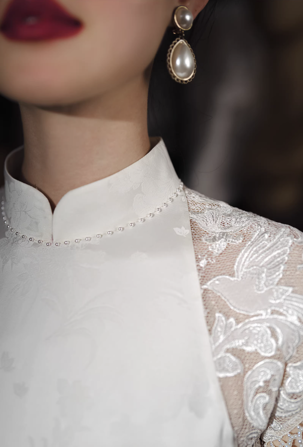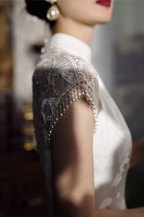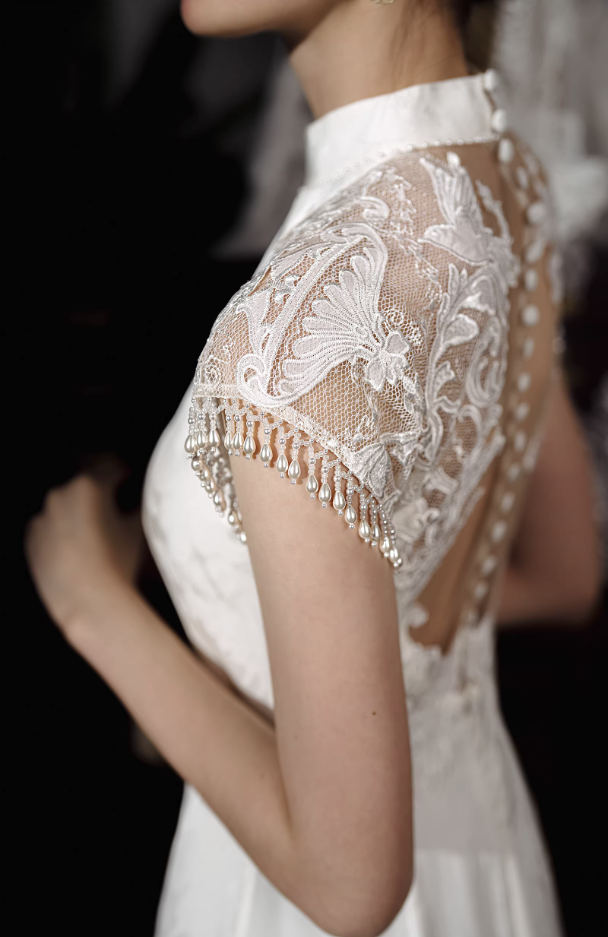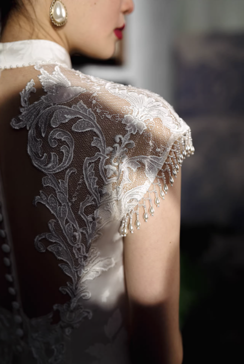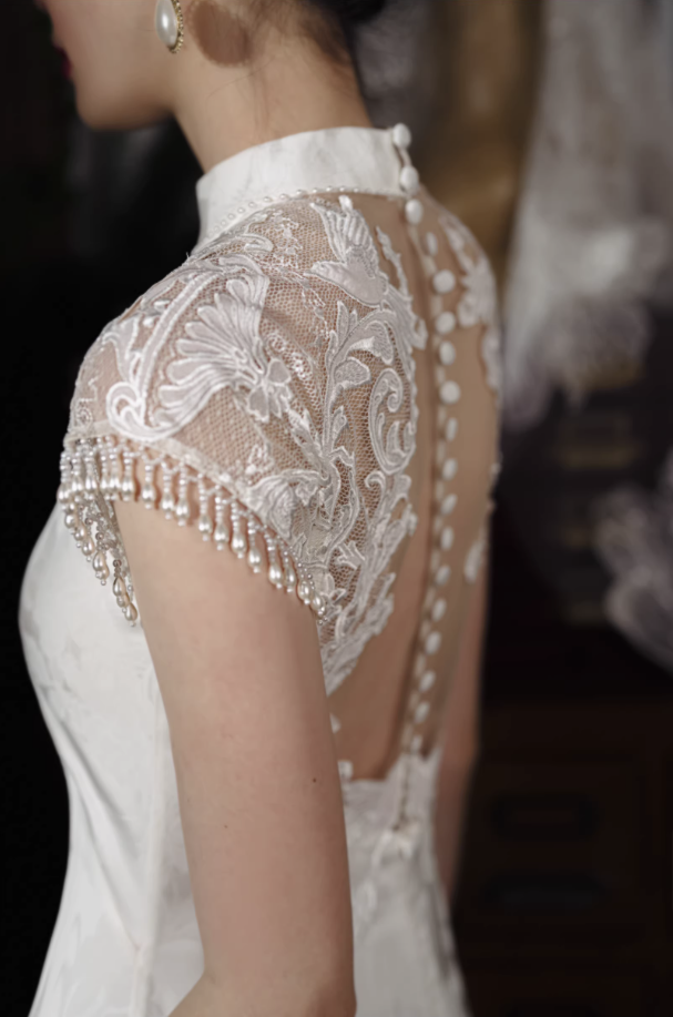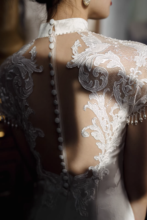 Váy cưới cổ cao dáng dài thanh lịch, thiết kế ôm nhẹ theo đường cong cơ thể giúp tôn dáng và tạo cảm giác thon gọn. Phần vai và tay phối ren tinh tế mang lại vẻ mềm mại, nữ tính nhưng vẫn giữ nét sang trọng. Chất liệu vải hoa chìm nhẹ nhàng, tạo hiệu ứng thanh lịch và trang nhã, phù hợp cho lễ cưới, chụp ảnh cưới hoặc tiệc cưới phong cách tối giản.