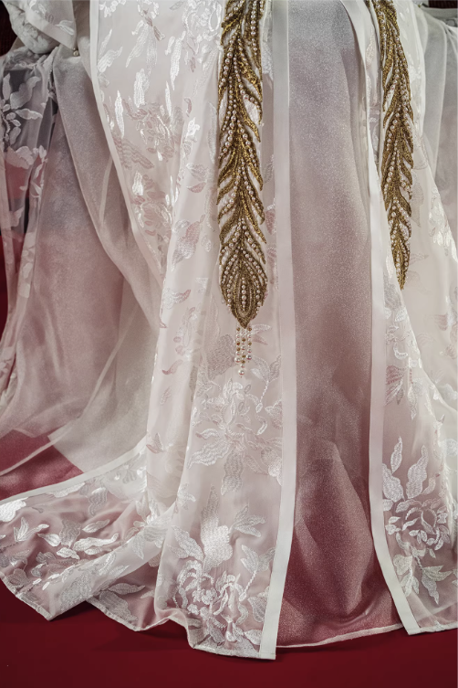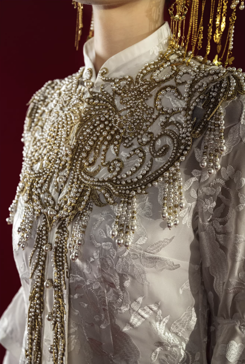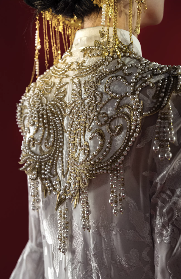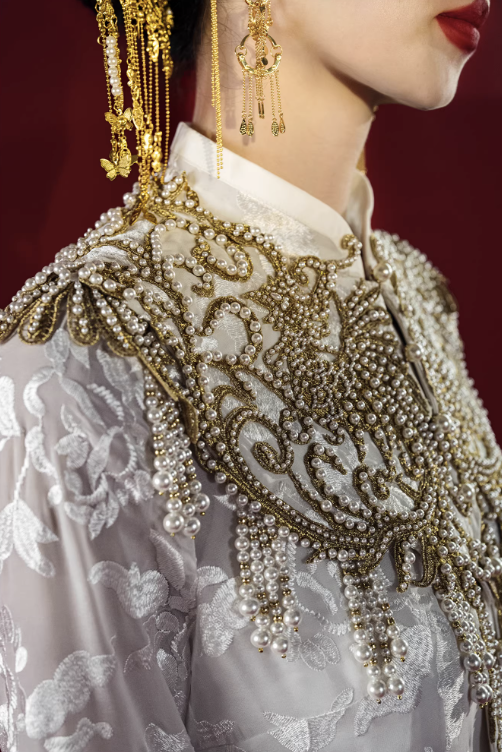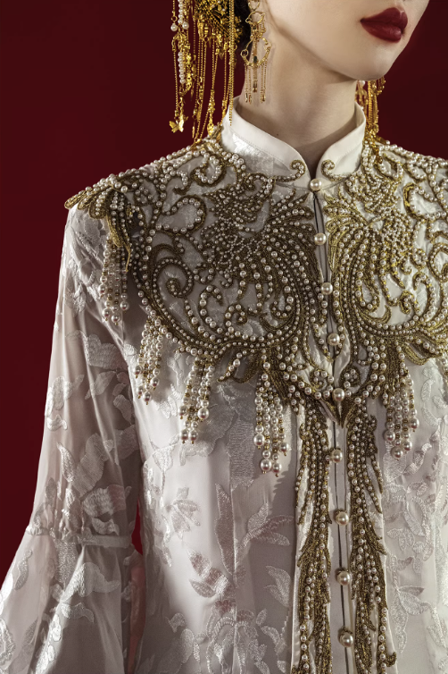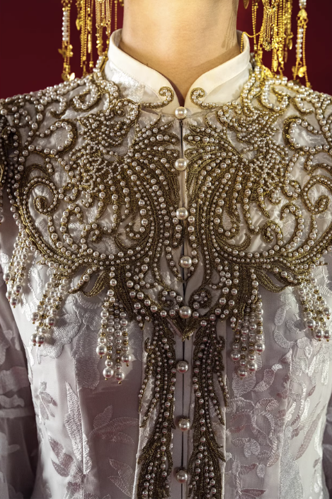 Mẫu váy cưới mang phong cách Trung Hoa cổ điển kết hợp nét sang trọng hiện đại. Thiết kế cổ cao thanh lịch giúp tôn lên đường cổ và tạo vẻ trang nhã, quý phái. Phần thân trên được thêu họa tiết tinh xảo kết hợp đính ngọc trai và chi tiết ánh kim nổi bật, tạo điểm nhấn sang trọng và độc đáo.