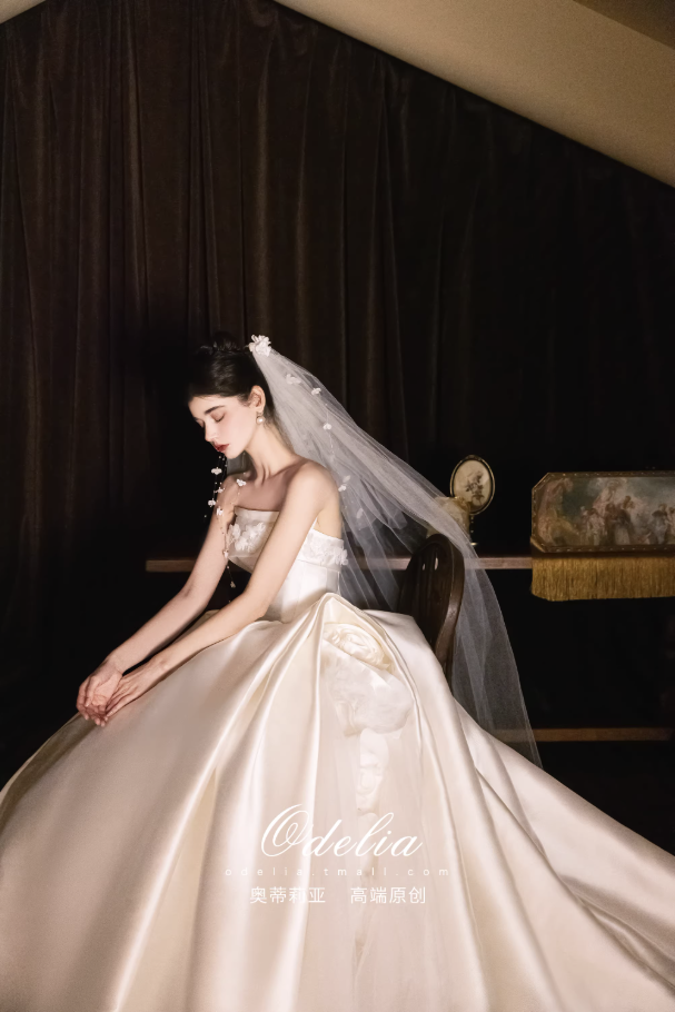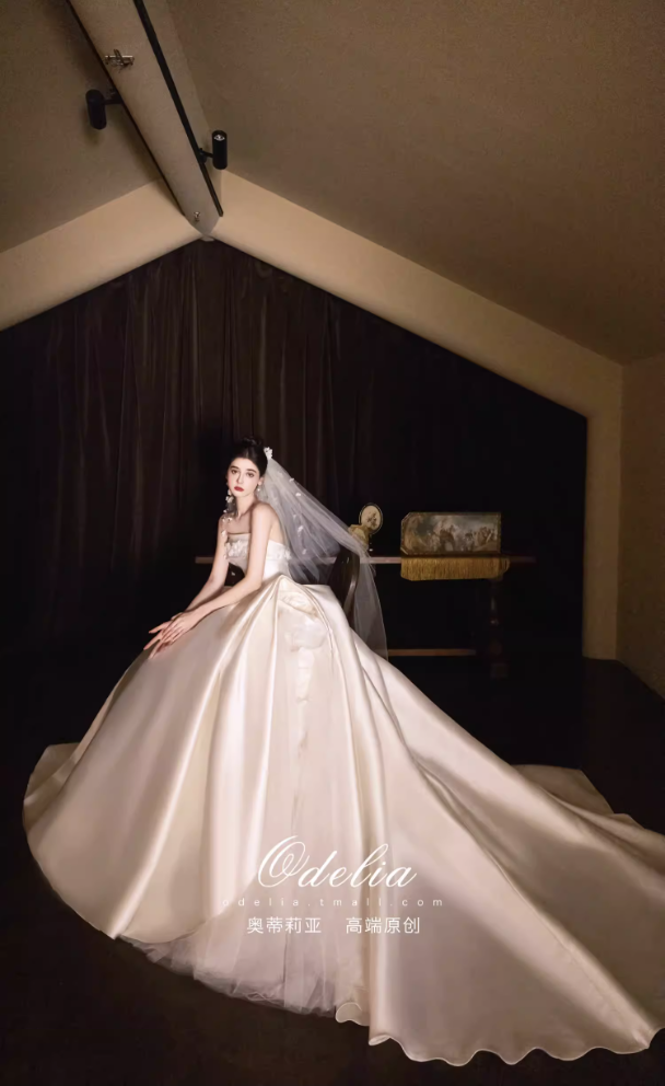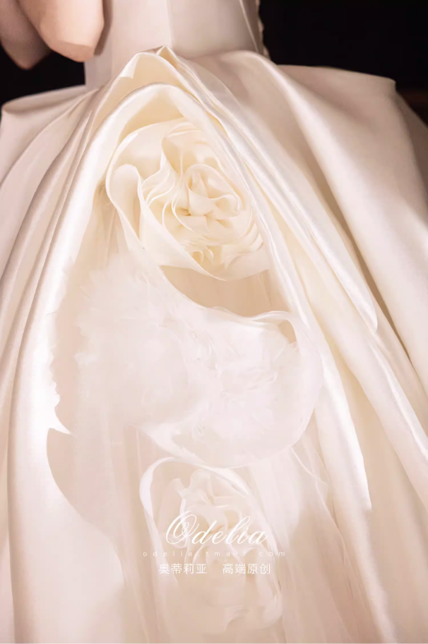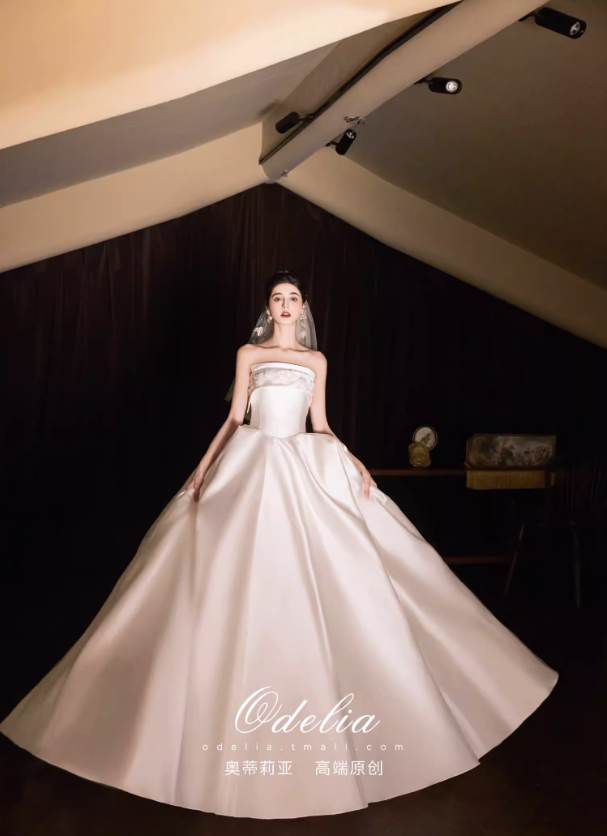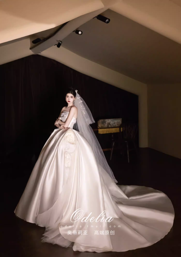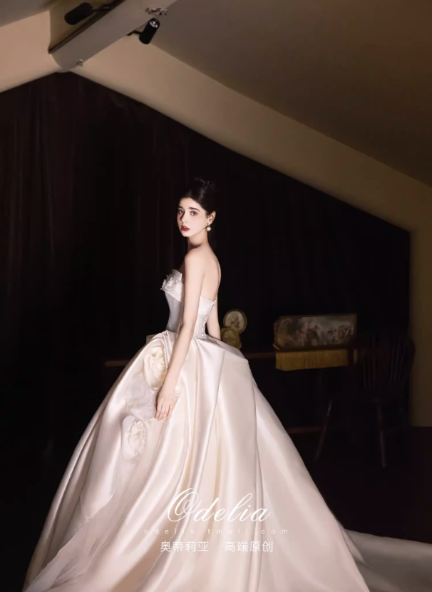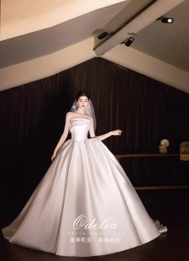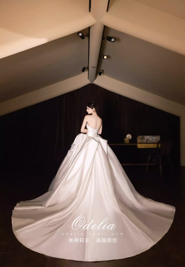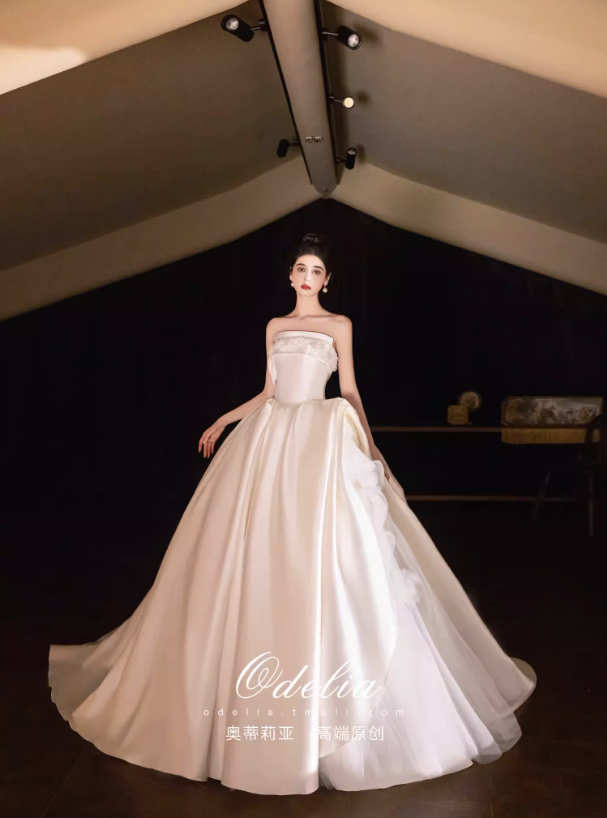 Chất liệu satin cao cấp bề mặt mịn, đứng form và tạo độ bóng nhẹ sang trọng. Phần chân váy xòe rộng kết hợp đuôi váy dài giúp tổng thể thêm phần lộng lẫy, rất phù hợp cho lễ cưới, tiệc cưới hoặc chụp ảnh cưới.