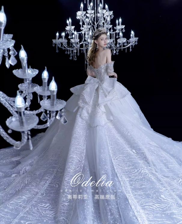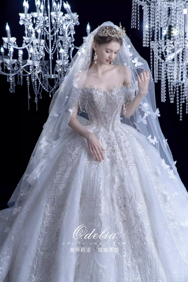 Điểm nhấn nổi bật của váy là phần cổ choker đính đá sang trọng kết hợp tay rơi mềm mại, tạo cảm giác vừa quyến rũ vừa tinh tế. Chân váy công chúa bồng xòe với lớp tulle nhiều tầng giúp váy trở nên lộng lẫy và nổi bật khi di chuyển. Thiết kế phù hợp cho lễ cưới sang trọng, chụp ảnh cưới studio hoặc concept hoàng gia.