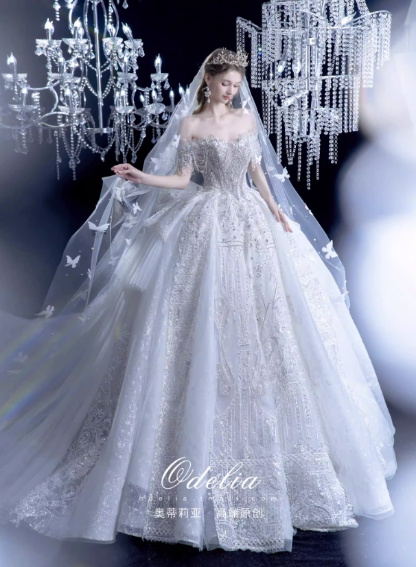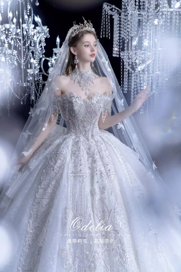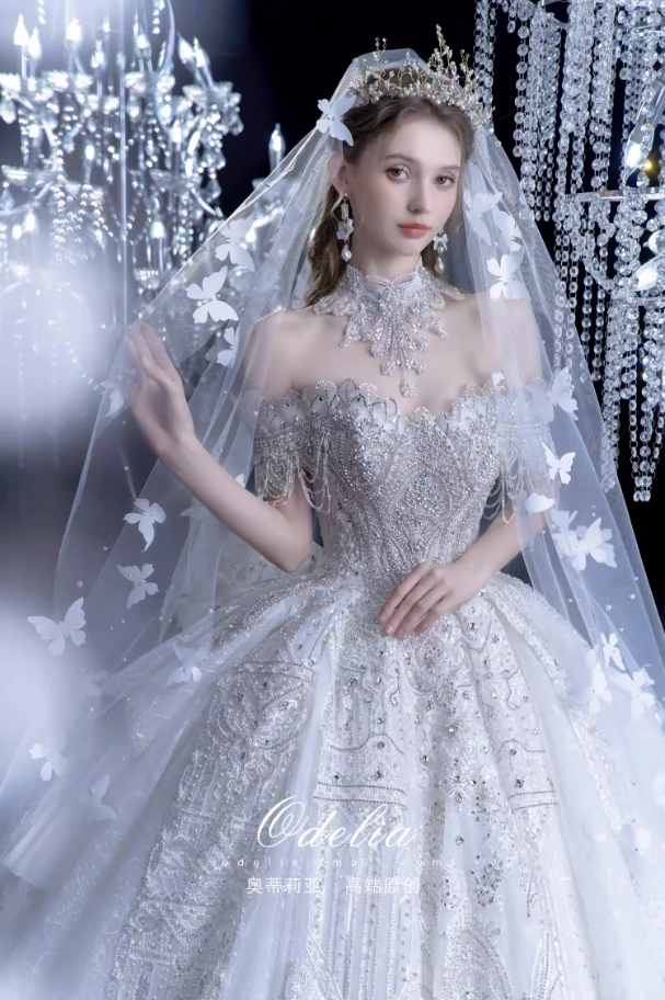 Váy cưới công chúa đính đá cao cấp mang phong cách hoàng gia sang trọng, thiết kế tinh xảo với lớp kim sa và pha lê lấp lánh trên toàn bộ thân váy. Phần thân trên ôm dáng kết hợp chi tiết đính đá tỉ mỉ giúp tôn lên vòng eo và tạo vẻ đẹp thanh lịch, quý phái cho cô dâu.