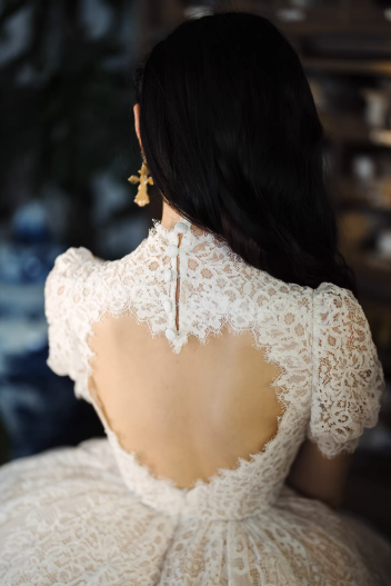 Phần cổ tim nhẹ nhàng kết hợp tay ngắn giúp tôn dáng và tạo vẻ dịu dàng, thanh lịch. Thiết kế lưng tim quyến rũ phía sau giúp chiếc váy trở nên nổi bật và cuốn hút hơn. Tùng váy xòe rộng nhiều lớp kết hợp đuôi váy dài mang lại vẻ bồng bềnh, sang trọng, rất phù hợp cho lễ cưới hoặc chụp ảnh cưới.