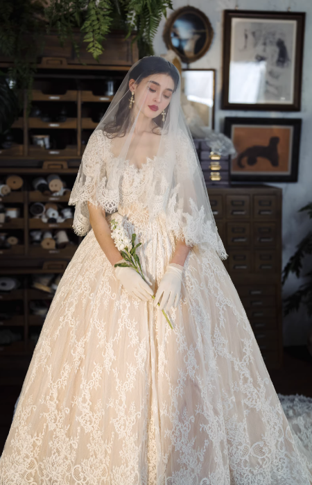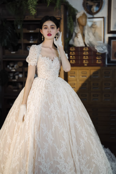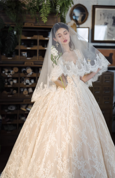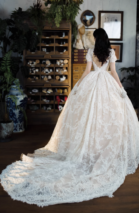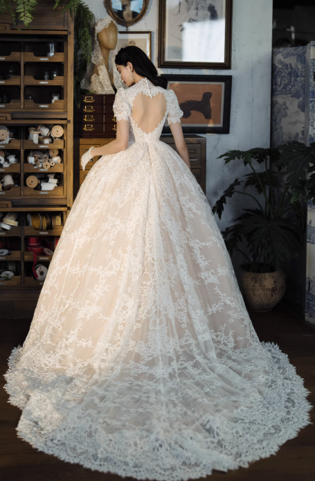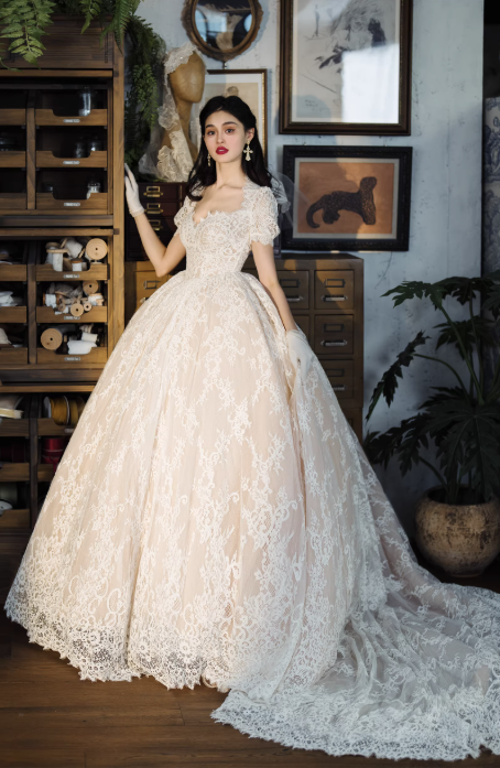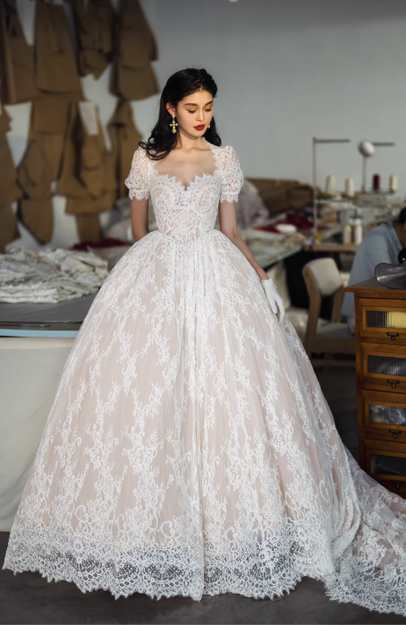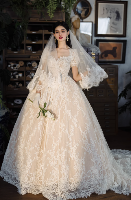 Váy cưới công chúa ren cao cấp mang phong cách cổ điển châu Âu, thiết kế dáng xòe bồng sang trọng giúp tôn lên vẻ đẹp thanh lịch và nữ tính cho cô dâu. Toàn bộ váy được phủ ren tinh xảo mềm mại, họa tiết ren nổi bật tạo cảm giác cao cấp và lộng lẫy.