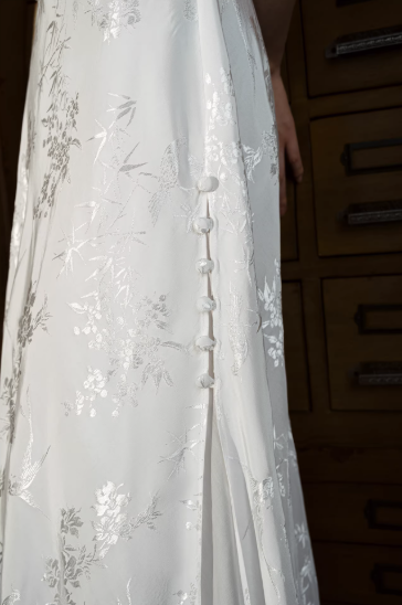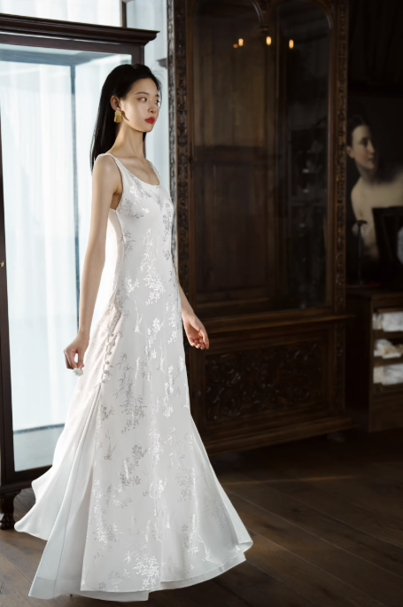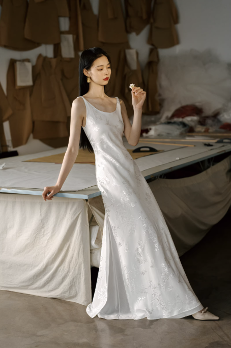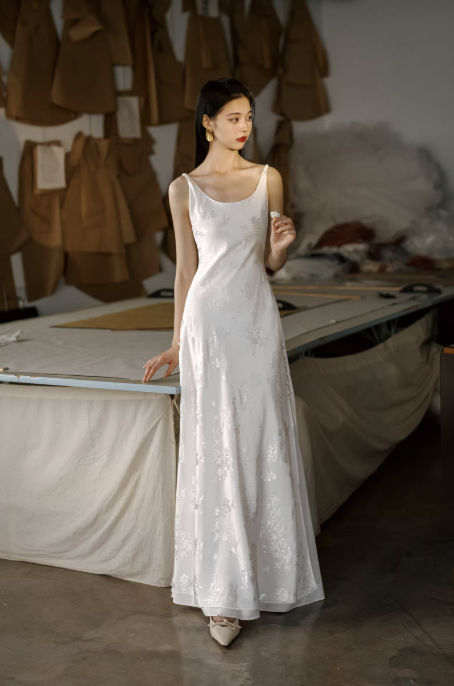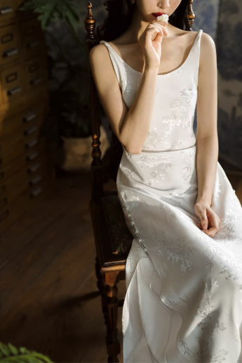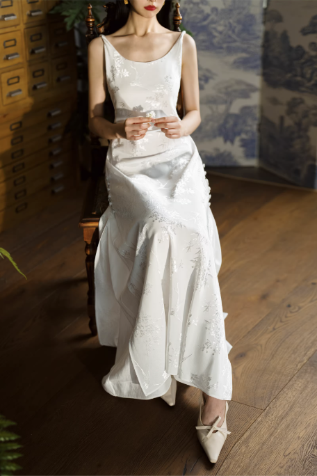 Toàn bộ váy được may từ chất liệu satin mềm mại kết hợp họa tiết thêu hoa tinh tế, tạo điểm nhấn nhẹ nhàng nhưng vẫn sang trọng. Thân váy ôm nhẹ theo dáng người, sau đó xòe mềm xuống chân váy giúp tôn dáng và tạo sự thướt tha khi di chuyển.