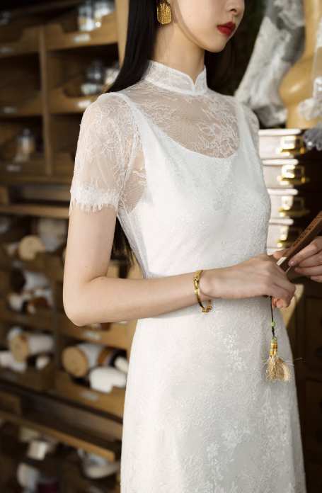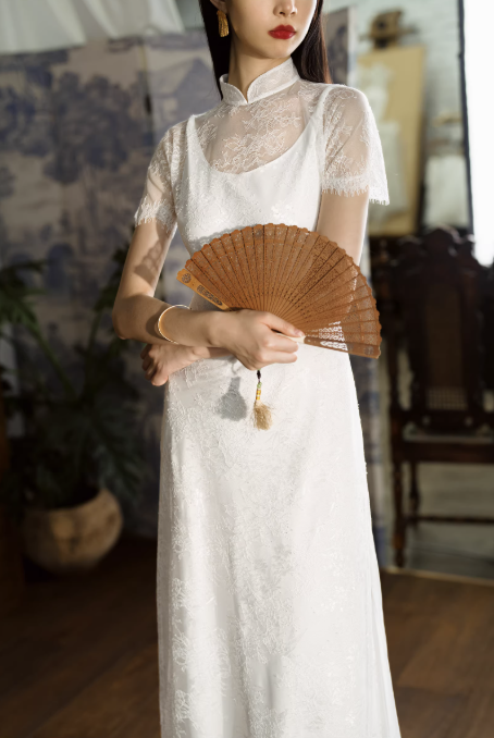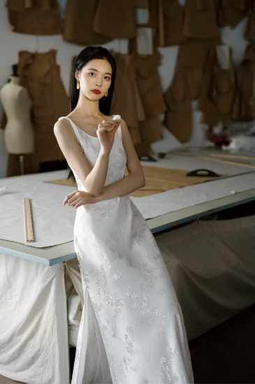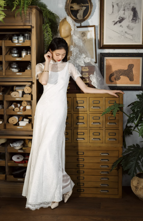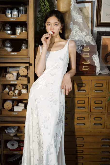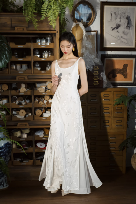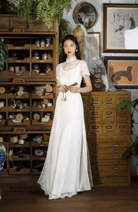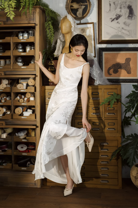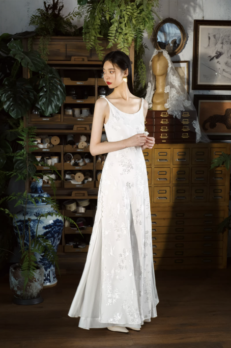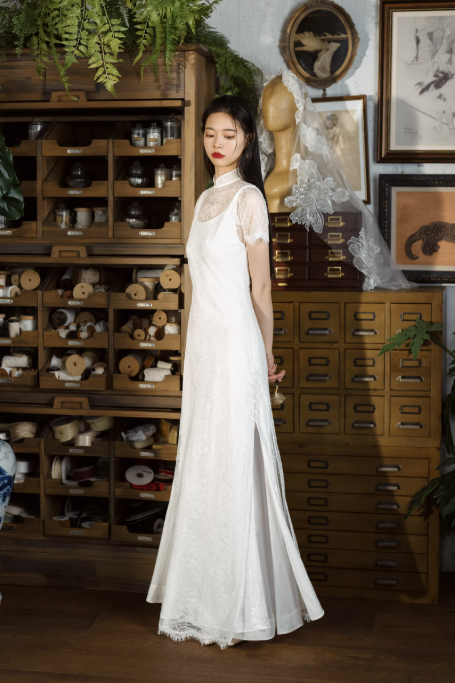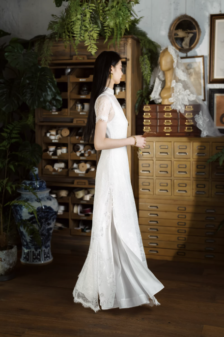 Thiết kế dáng dài đơn giản, dễ mặc và phù hợp với nhiều phong cách lễ cưới như tiệc cưới ngoài trời, chụp ảnh cưới hoặc lễ cưới phong cách vintage, tối giản.