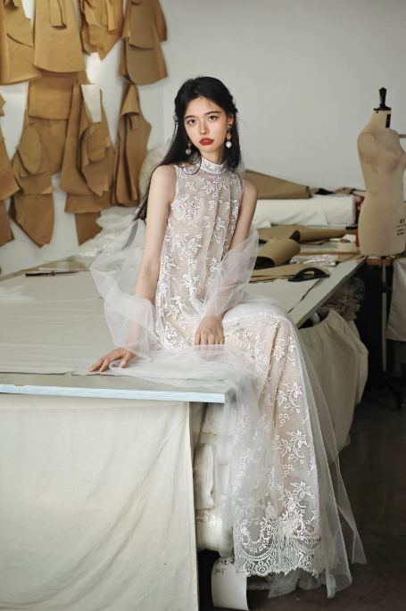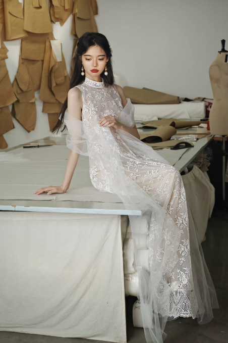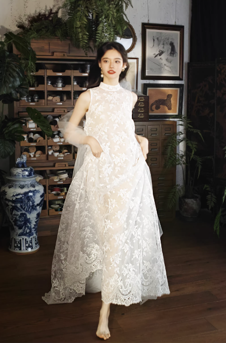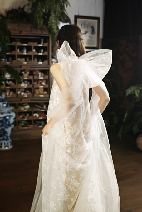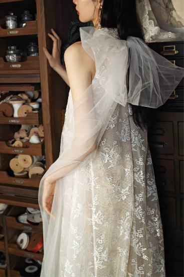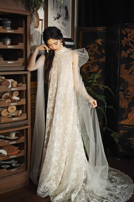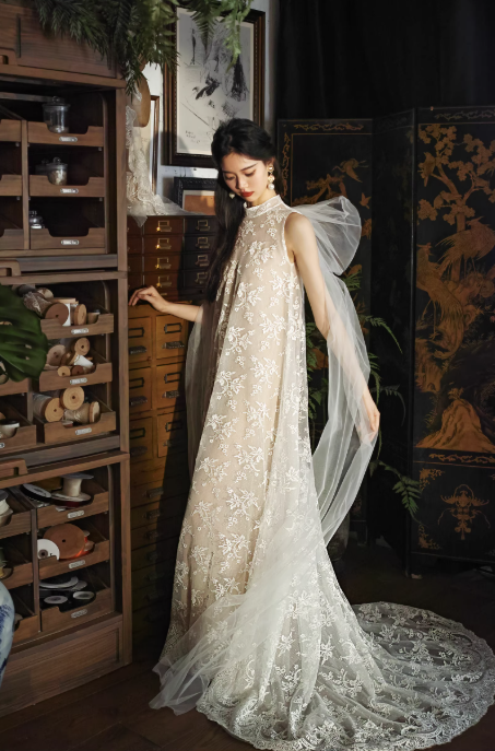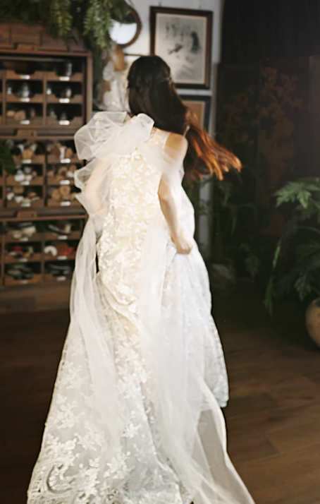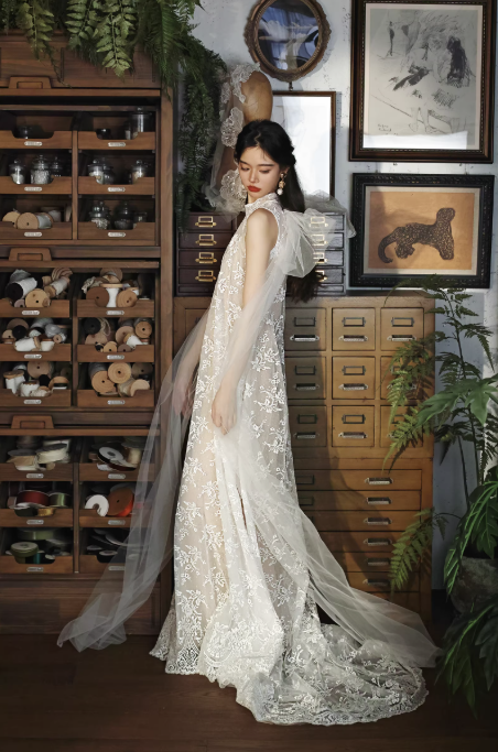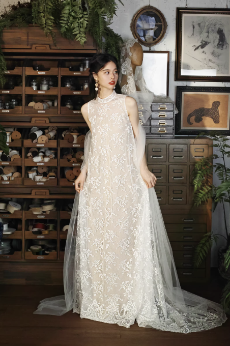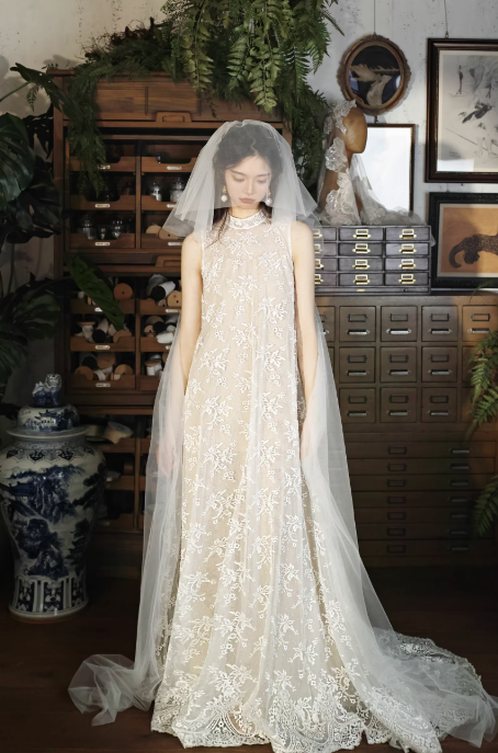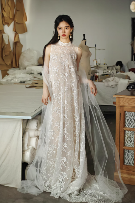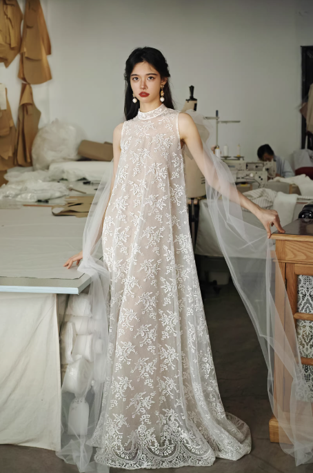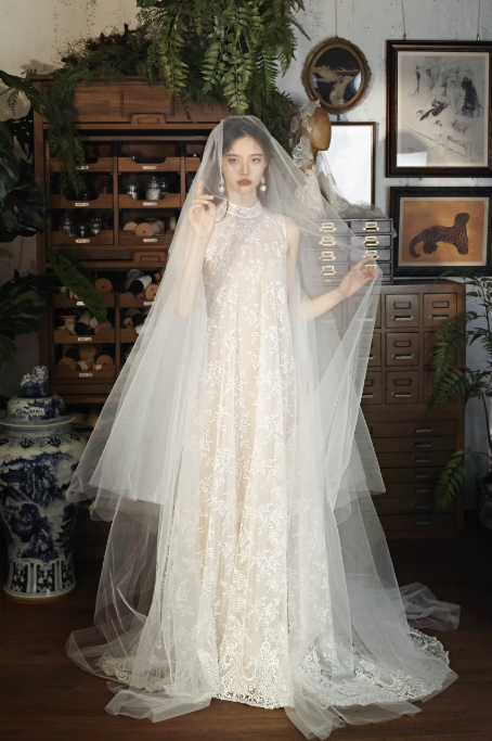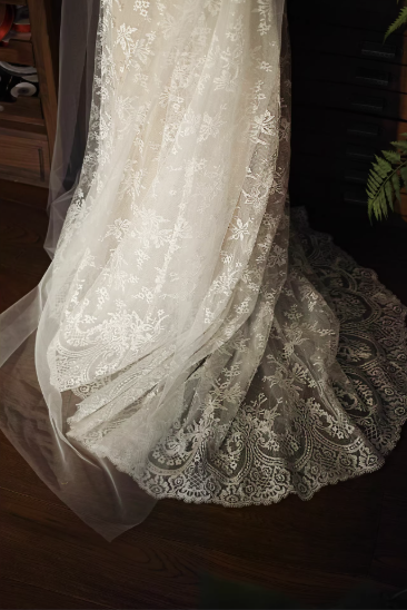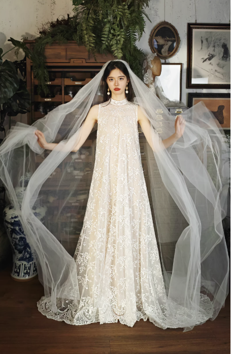 Thiết kế váy cưới dáng suông nhẹ nhàng mang phong cách thanh lịch và tối giản, lớp ren phủ toàn thân tạo cảm giác mềm...