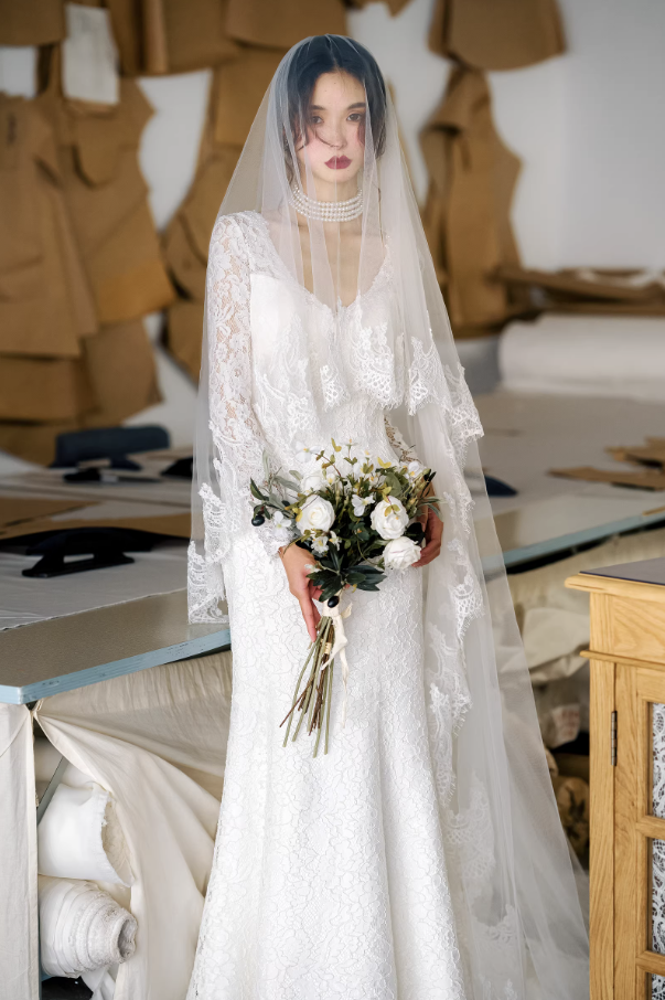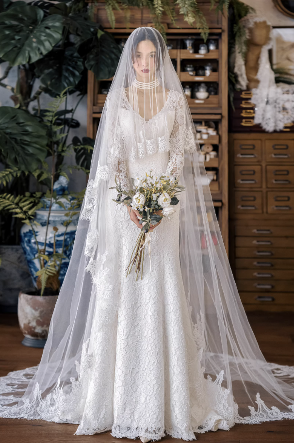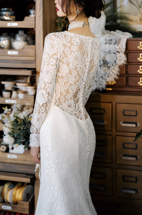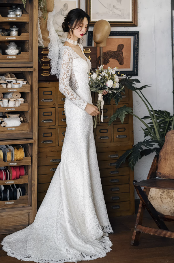 Chất liệu ren mềm mại, co giãn nhẹ giúp váy ôm dáng nhưng vẫn thoải mái khi di chuyển. Thiết kế phù hợp cho lễ cưới, chụp ảnh cưới, studio hoặc phong cách cô dâu cổ điển, sang trọng.