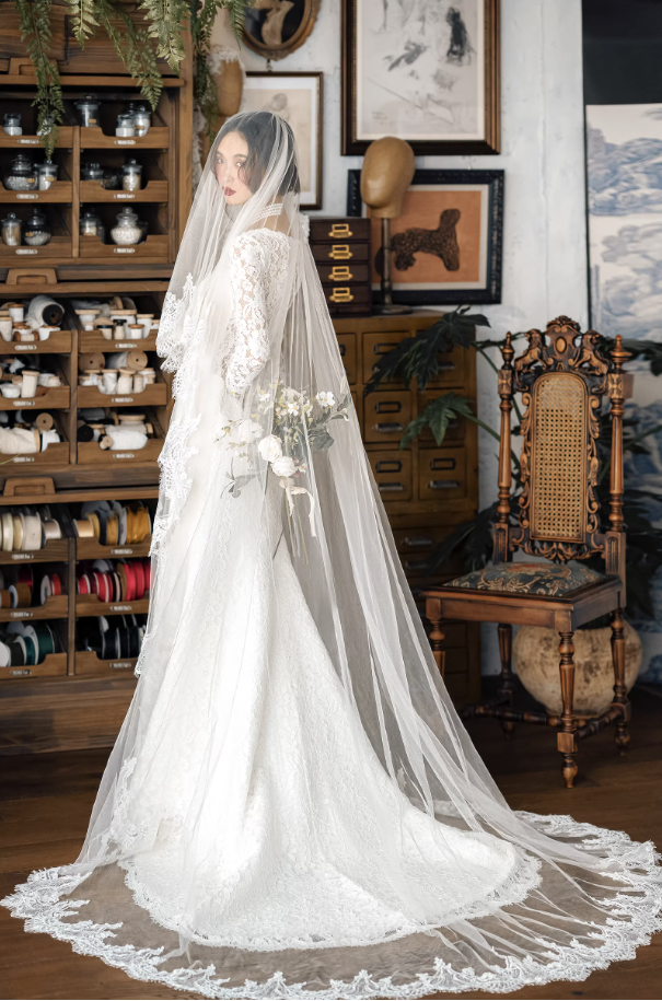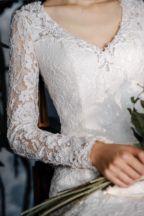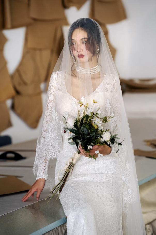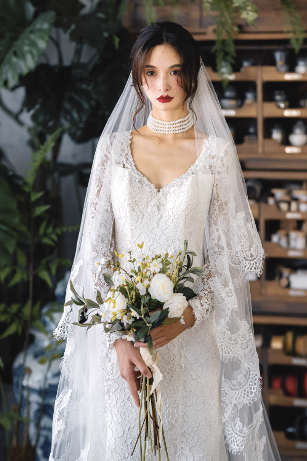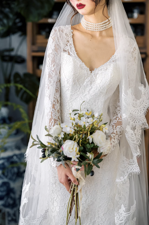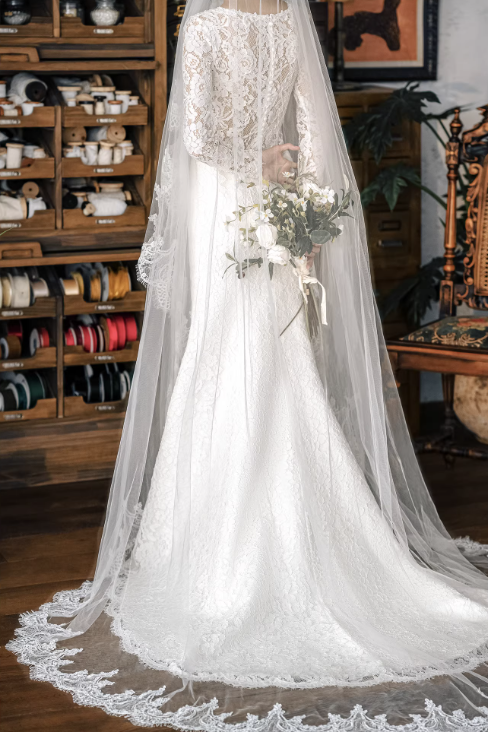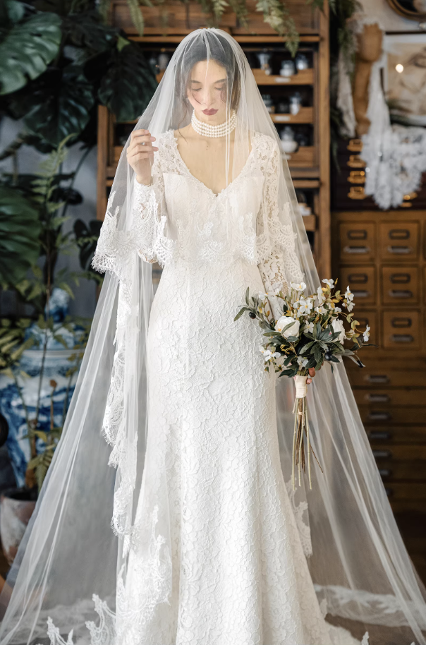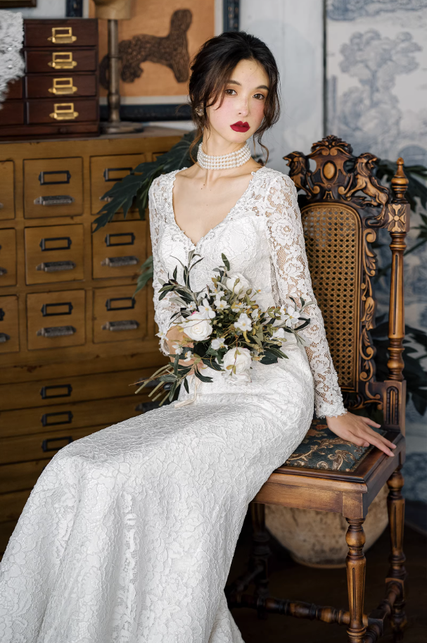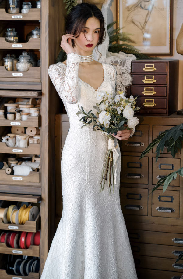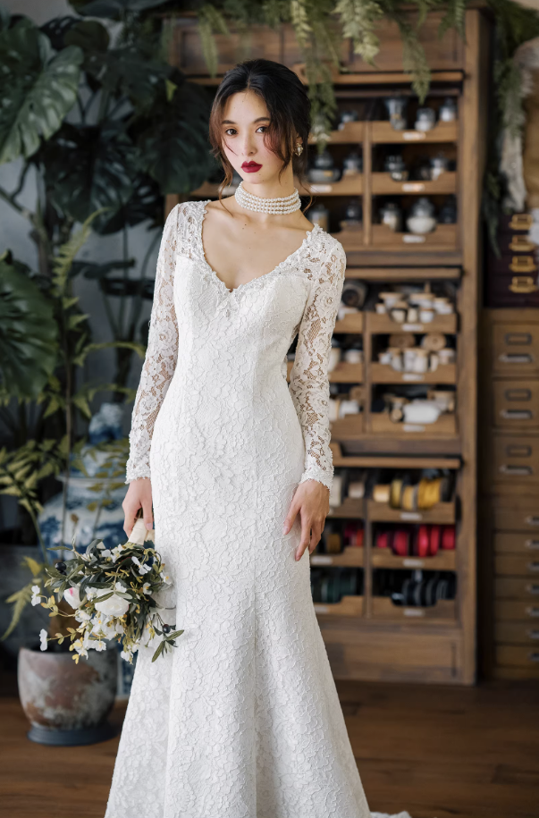 Váy cưới ren đuôi cá tay dài mang phong cách cổ điển thanh lịch, thiết kế ôm dáng giúp tôn lên đường cong mềm mại của cô dâu. Toàn bộ váy được phủ ren cao cấp với họa tiết tinh xảo, tạo cảm giác sang trọng và nữ tính.