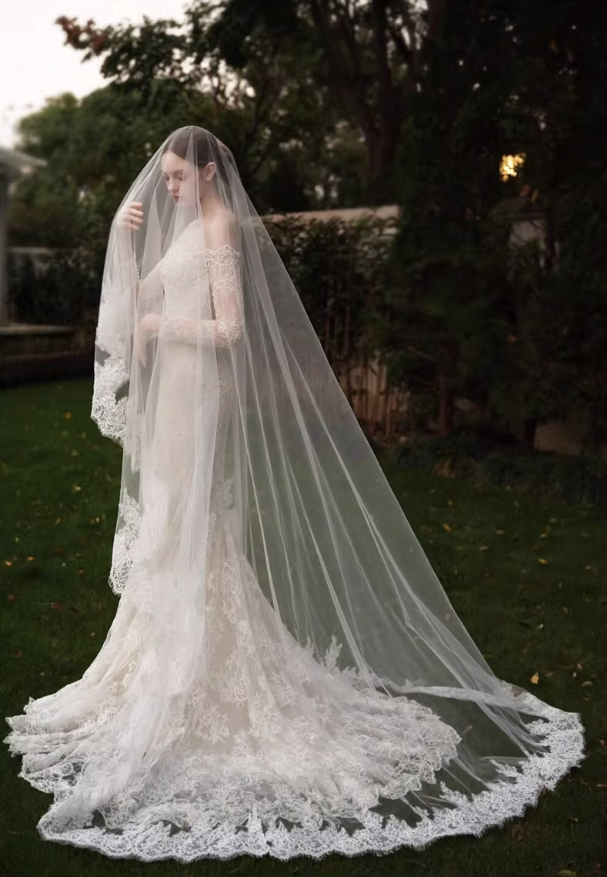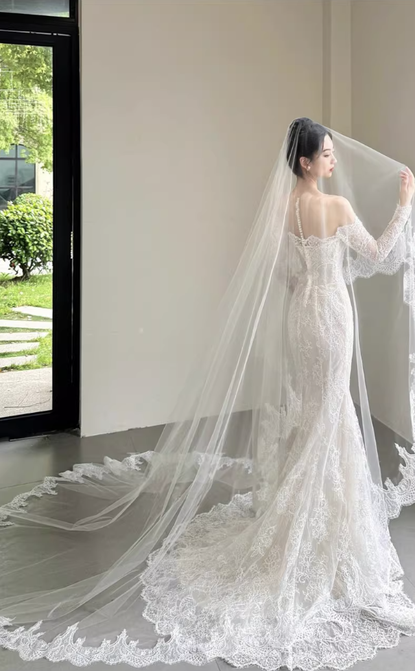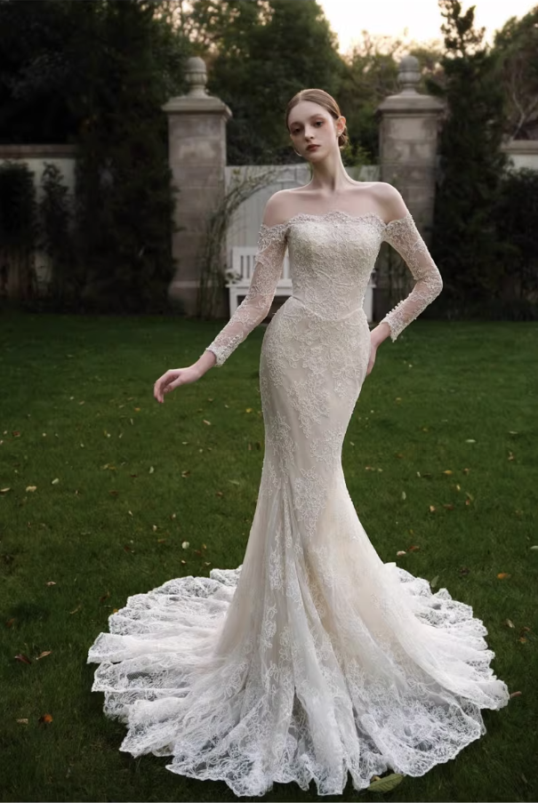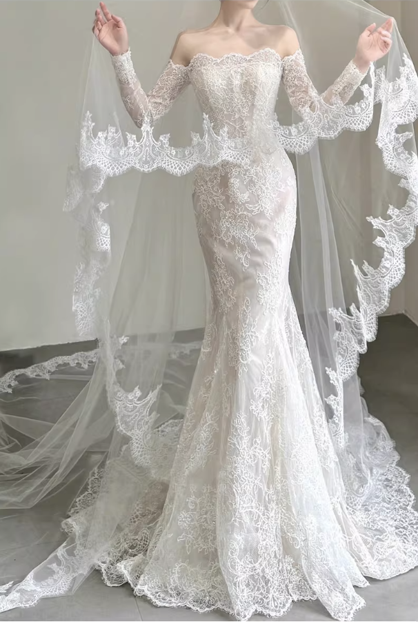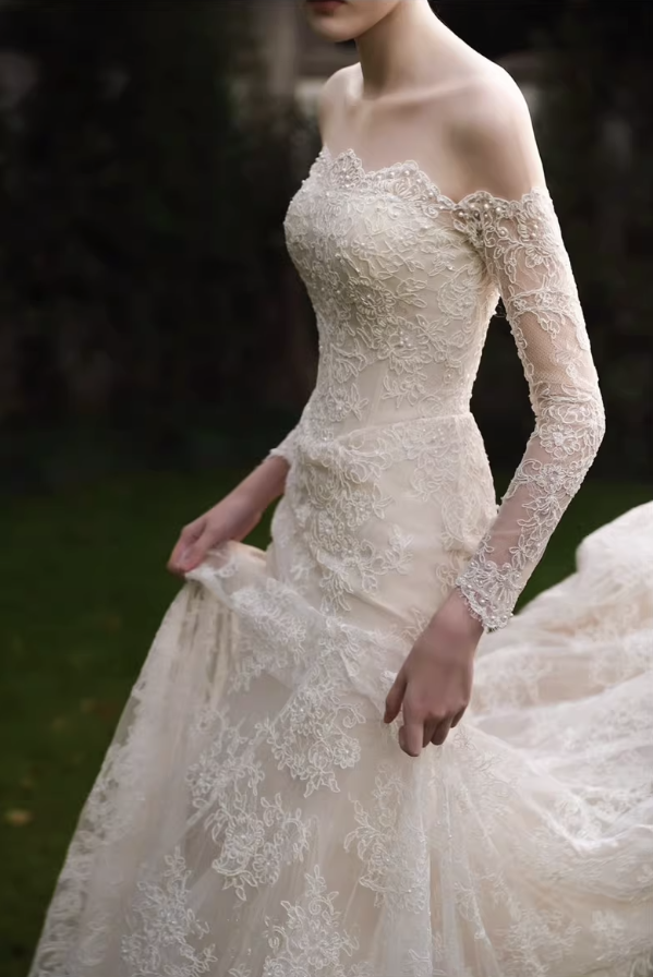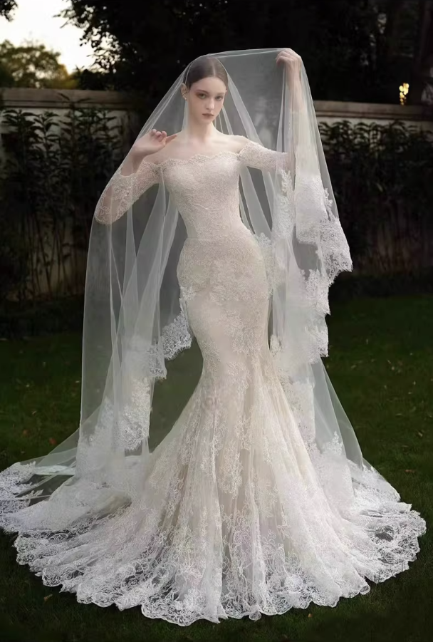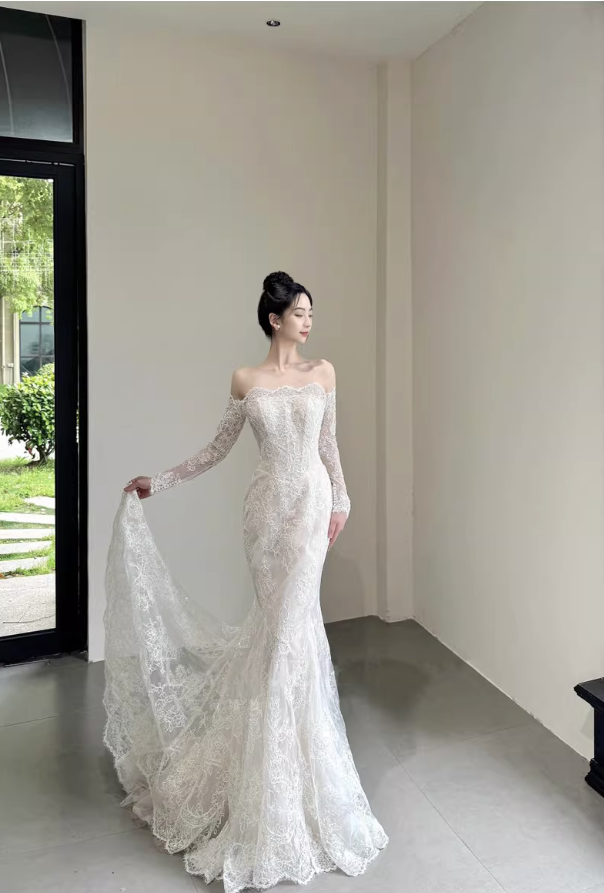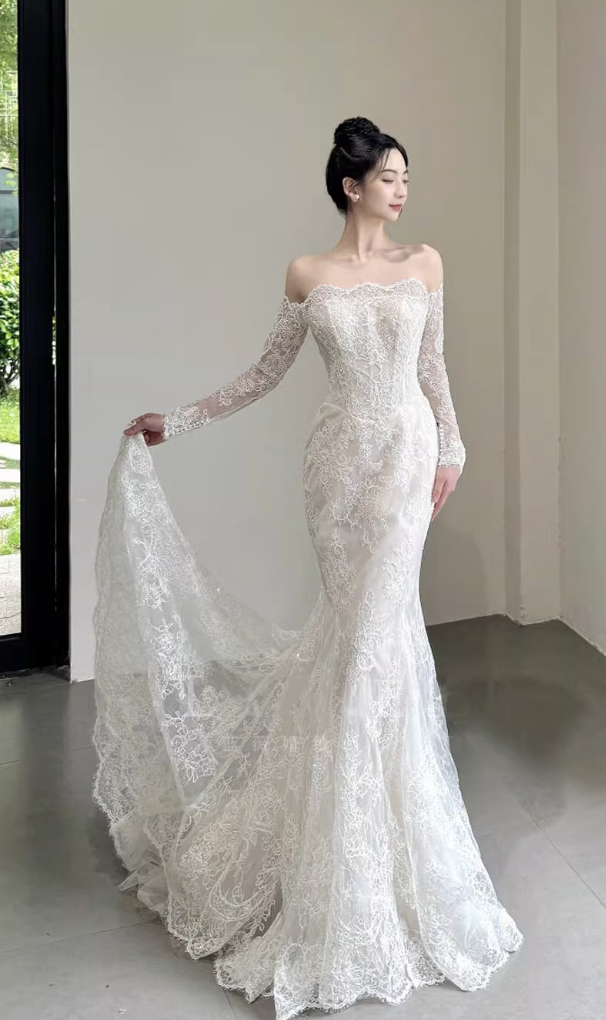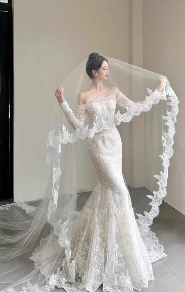 Váy cưới ren đuôi cá vai ngang sang trọng_I01