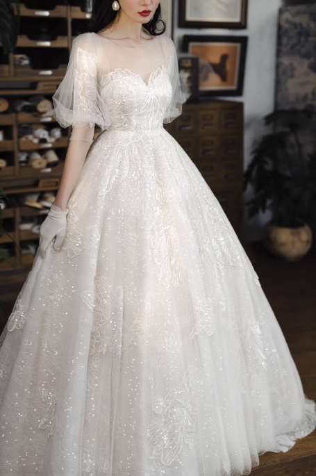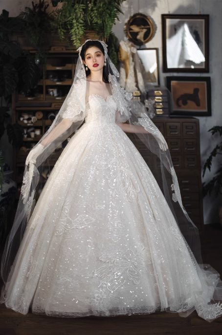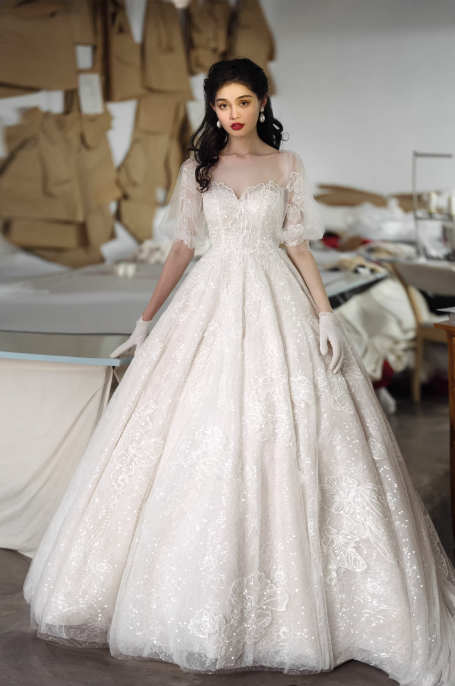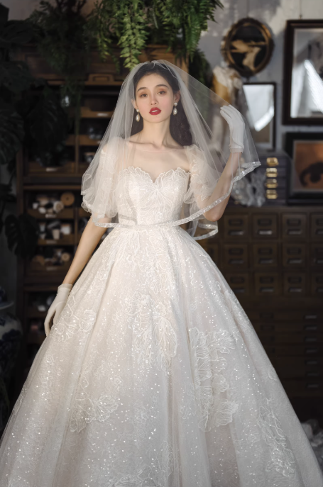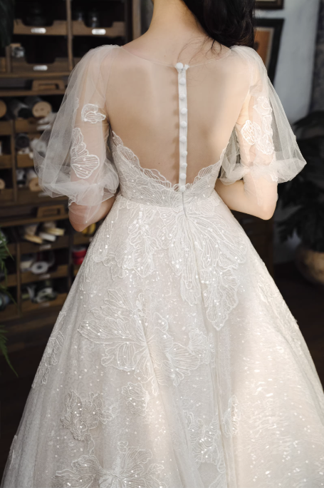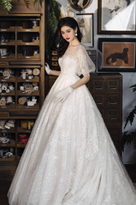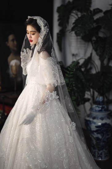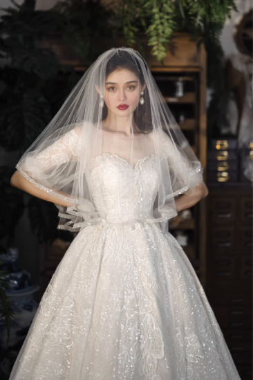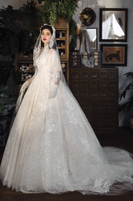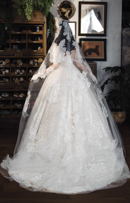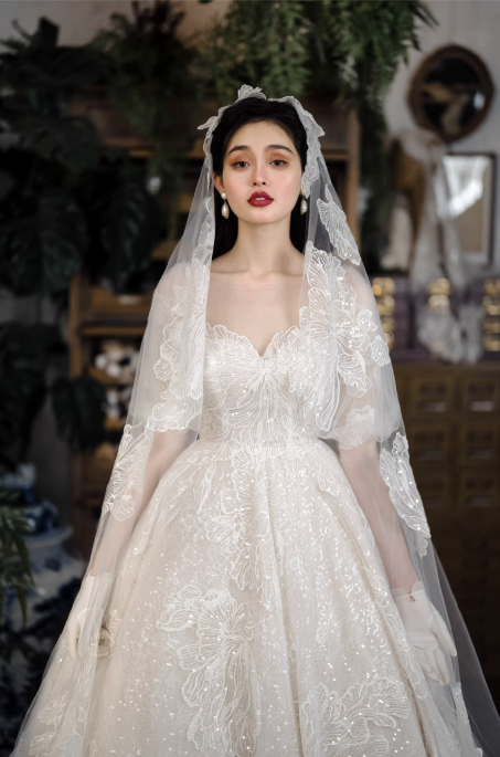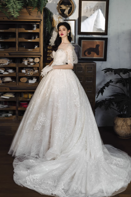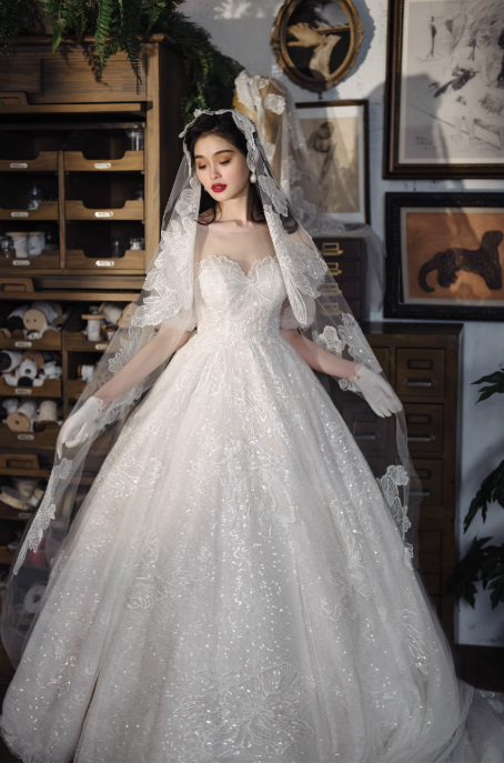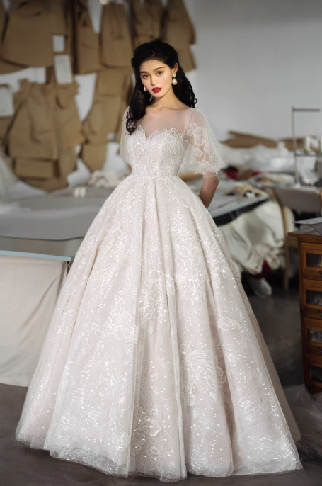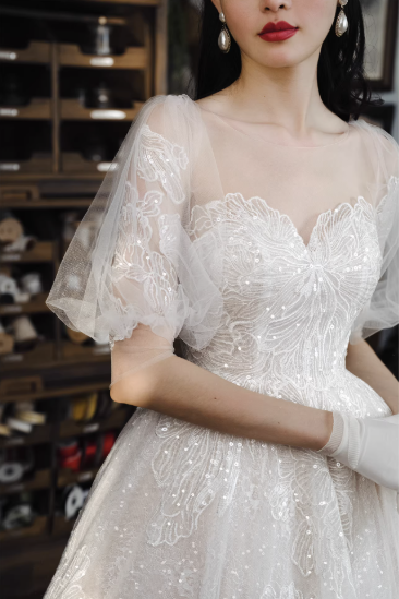 Thiết kế váy cưới dáng công chúa với phần thân ren tinh xảo kết hợp lớp voan mềm phủ ngoài tạo hiệu ứng lấp lánh nhẹ nhàng khi di chuyển. Form váy xoè lớn giúp tôn vòng eo và mang lại tổng thể bồng bềnh, nổi bật trong ngày cưới.
