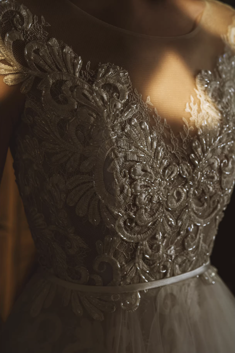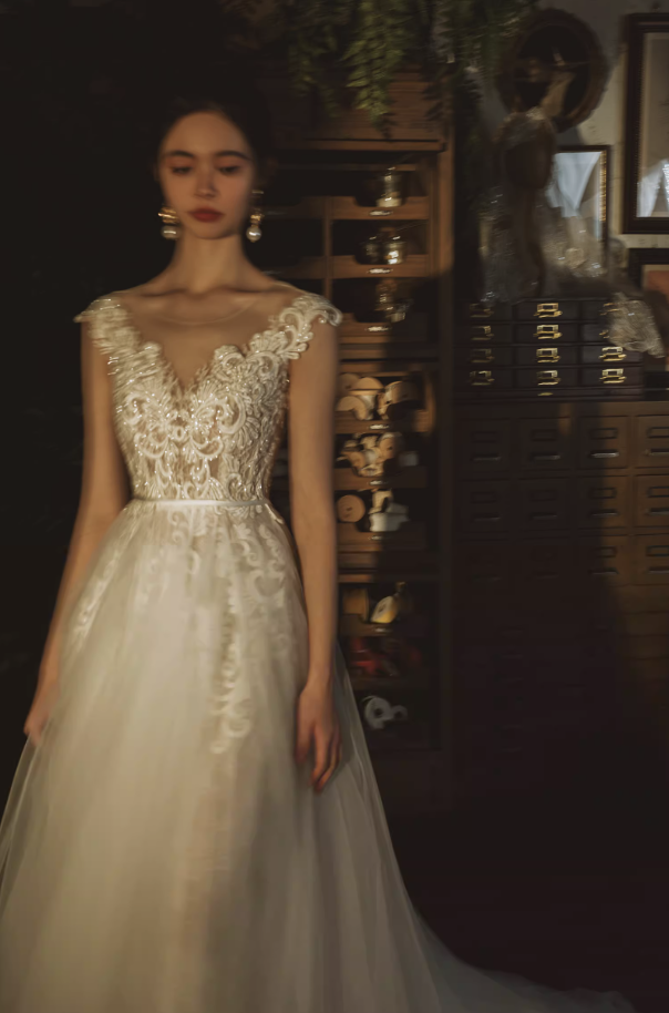 Mẫu váy cưới mang phong cách thanh lịch và sang trọng, nổi bật với thiết kế ren tinh xảo kết hợp dáng váy công chúa bồng nhẹ. Phần cổ V mềm mại giúp tôn lên đường cổ và xương quai xanh thanh thoát, mang lại vẻ đẹp nữ tính và tinh tế cho cô dâu.