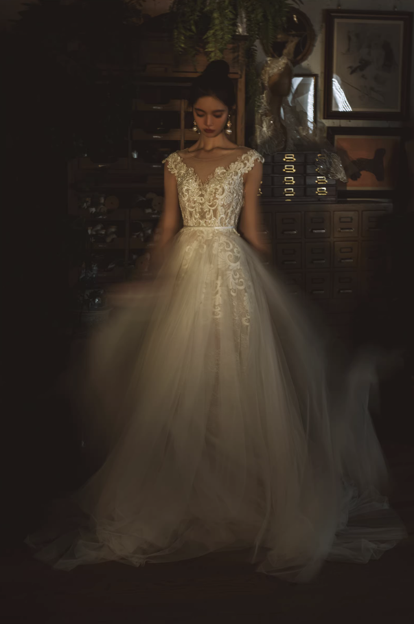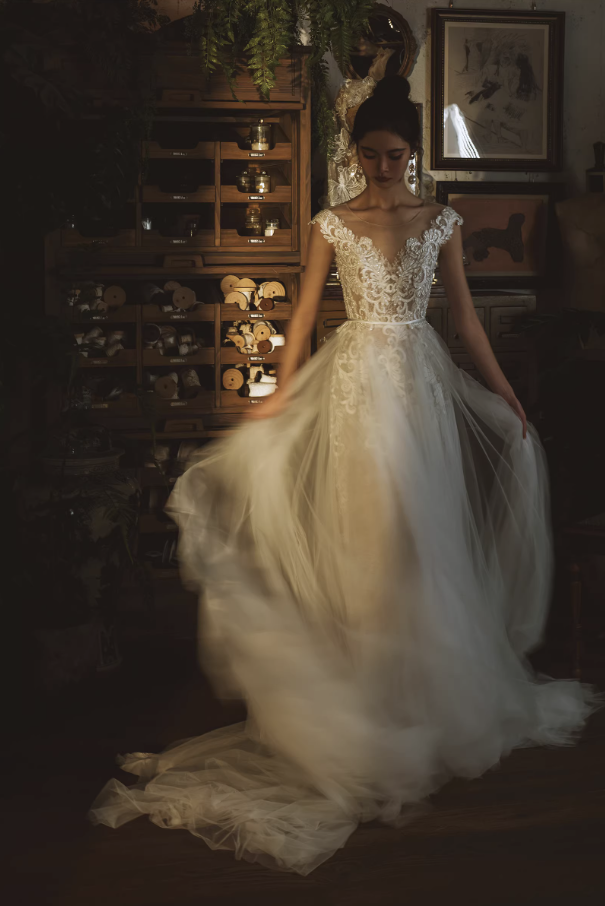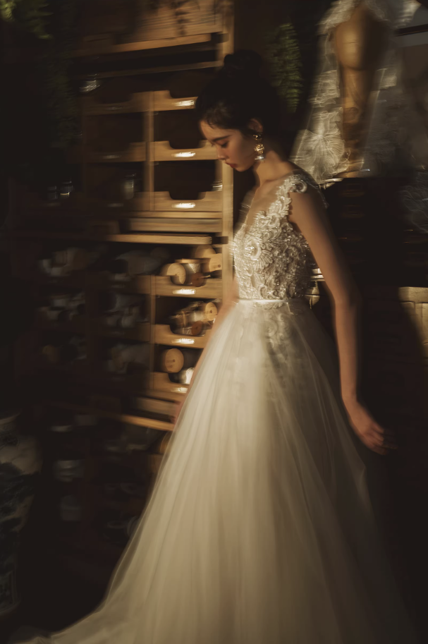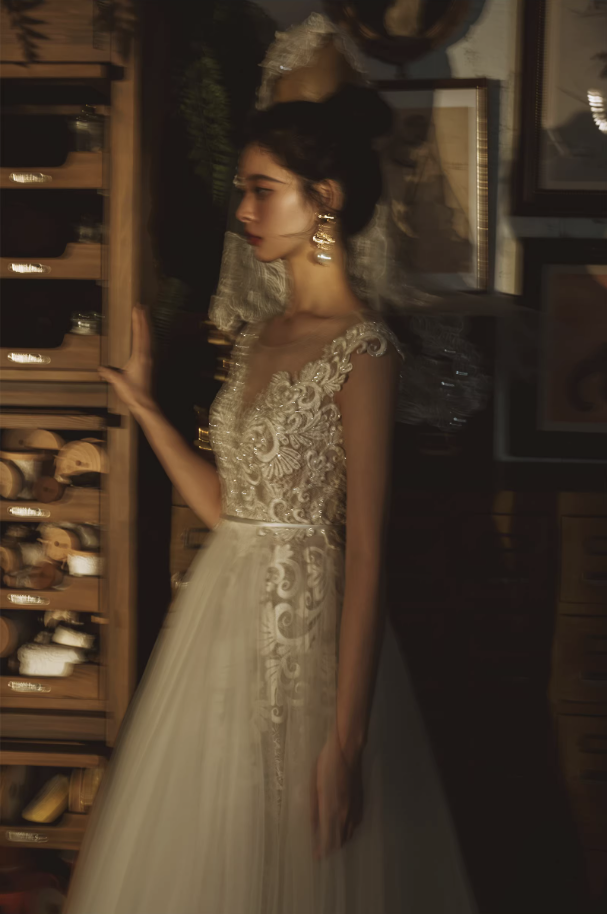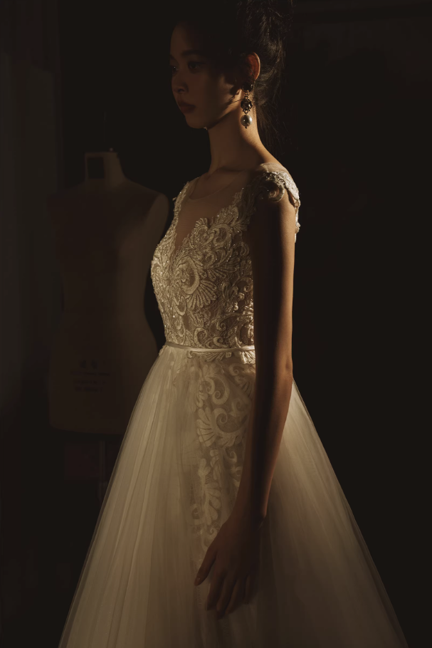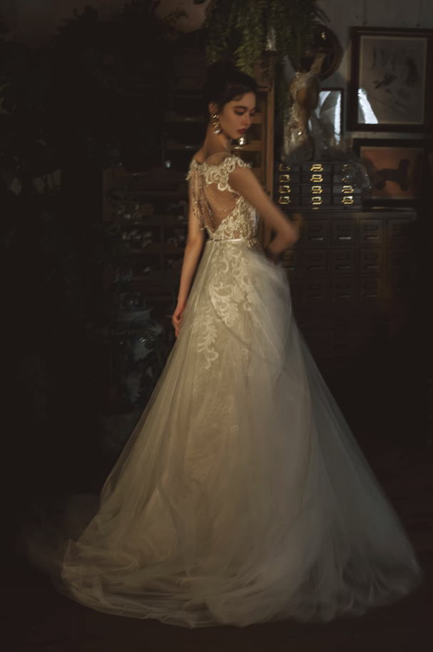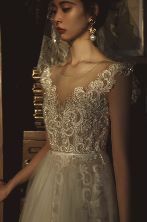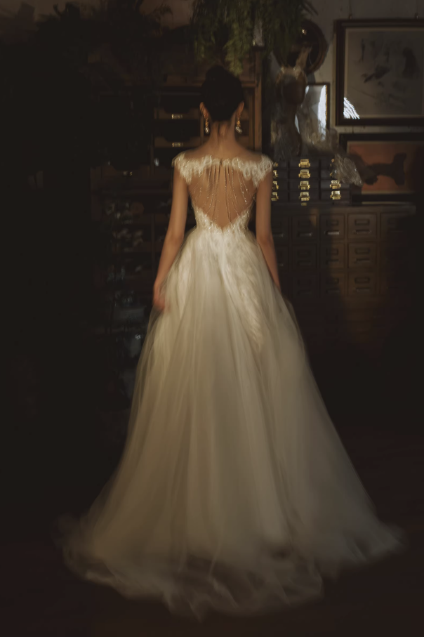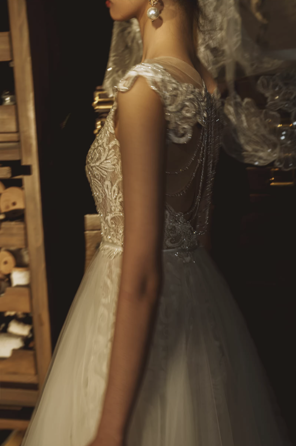Chân váy nhiều lớp voan mềm mại tạo độ bồng nhẹ, giúp tổng thể chiếc váy trở nên lộng lẫy nhưng vẫn giữ được sự thanh thoát. Thiết kế phù hợp cho lễ cưới, tiệc cưới hoặc chụp ảnh cưới phong cách cổ điển, sang trọng.