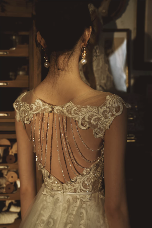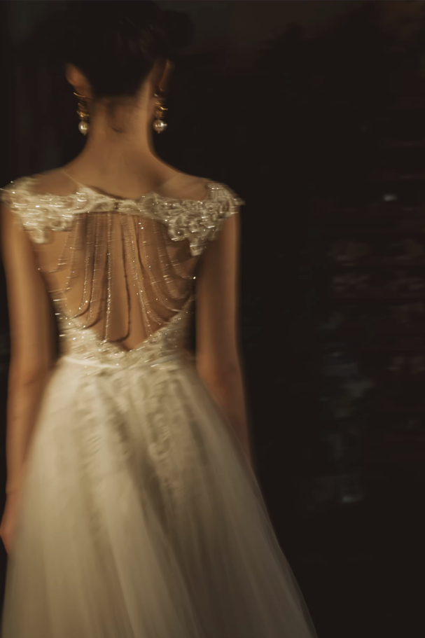 Thân váy được trang trí họa tiết ren thêu tinh xảo, ôm nhẹ phần eo giúp tôn dáng và tạo đường nét mềm mại. Điểm nhấn đặc biệt nằm ở thiết kế lưng hở kết hợp lớp voan trong suốt đính họa tiết và chi tiết trang trí ánh kim, tạo hiệu ứng lấp lánh và nổi bật khi di chuyển.