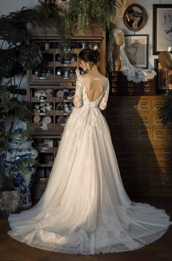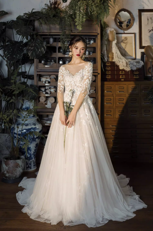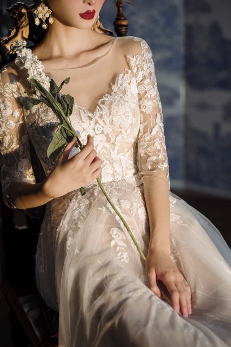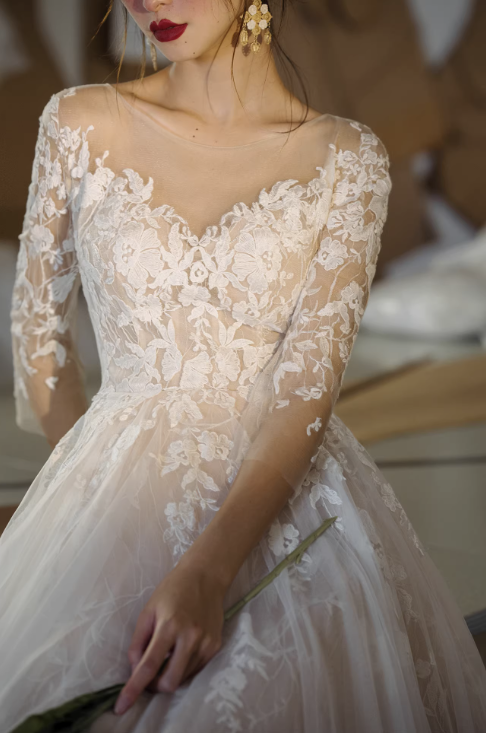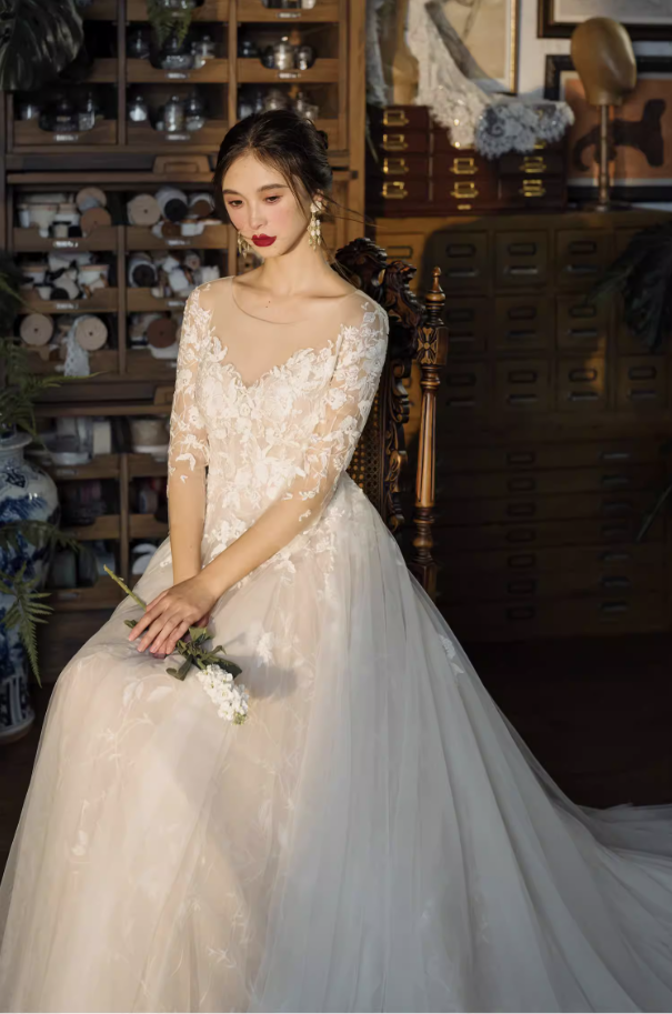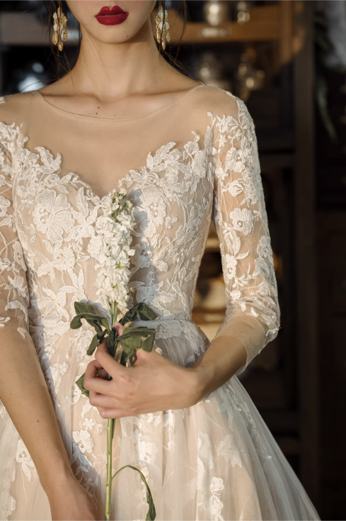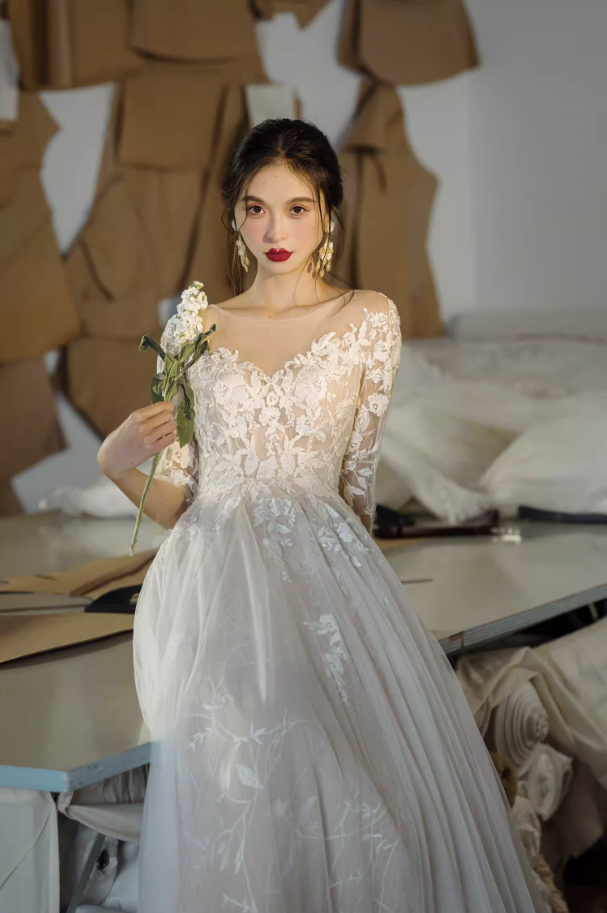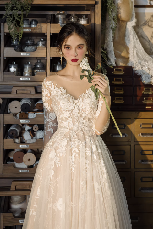 Mẫu váy cưới mang phong cách sang trọng và lãng mạn, nổi bật với thiết kế ren tinh xảo kết hợp dáng váy công chúa bồng nhẹ. Phần cổ được thiết kế dạng cổ thuyền mềm mại giúp tôn lên đường cổ và bờ vai thanh thoát, mang lại vẻ đẹp nữ tính và tinh tế cho cô dâu.