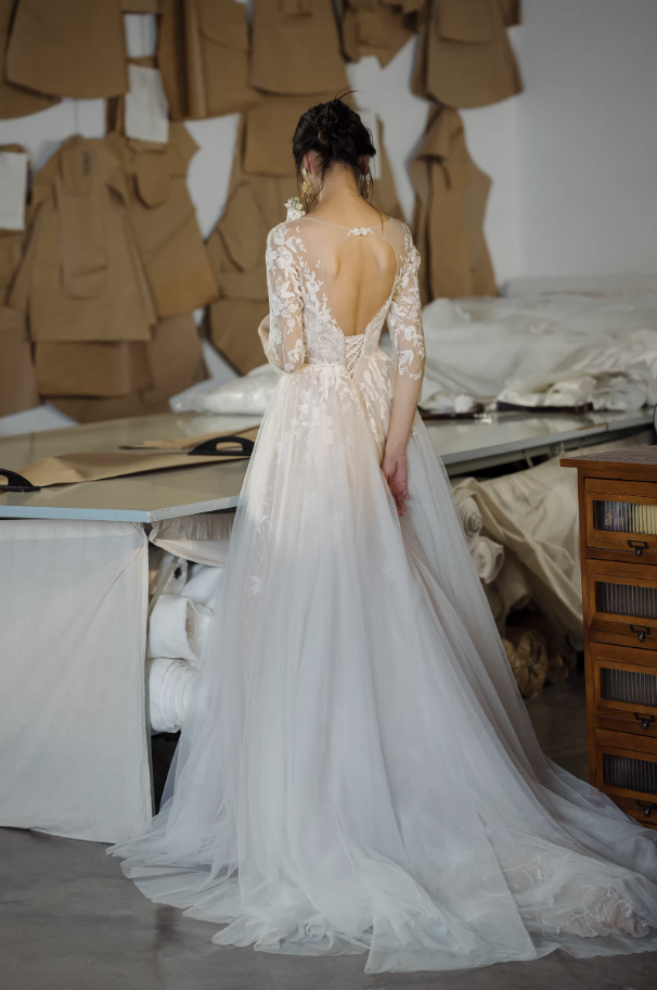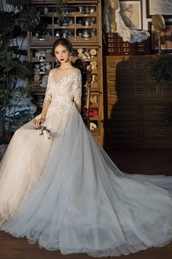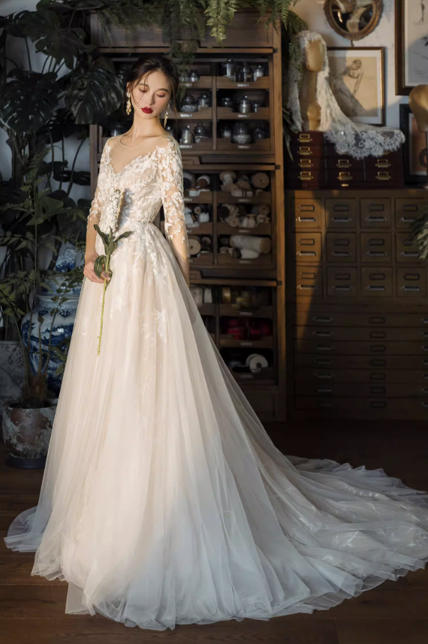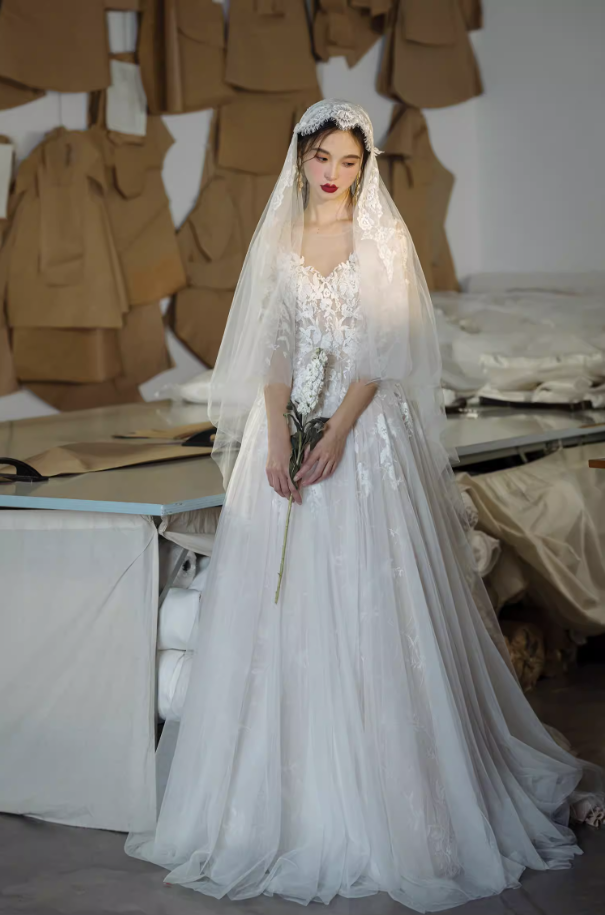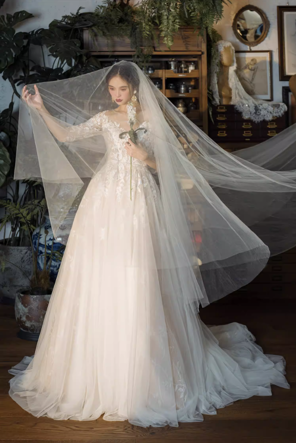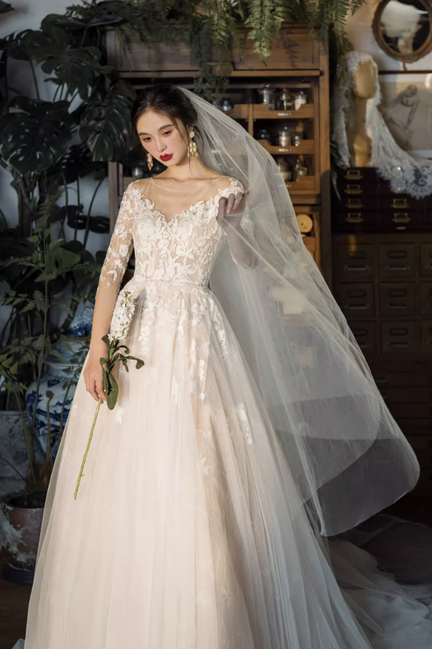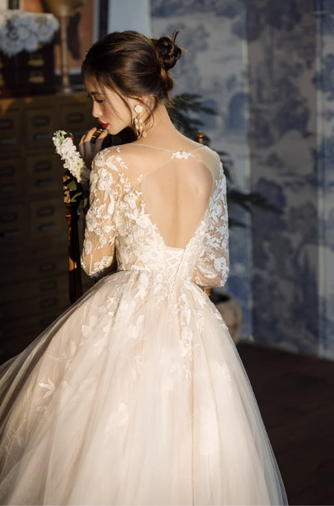 Chân váy nhiều lớp voan mềm mại tạo độ bồng tự nhiên, giúp chiếc váy trở nên lộng lẫy nhưng vẫn nhẹ nhàng khi di chuyển. Thiết kế phù hợp cho lễ cưới, tiệc cưới hoặc chụp ảnh cưới theo phong cách cổ điển, sang trọng.
