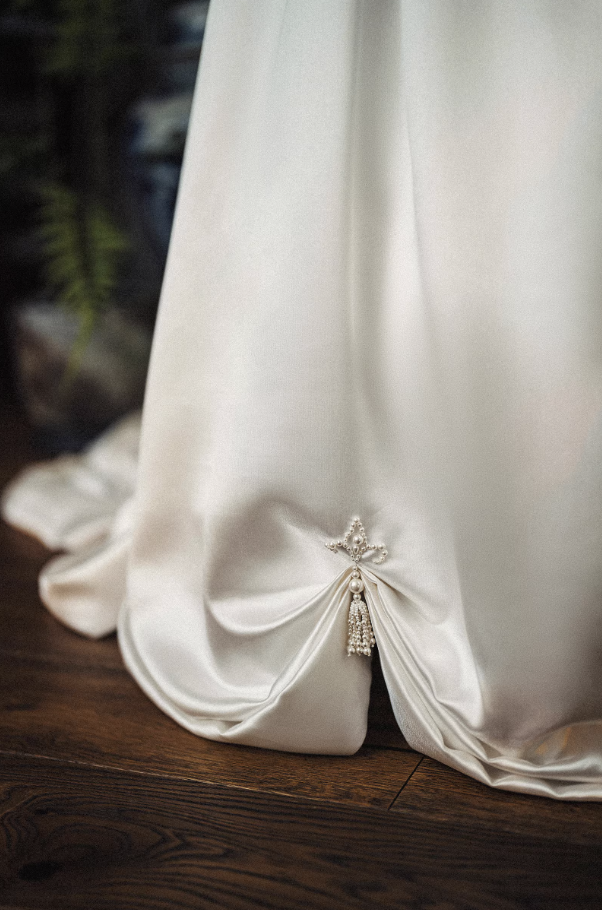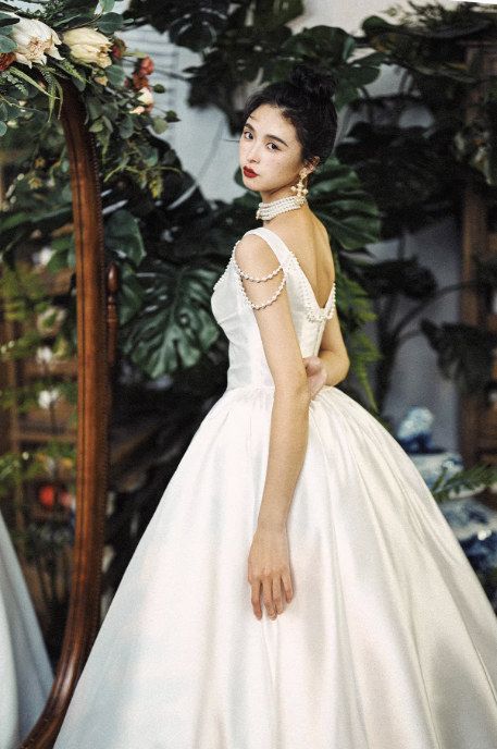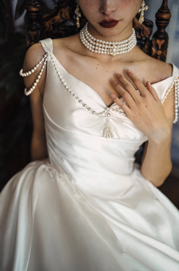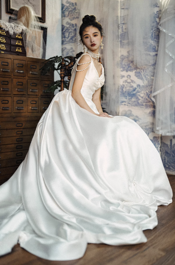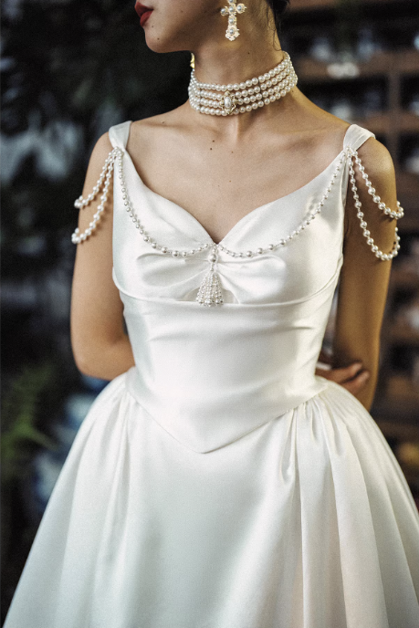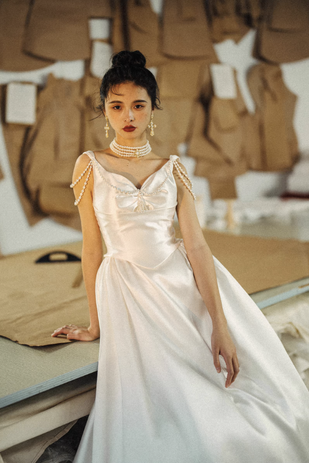 Điểm nhấn đặc biệt của chiếc váy là các chi tiết đính ngọc trai tinh tế ở phần vai và thân áo, mang lại vẻ đẹp sang trọng và nổi bật. Chất liệu satin cao cấp giúp bề mặt váy có độ bóng nhẹ, rủ mềm và tạo cảm giác cao cấp.